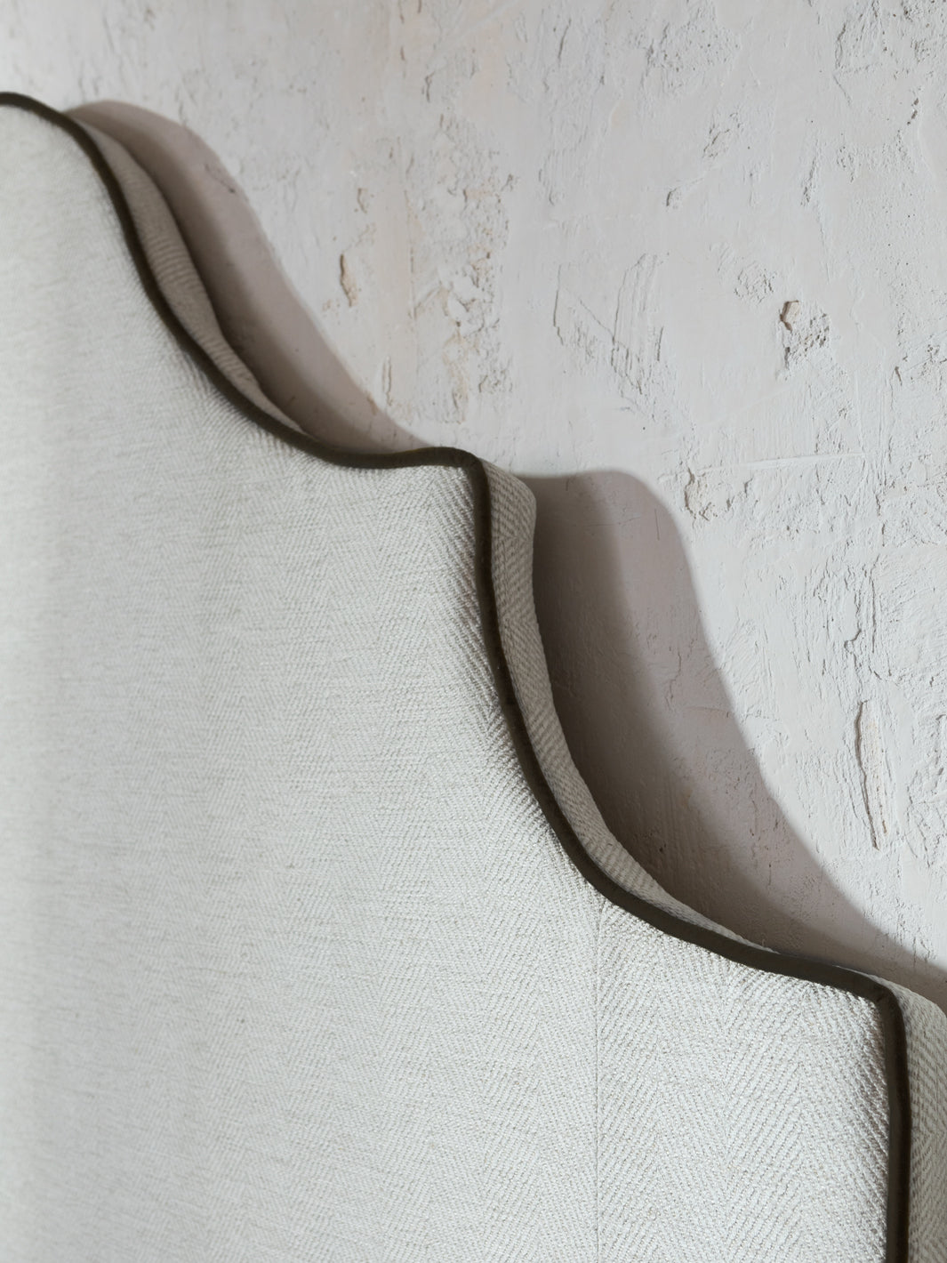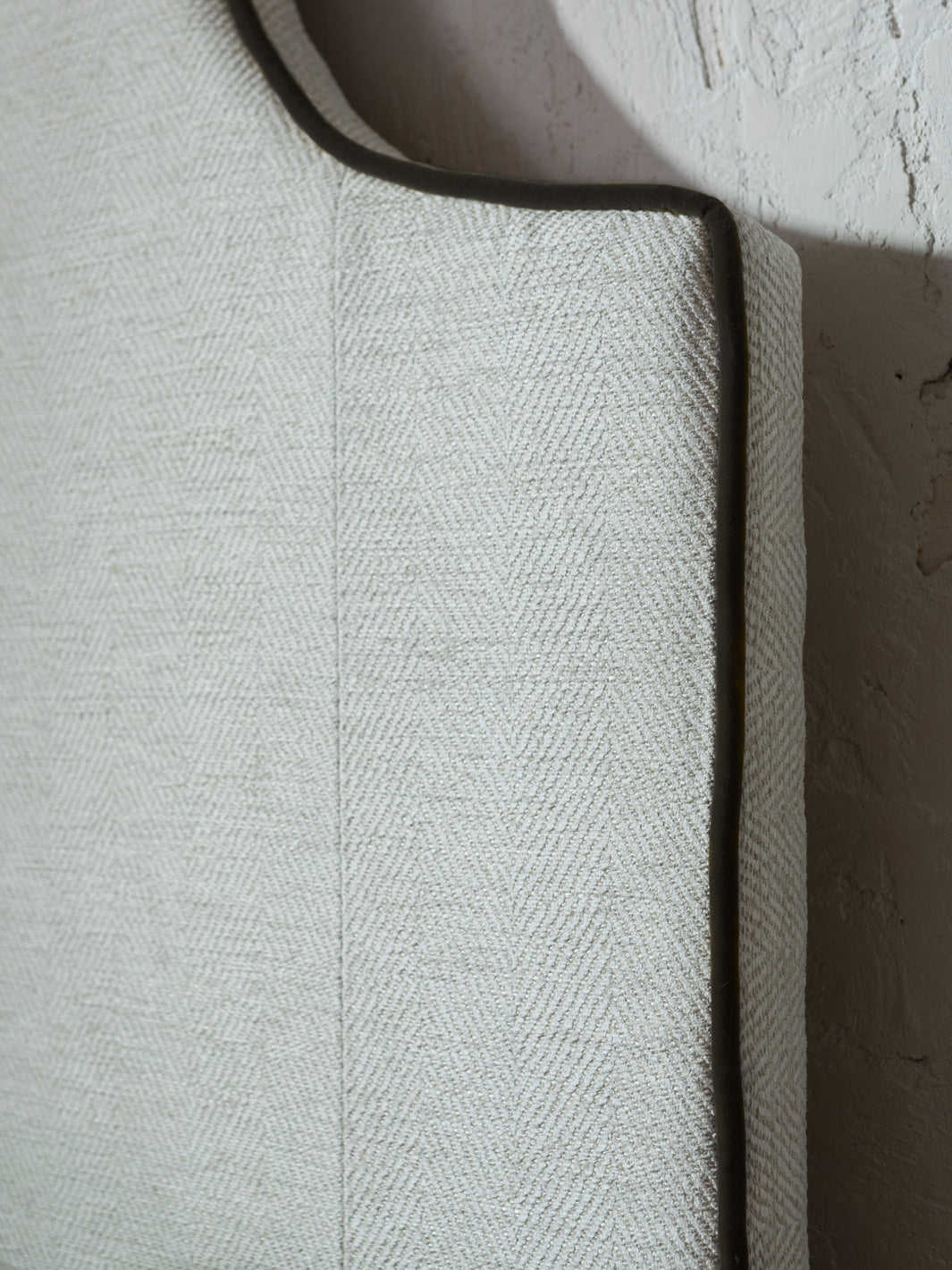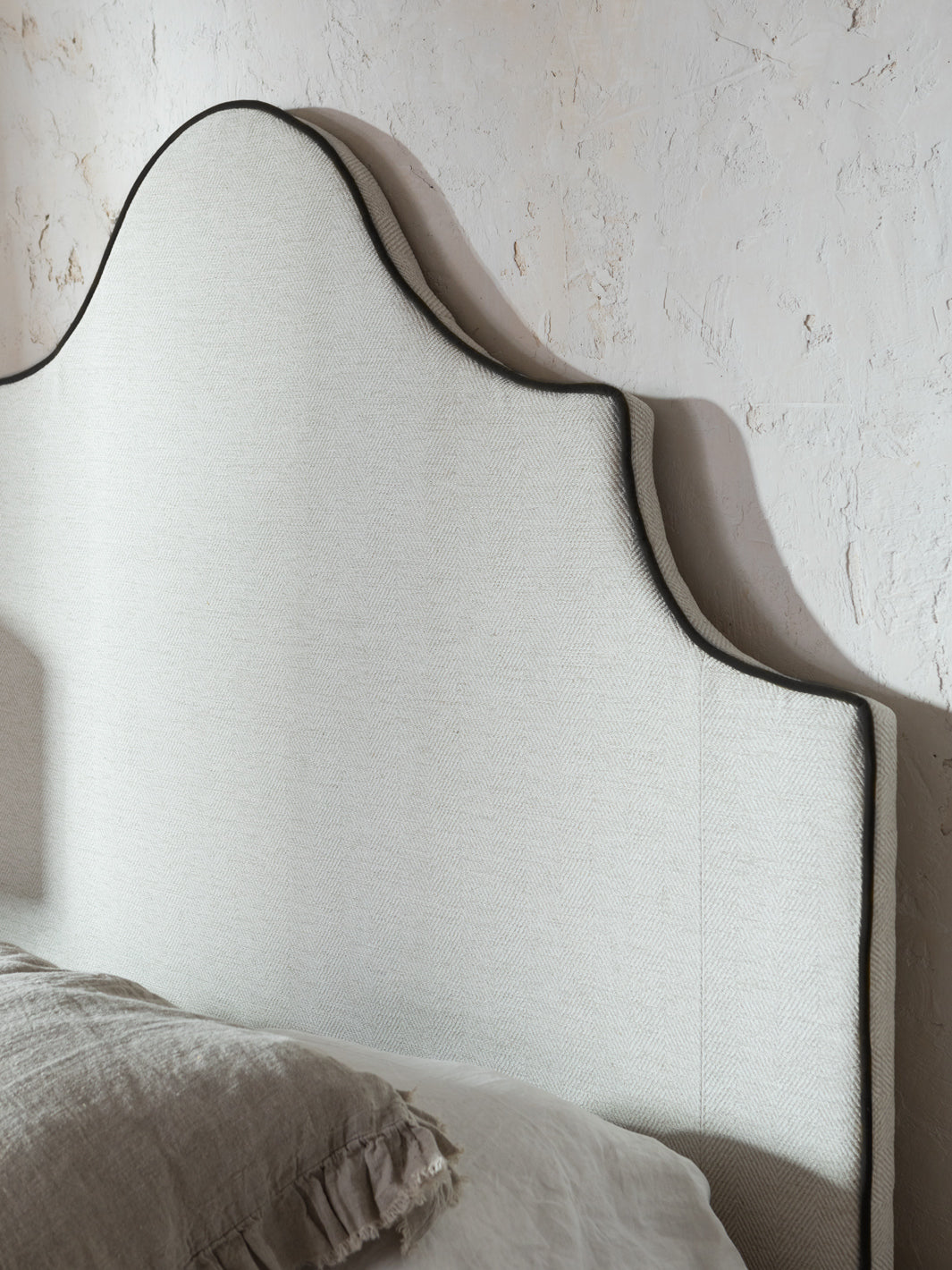 Romy headboard upholstered with linen and cotton herringbone in ecru and vivid black cotton velvet, it is ready to hang on the wall.