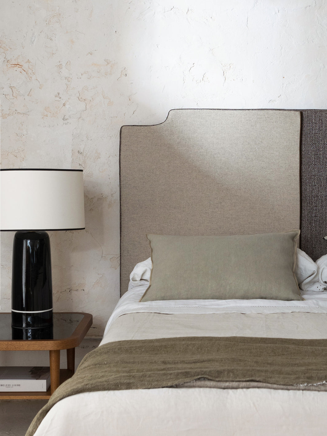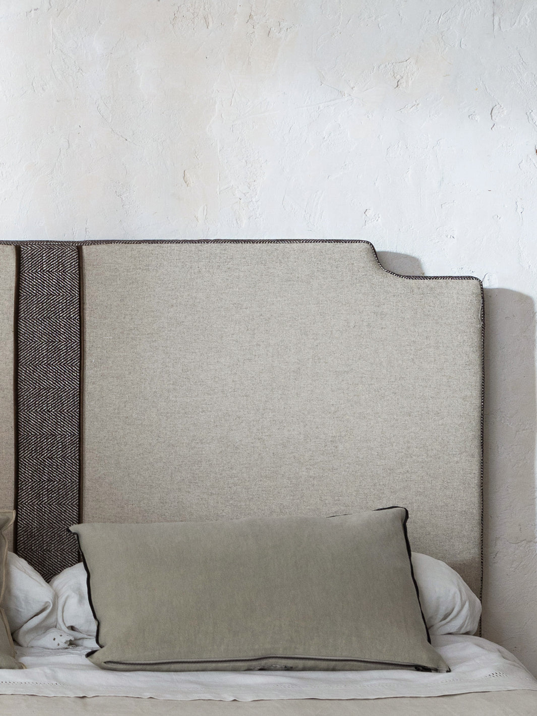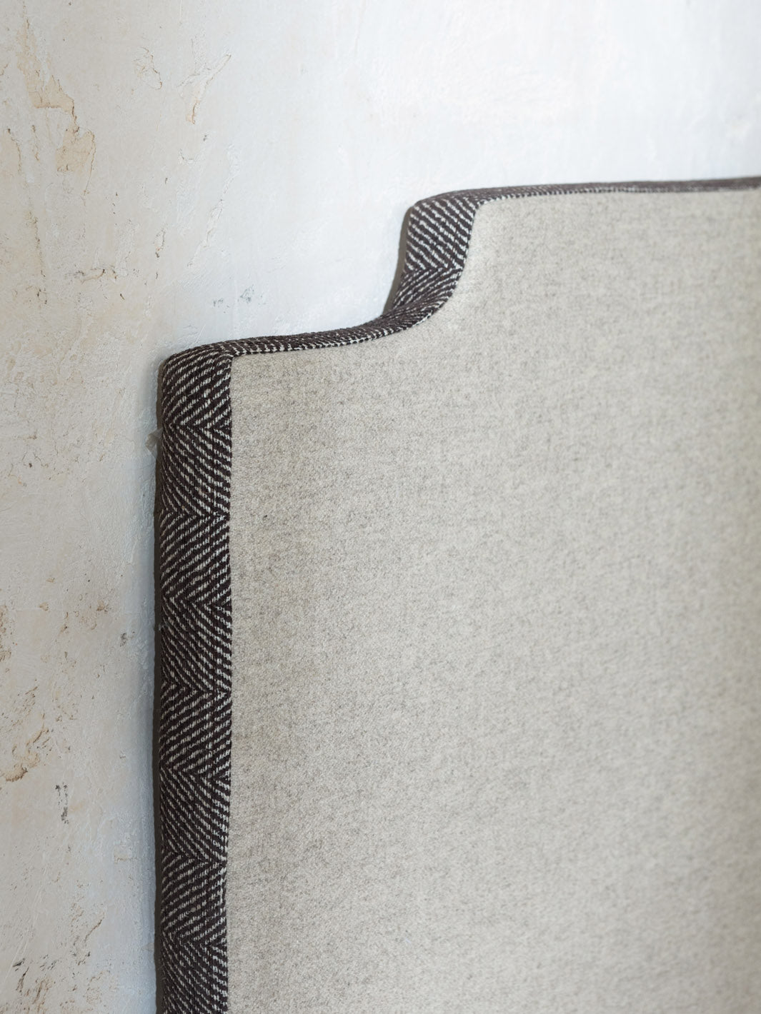 Our most masculine style is inspired by the quality of Welsh fabrics. It's crafted in exquisite, cool wool in a natural color with a brown herringbone velvet and linen trim.