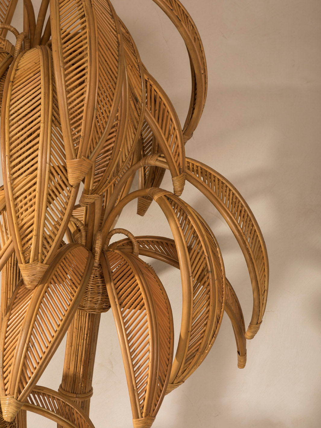 Spectacular French palm tree-shaped wall light, handcrafted from rattan, with two lights. An imposing piece with a lot of character that looks more like a sculpture than a wall light.