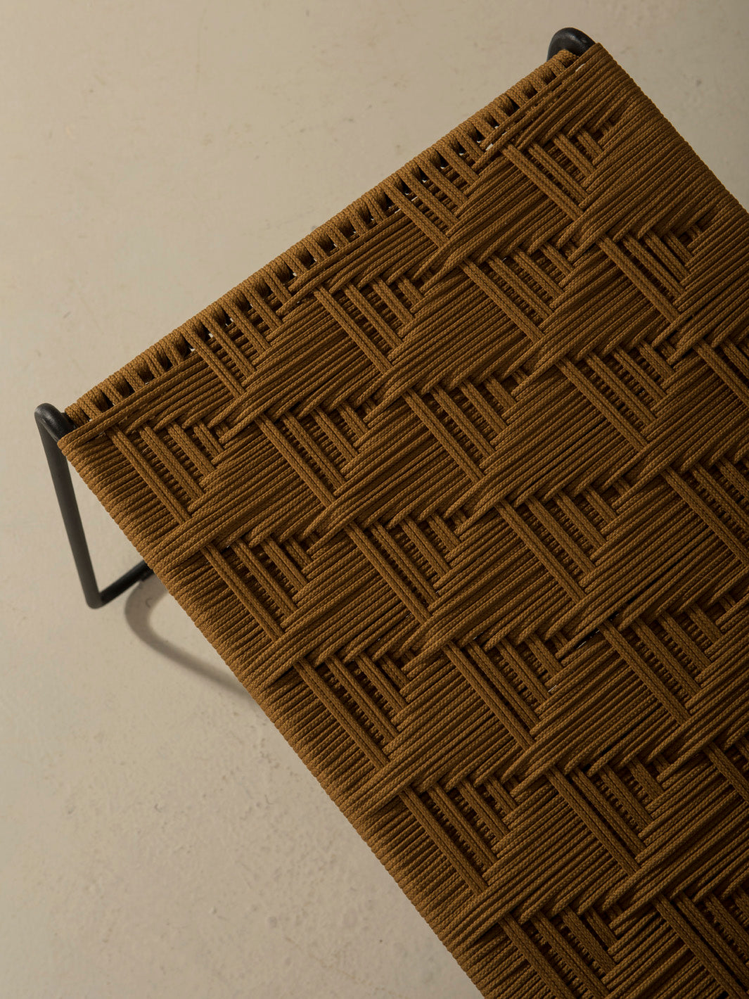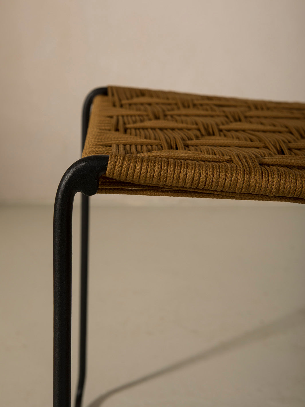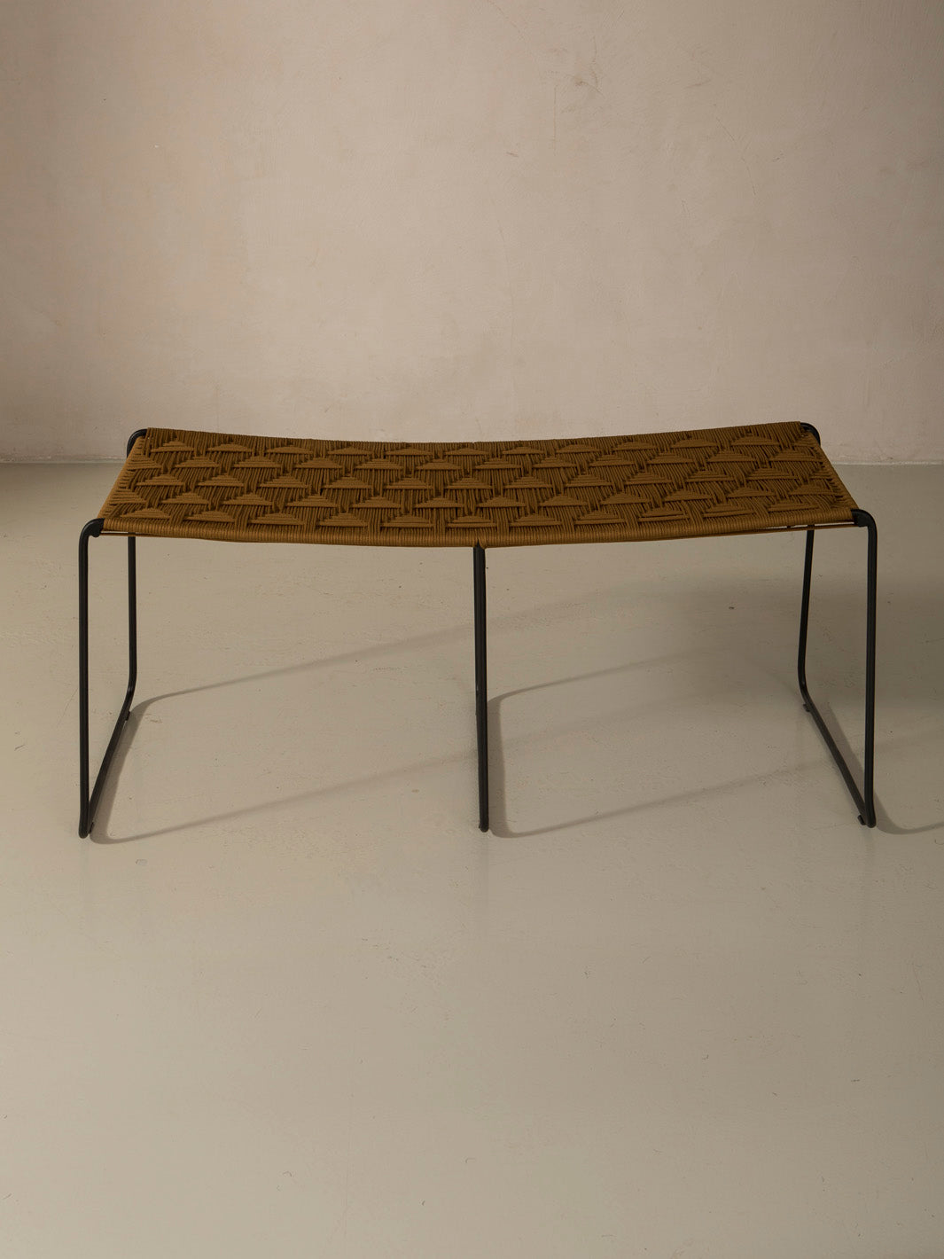 Nawal bench, woven in tobacco-colored fibers, with a wrought iron frame. It can be used outdoors moderately to prevent discoloration over time and prevent the iron from being affected by moisture.