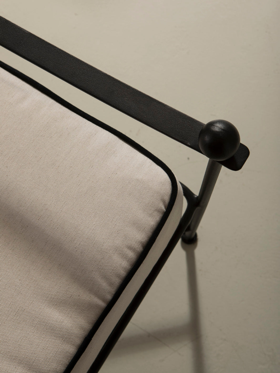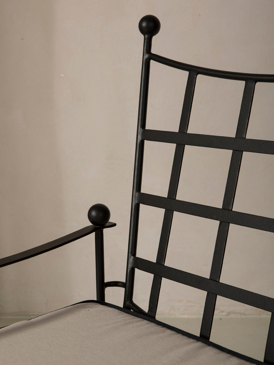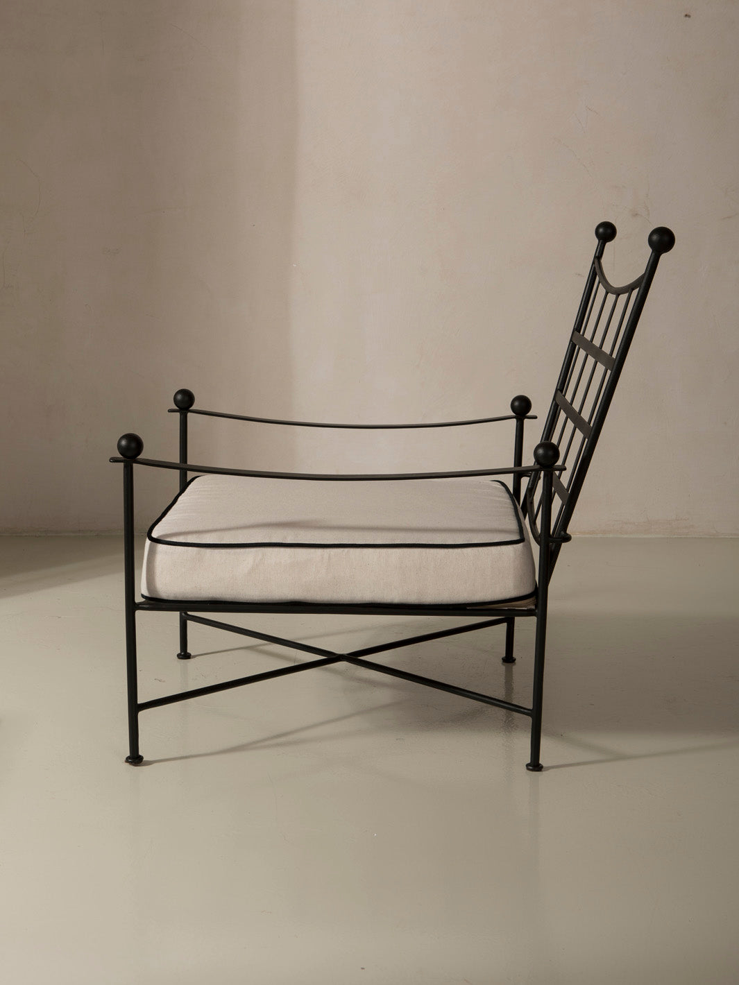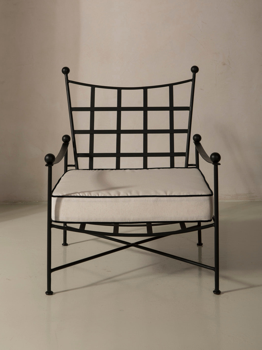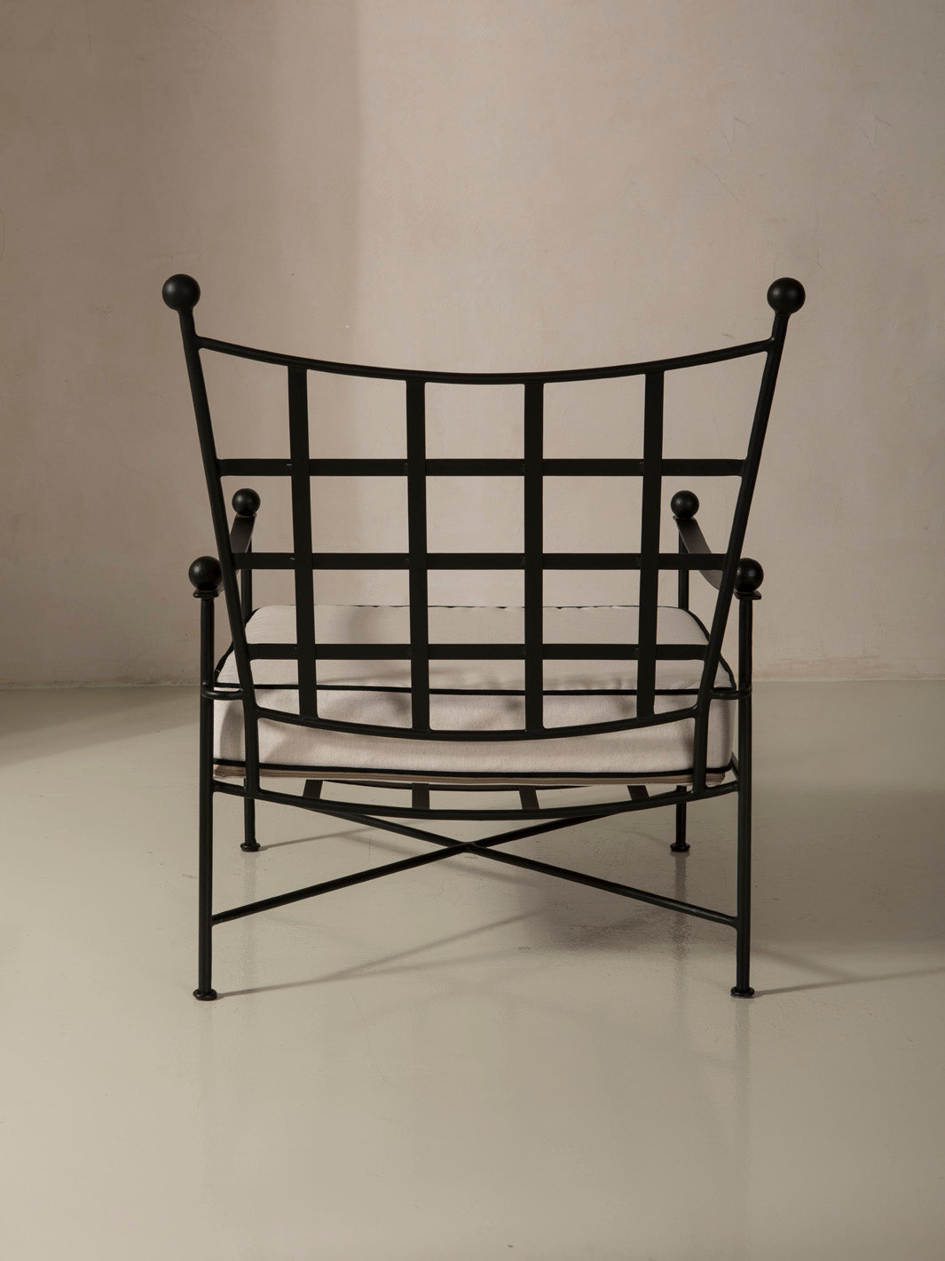 This armchair combines the solidity of handcrafted wrought iron with the visual lightness of a simple, refined design. The structure's fine lines and rounded details provide a renewed classic feel, with delicate ironwork that enhances its handcrafted character. Its versatile and timeless design makes it a piece that balances aesthetics and functionality, bringing warmth and personality to any space.