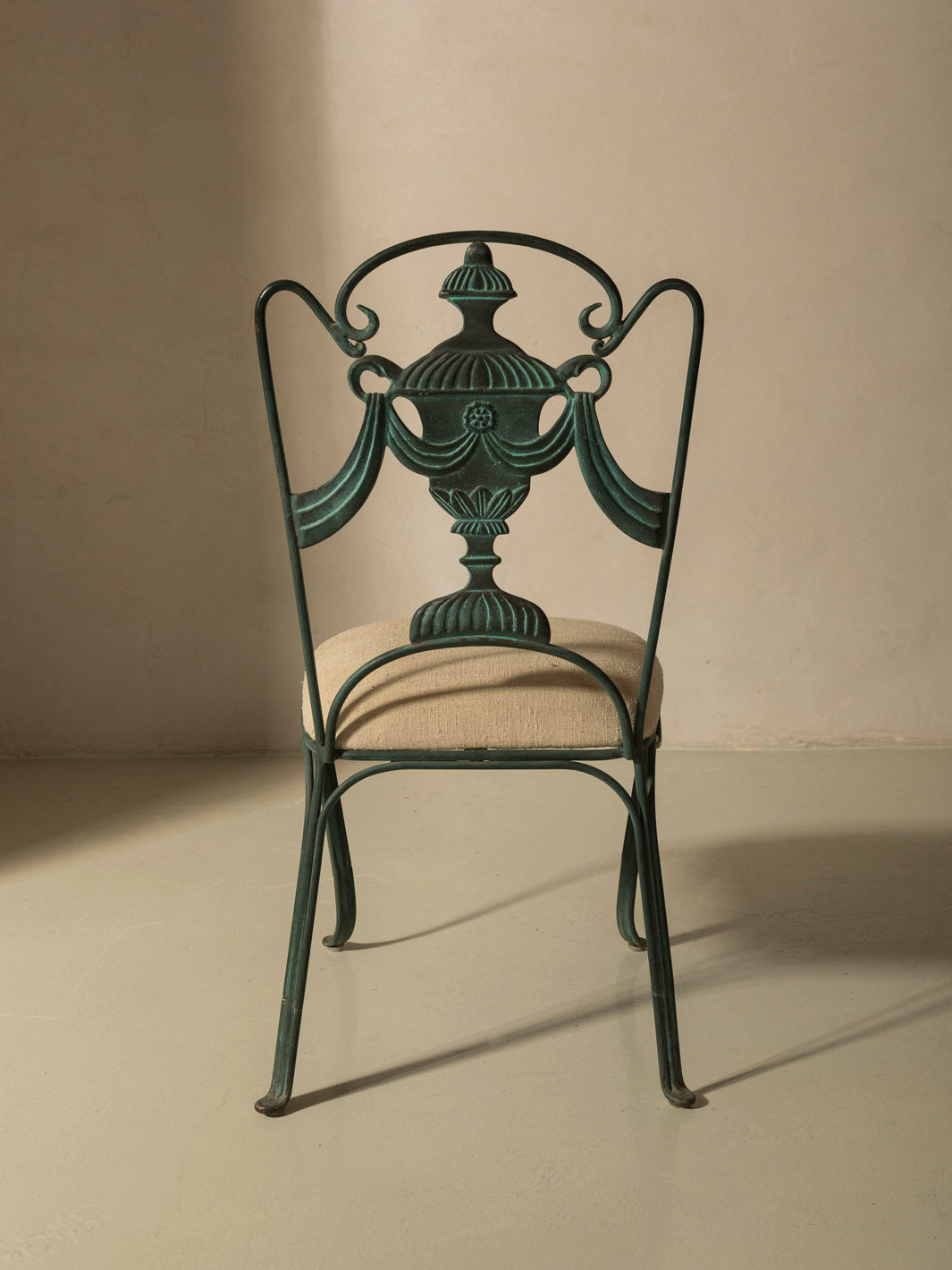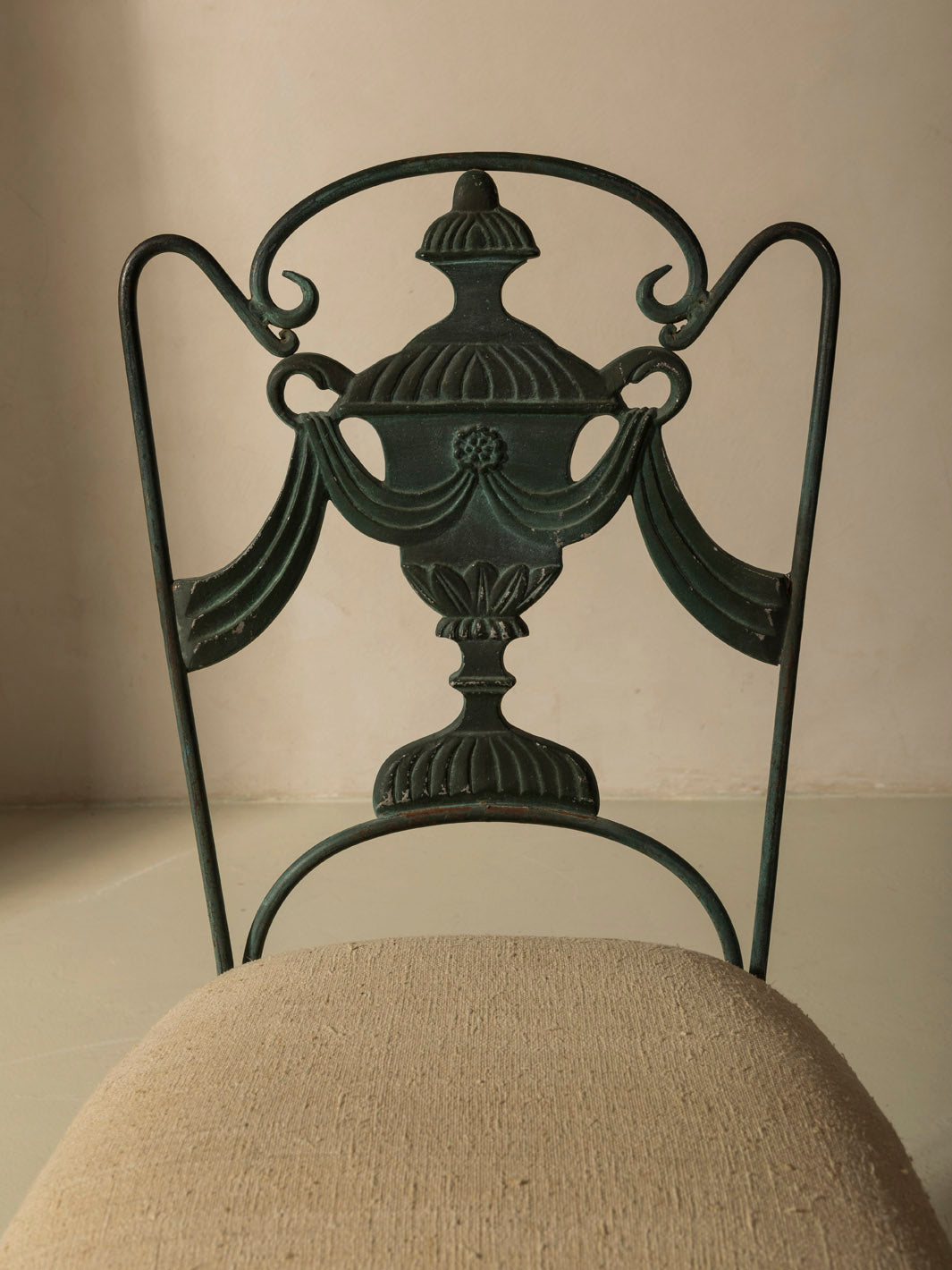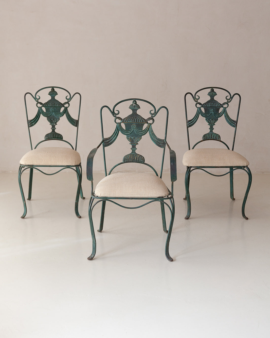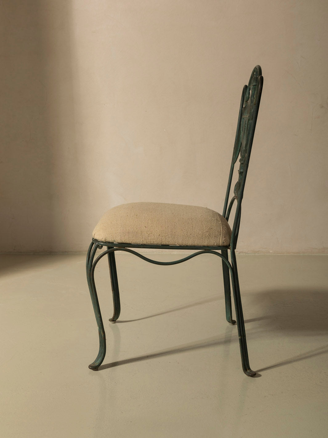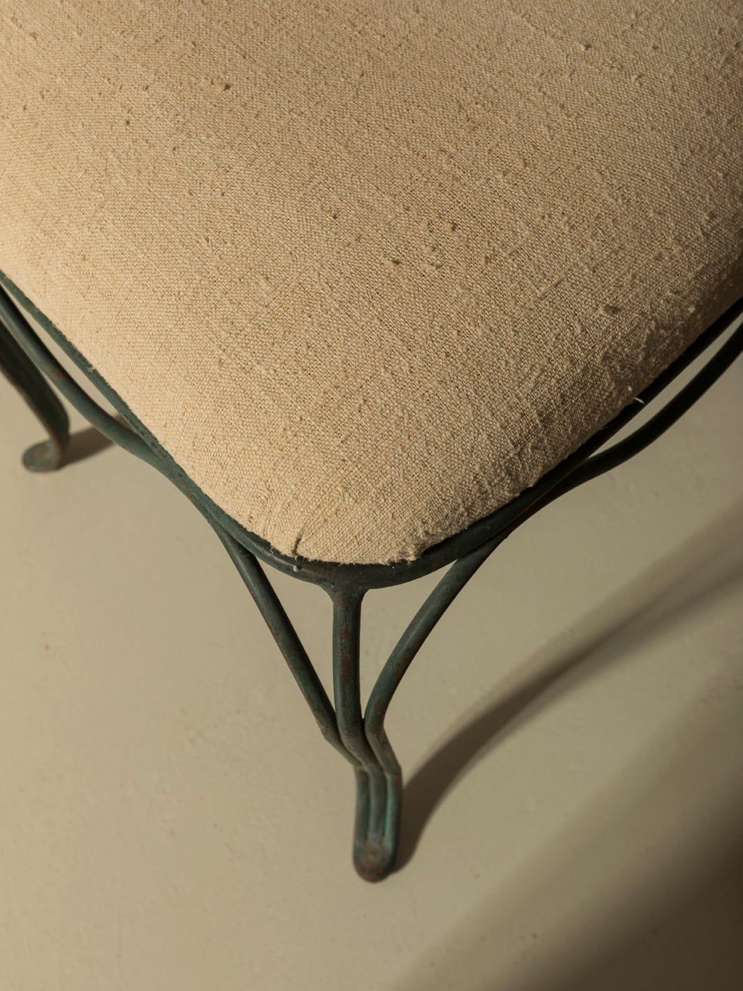 Pair of iron chairs upholstered in linen from the early 20th century, originally from Rome in the 1940s.