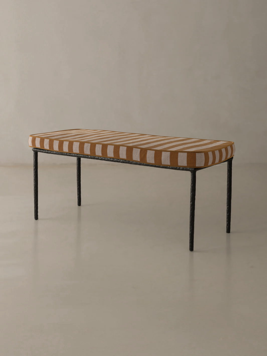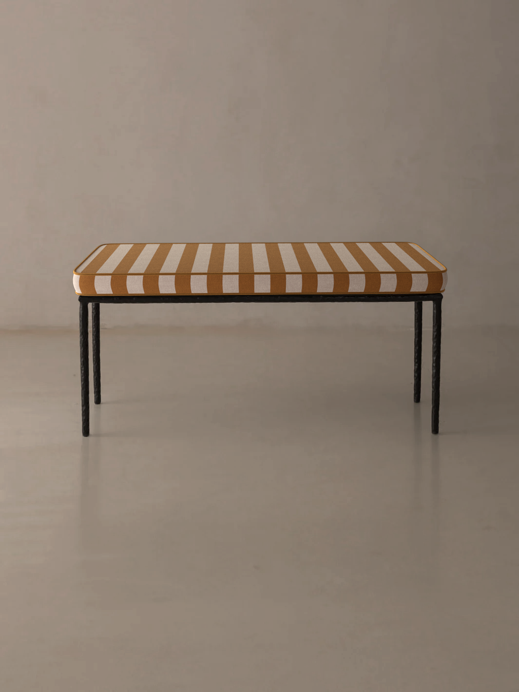 Medaillon bench cover. Crafted from high-quality mustard and white striped fabric, these covers add a sophisticated and timeless touch to any outdoor space. Every detail has been carefully designed to offer comfort without compromising on design.