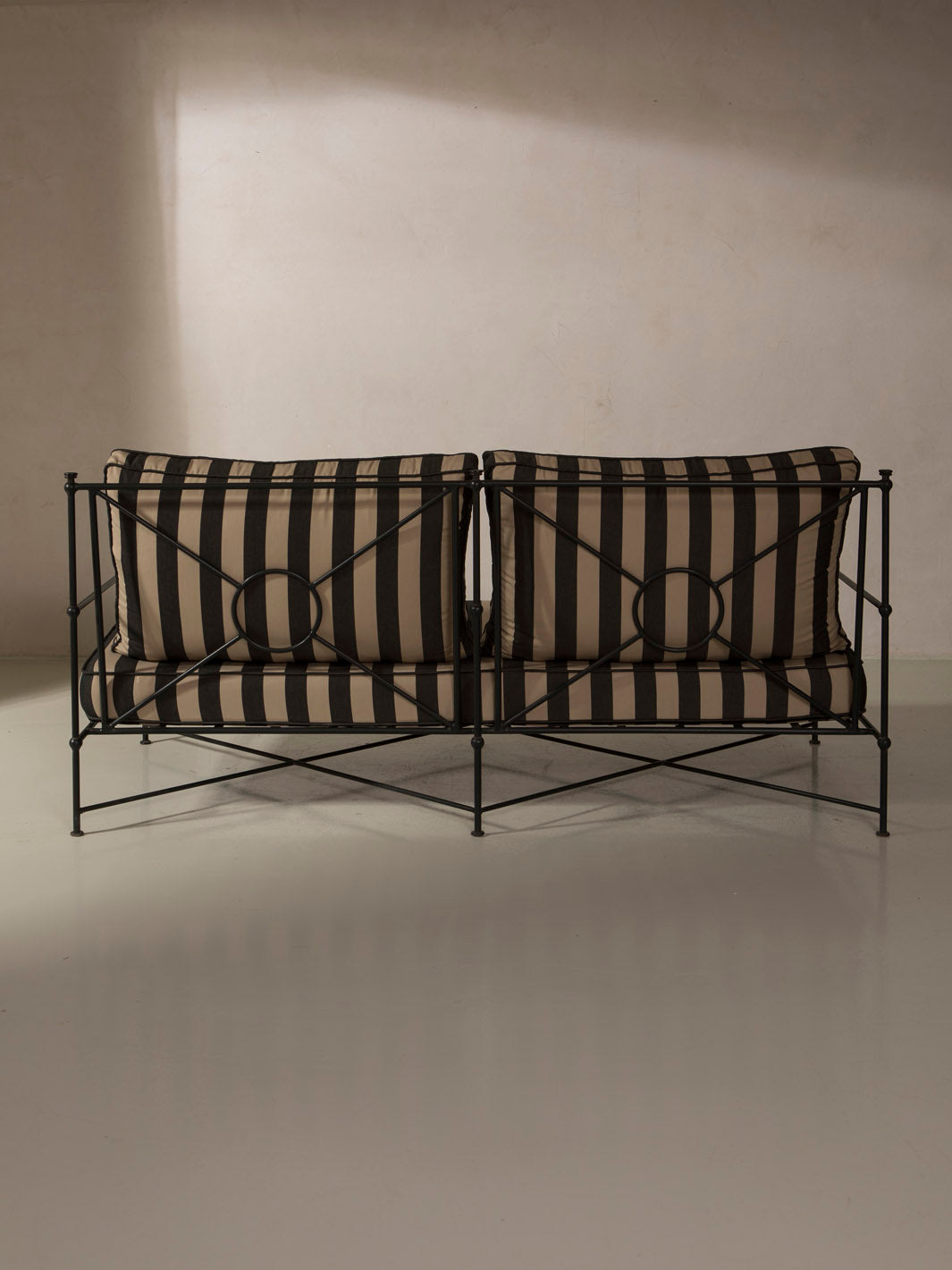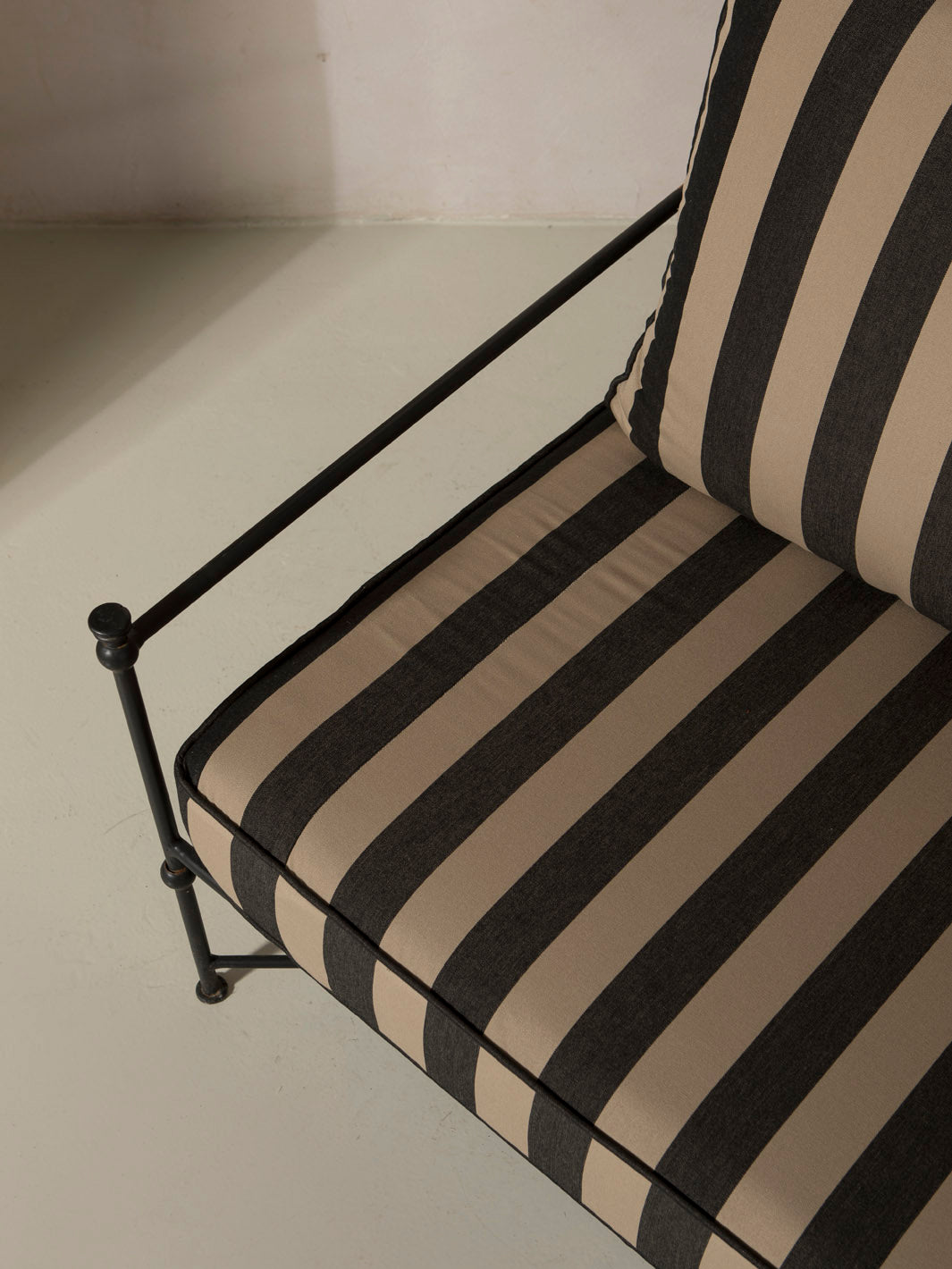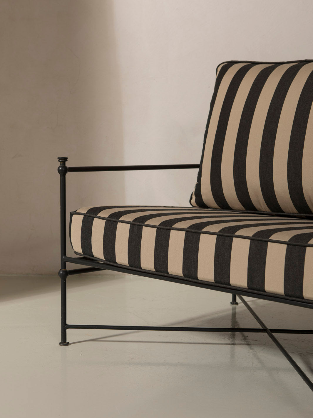 Medaillon sofa cover. Crafted from high-quality black and beige striped fabric, these covers add a sophisticated and timeless touch to any outdoor space. Every detail has been carefully designed to offer comfort without compromising on design.