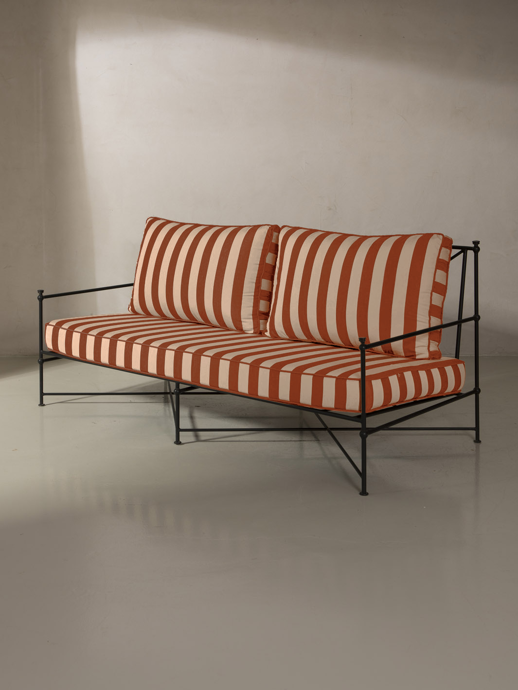 Medaillon sofa cover. Crafted from high-quality tomato and beige striped fabric, these covers add a sophisticated and timeless touch to any outdoor space. Every detail has been carefully designed to offer comfort without compromising on design.