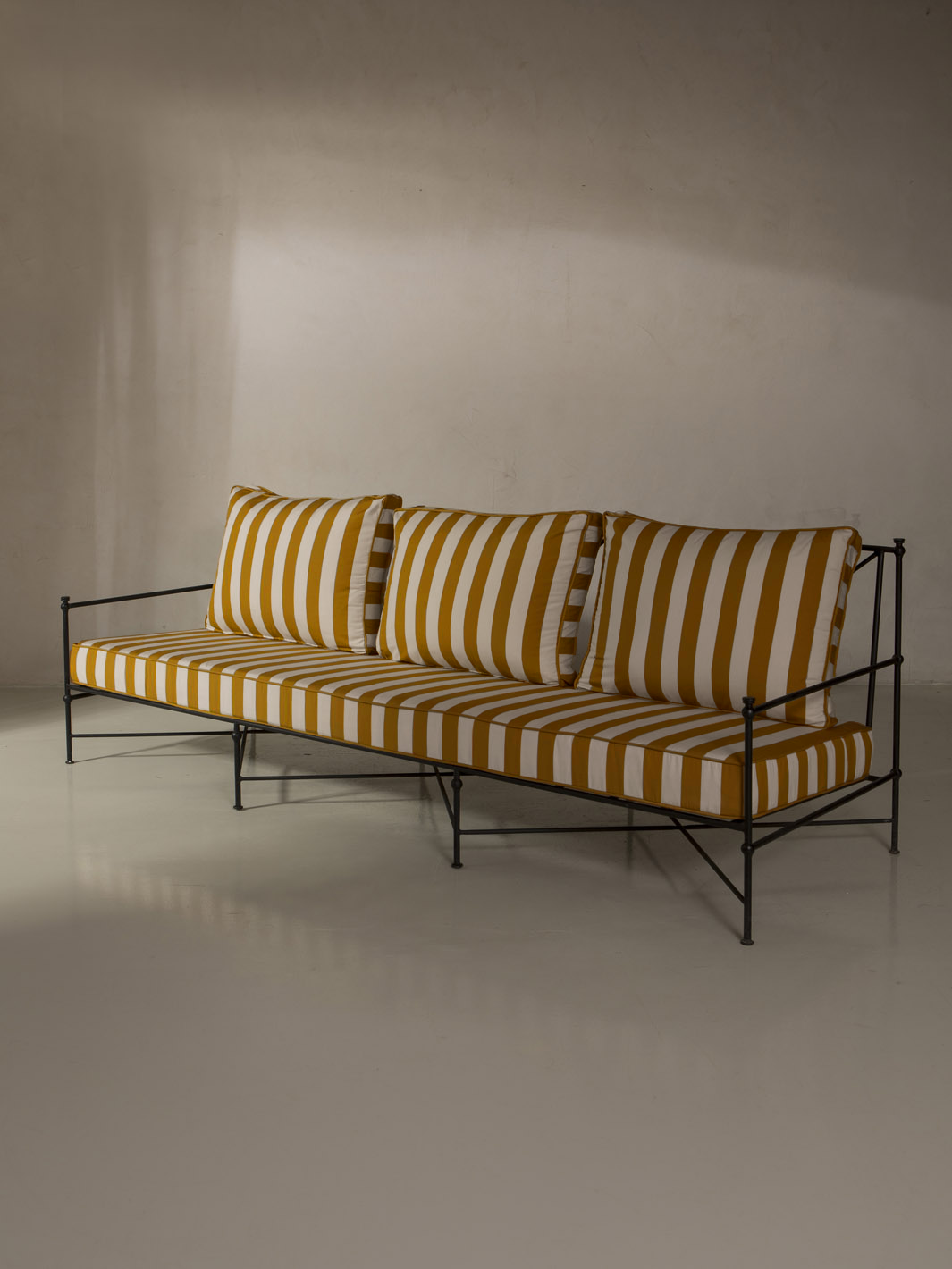 Medaillon sofa cover in mustard and white stripes. Crafted from high-quality striped fabric, these covers add a sophisticated and timeless touch to any outdoor space. Every detail has been carefully designed to offer comfort without compromising on design.