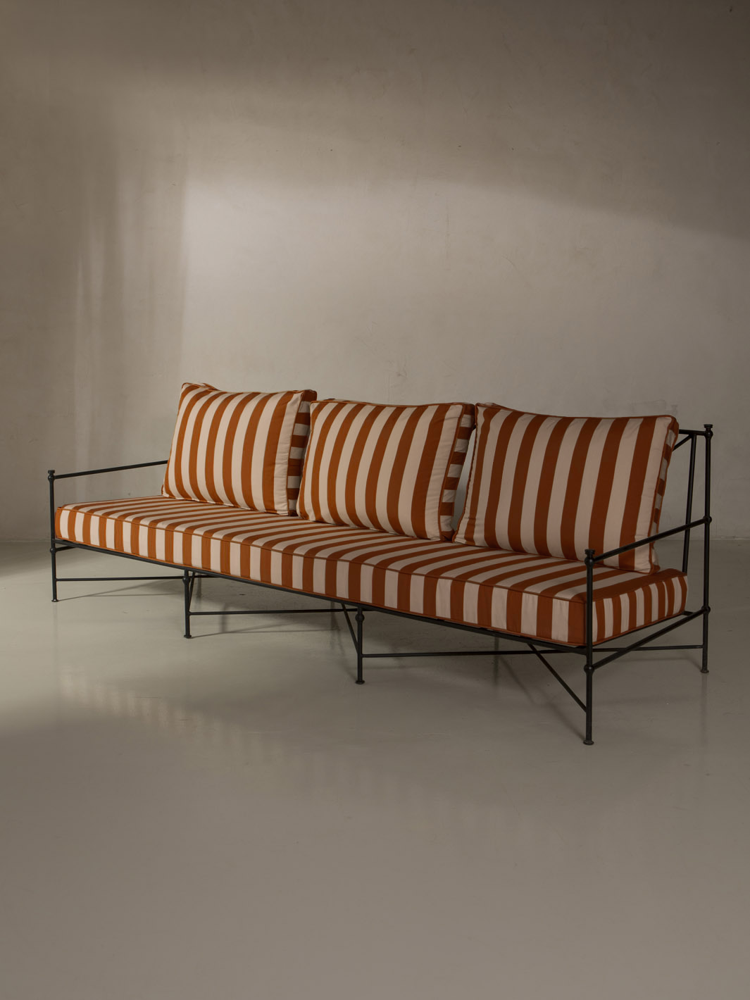 Medaillon sofa cover in tomato and beige stripes. Crafted from high-quality striped fabric, these covers add a sophisticated and timeless touch to any outdoor space. Every detail has been carefully designed to offer comfort without compromising on design.