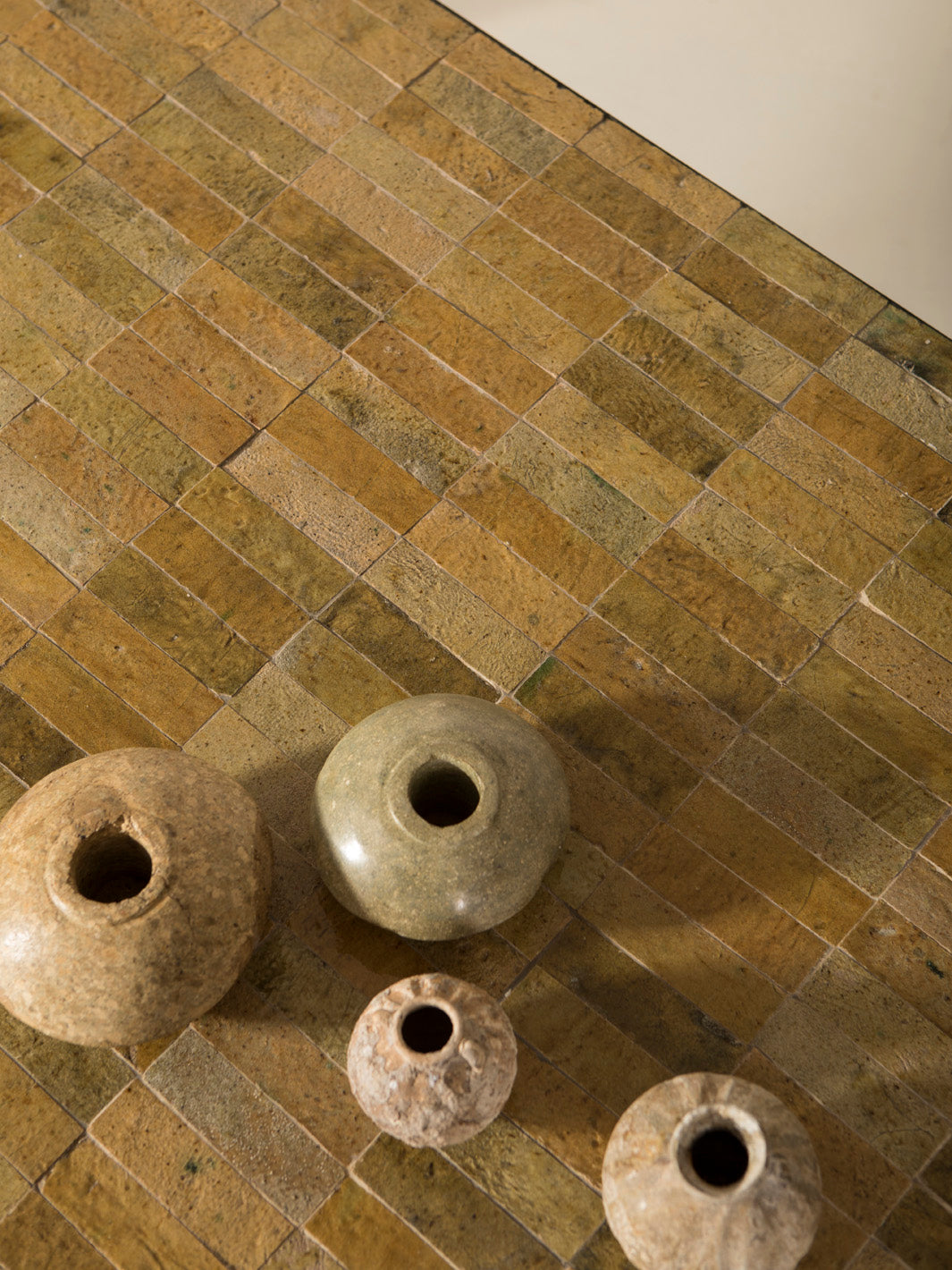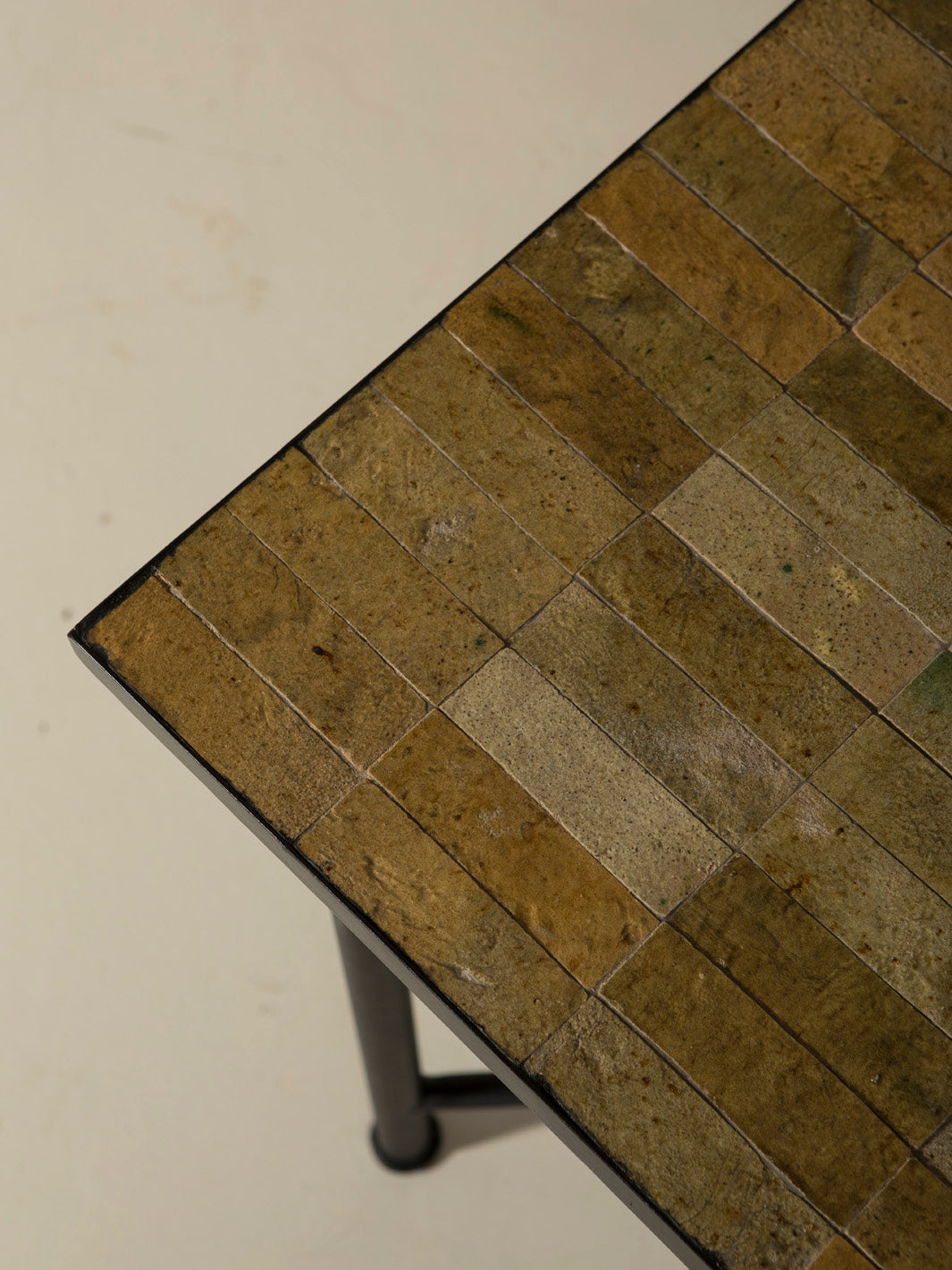 A piece that embodies the imperfect elegance of handcrafted work and the balance between tradition and contemporary design. The tabletop is composed of zellige tiles, handcrafted one by one from natural clay, glazed and cut with artisanal precision. The result is a vibrant, nuanced surface where light is reflected in subtle, ever-changing ways.