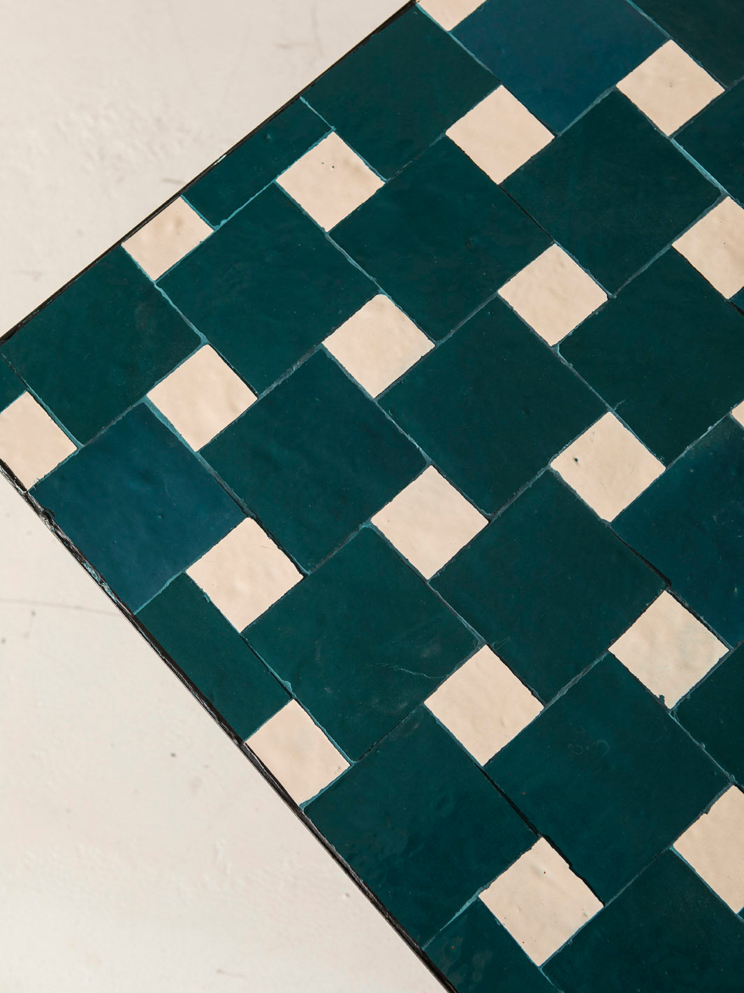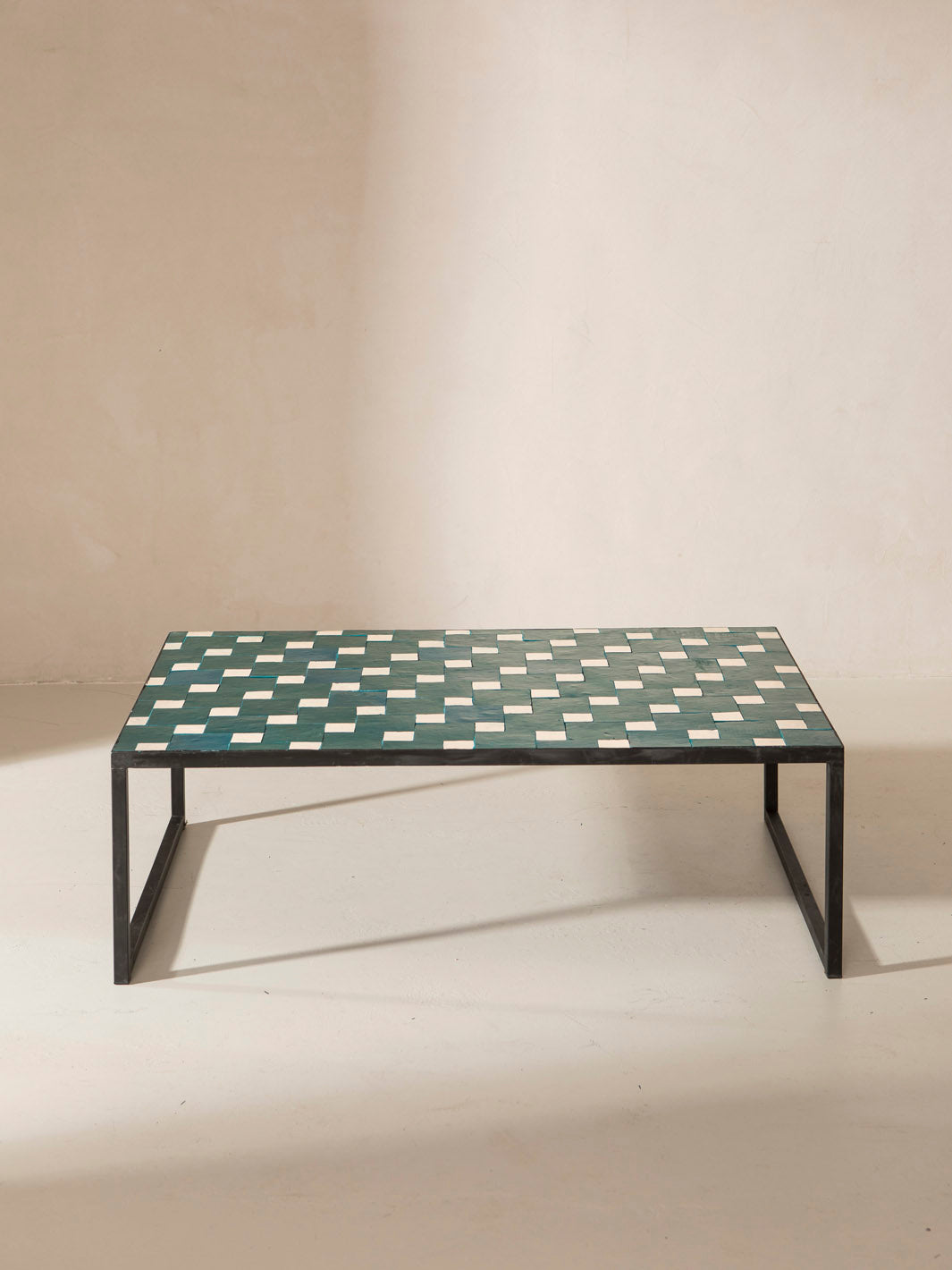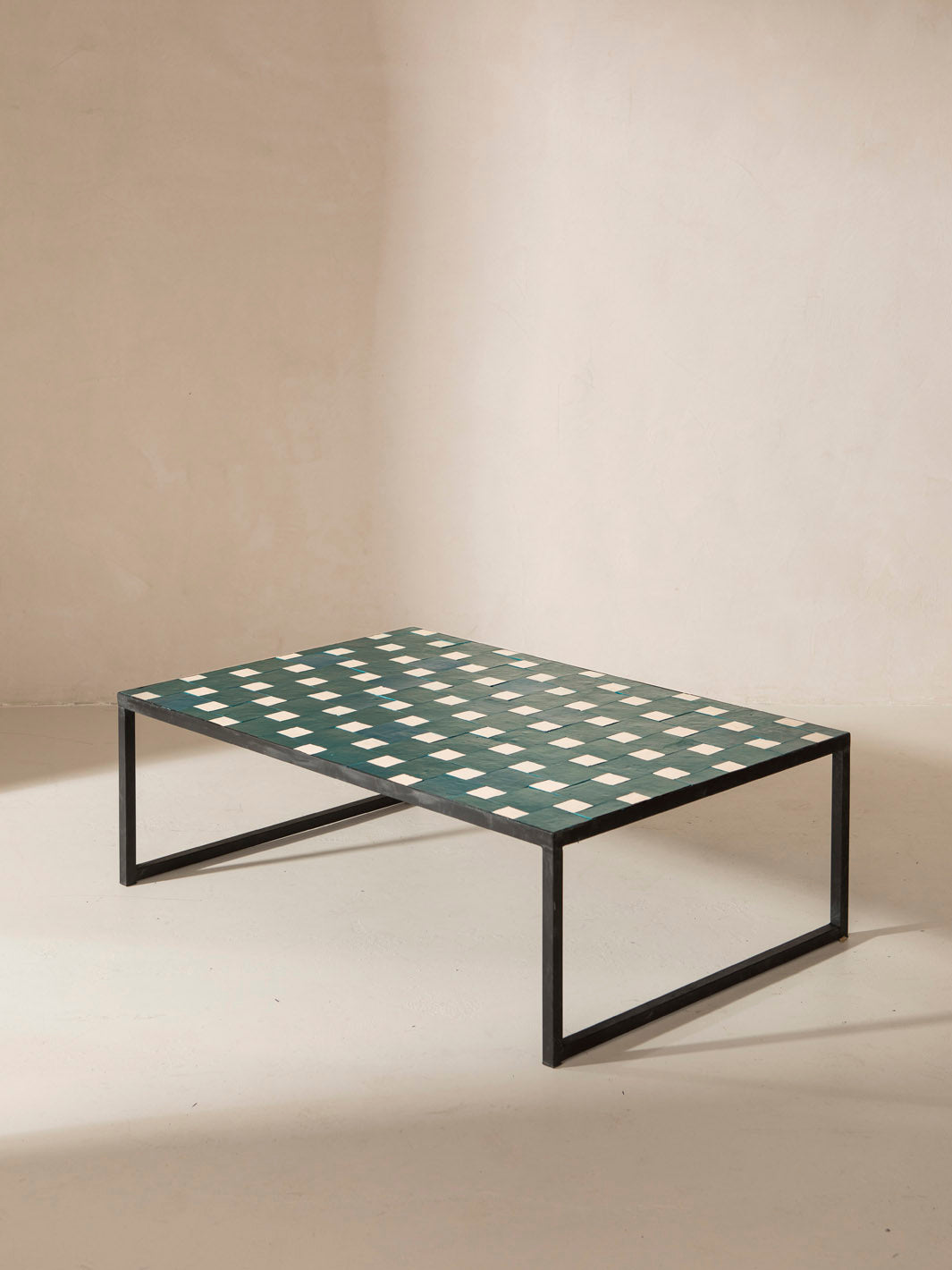 Coffee table handcrafted in Ourika workshops with black wrought iron structure and Zellige tile top in greenish blue and cream geometry. Zellige tiles are small terracotta bricks arranged in small glazed geometric plates, characteristic of Moroccan architecture.