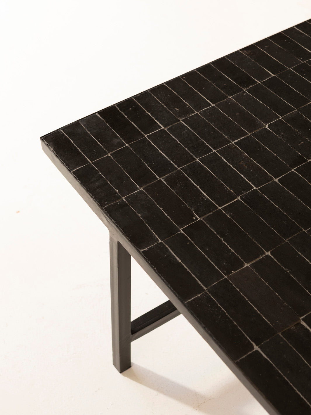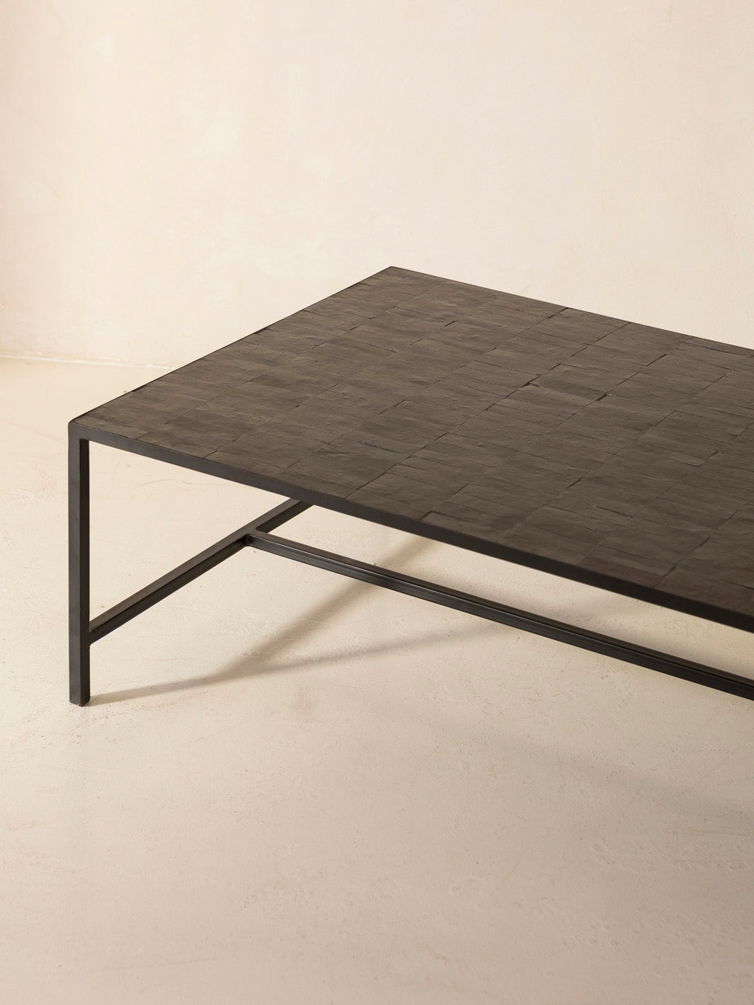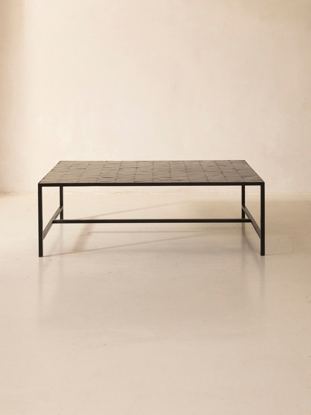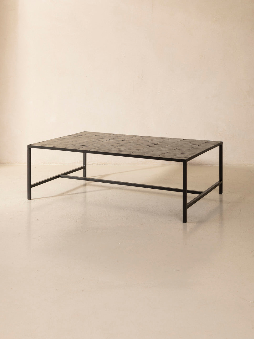 Handcrafted coffee table in Ourika workshops with a black wrought iron frame and a black Zellige tile top. Zellige tiles are small terracotta bricks arranged in small geometric glazed slabs, characteristic of Moroccan architecture.