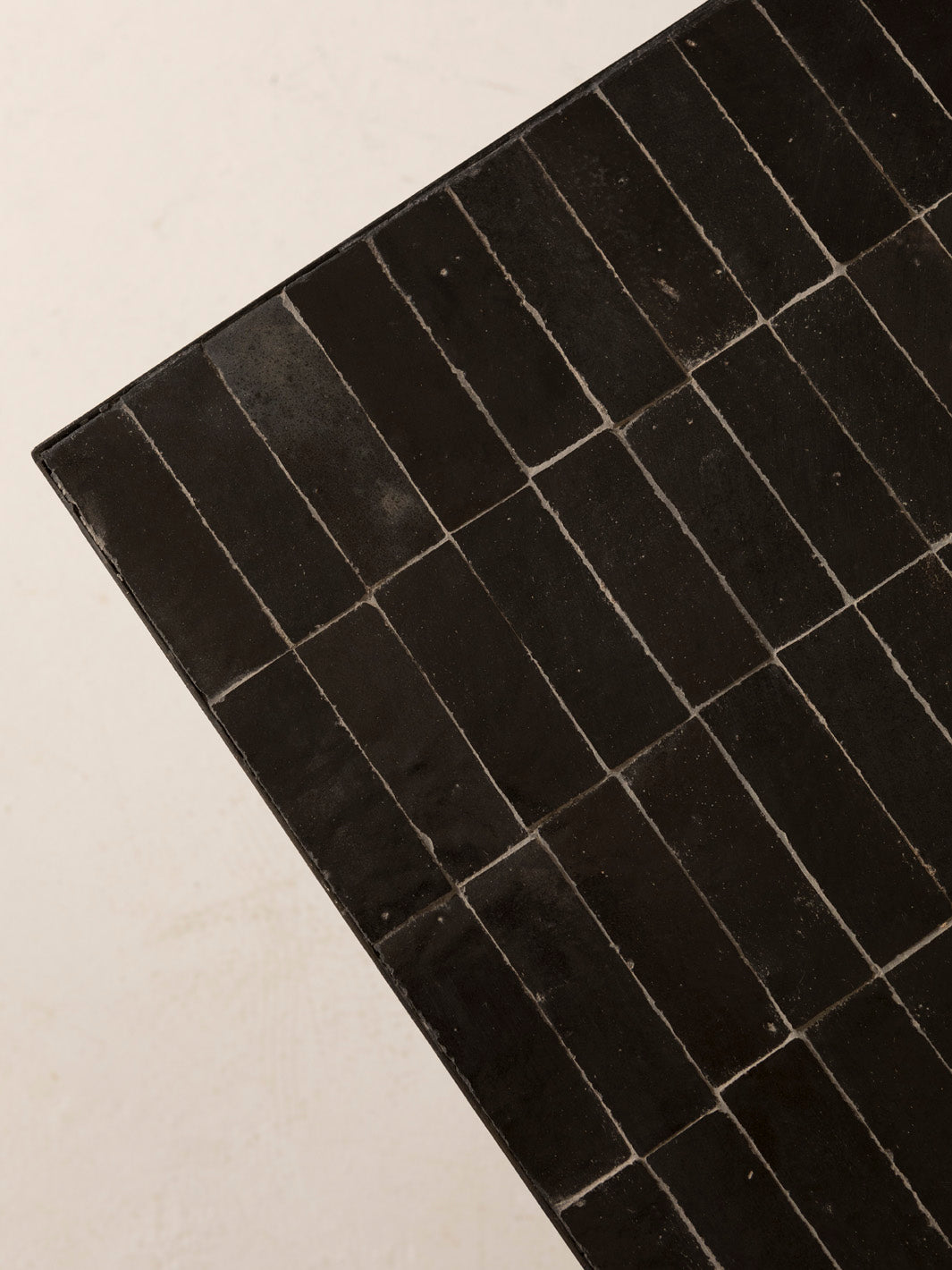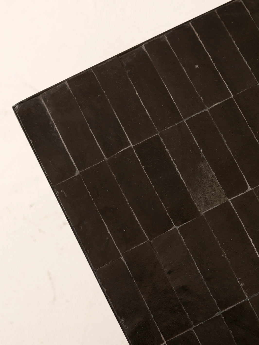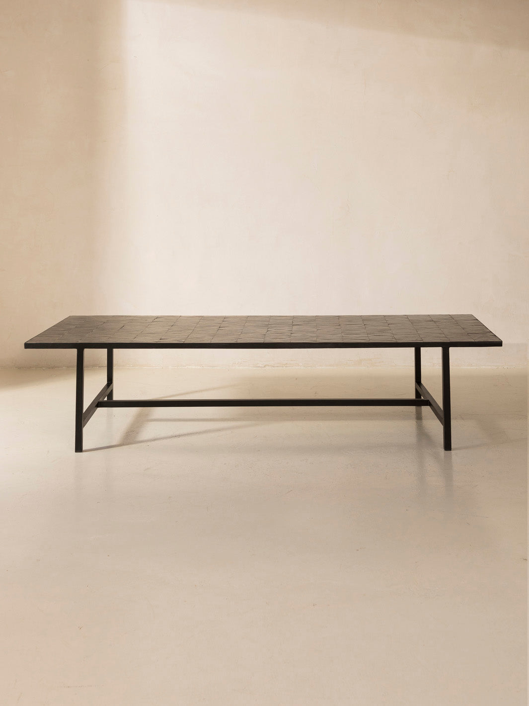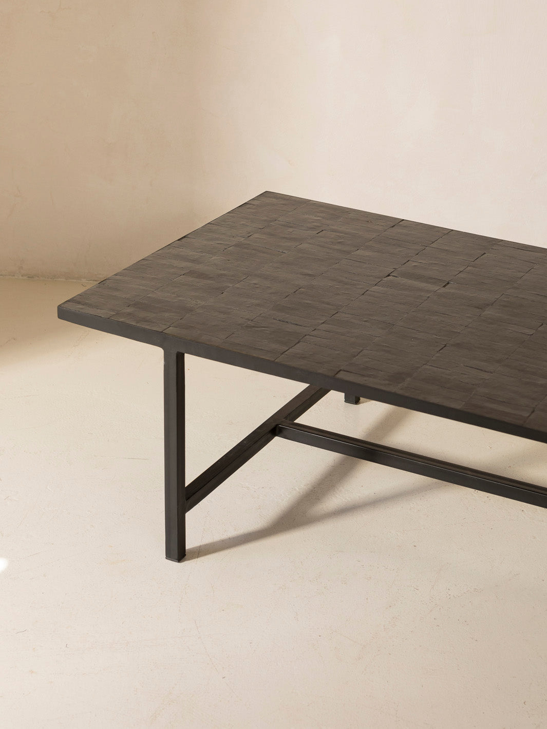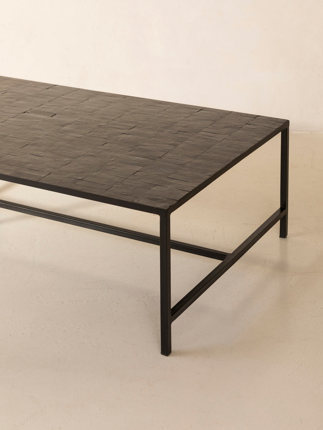 Handcrafted coffee table in Ourika workshops with a black wrought iron frame and a black Zellige tile top. Zellige tiles are small terracotta bricks arranged in small geometric glazed slabs, characteristic of Moroccan architecture.