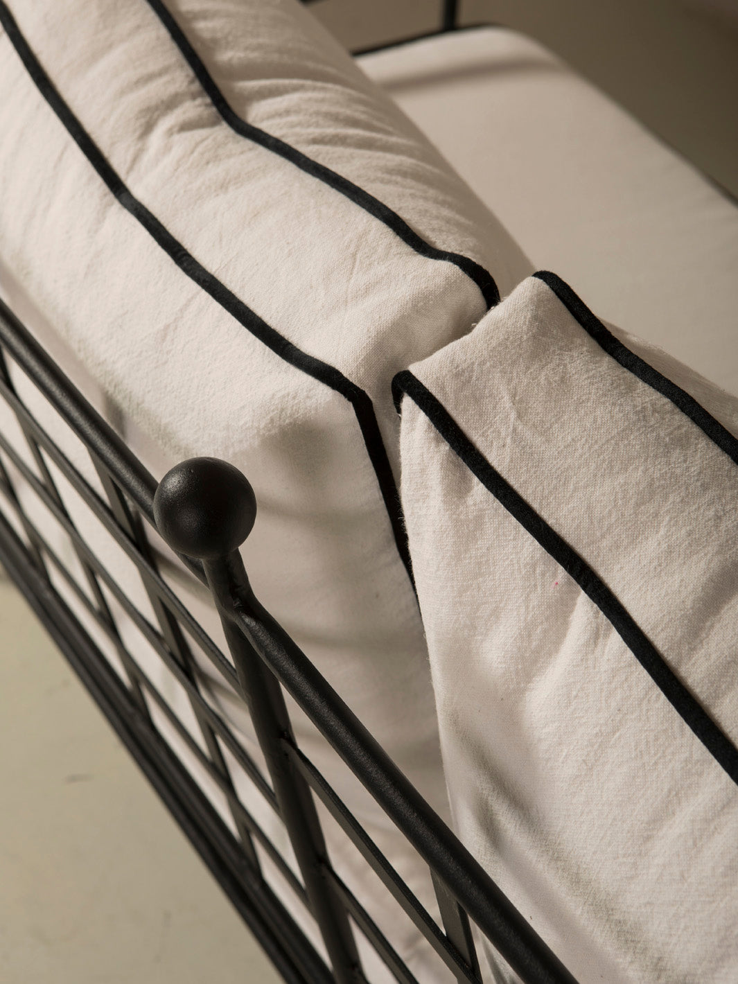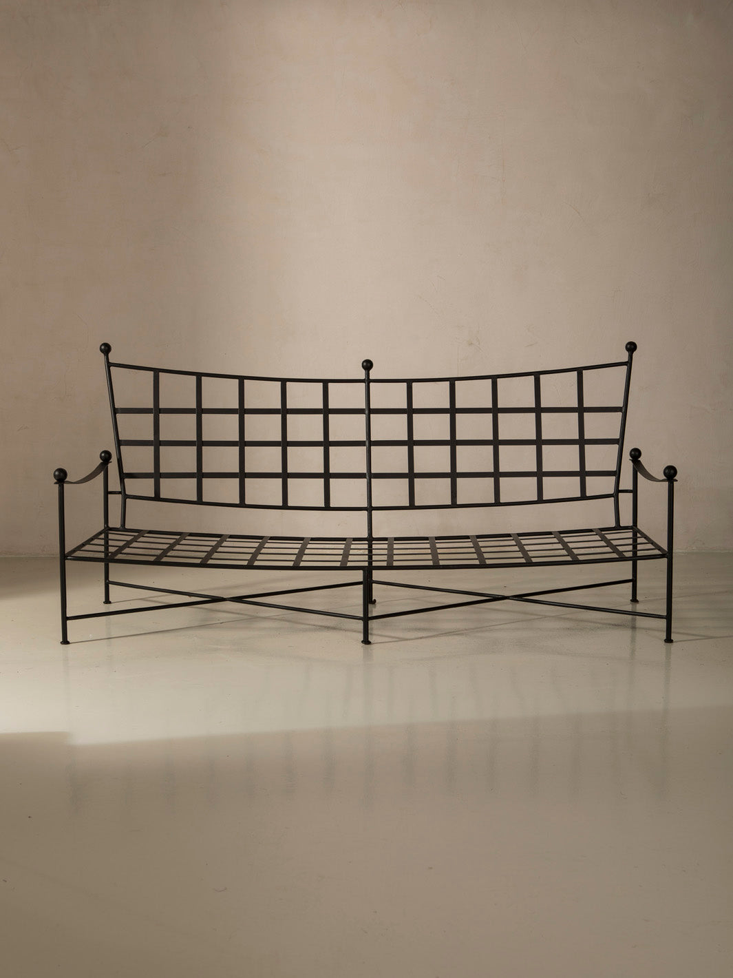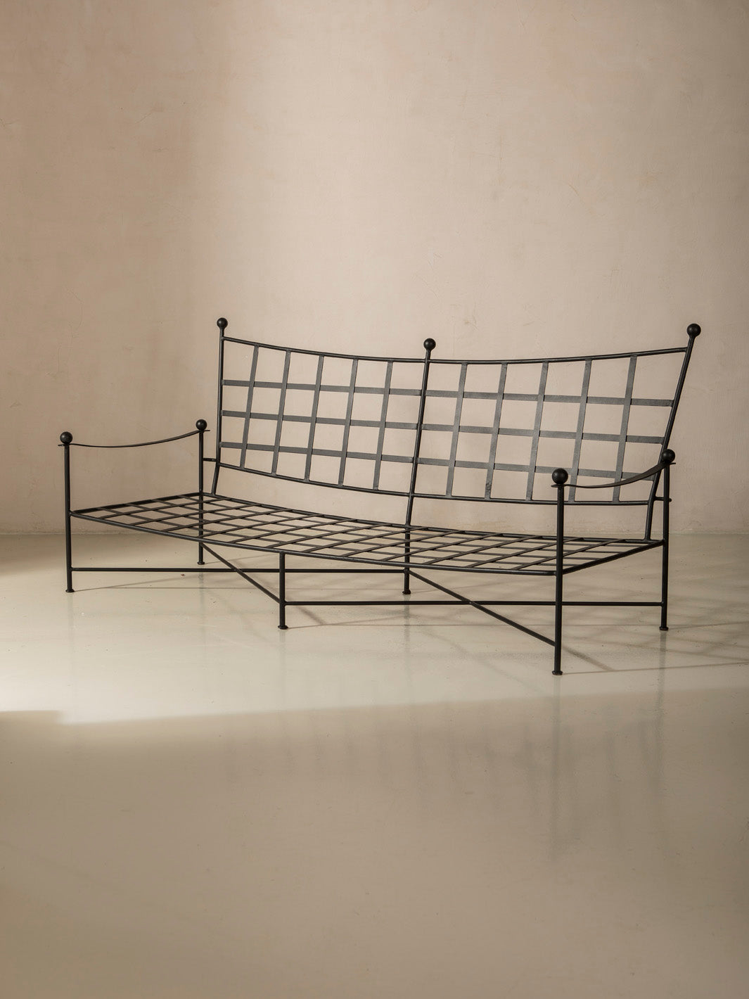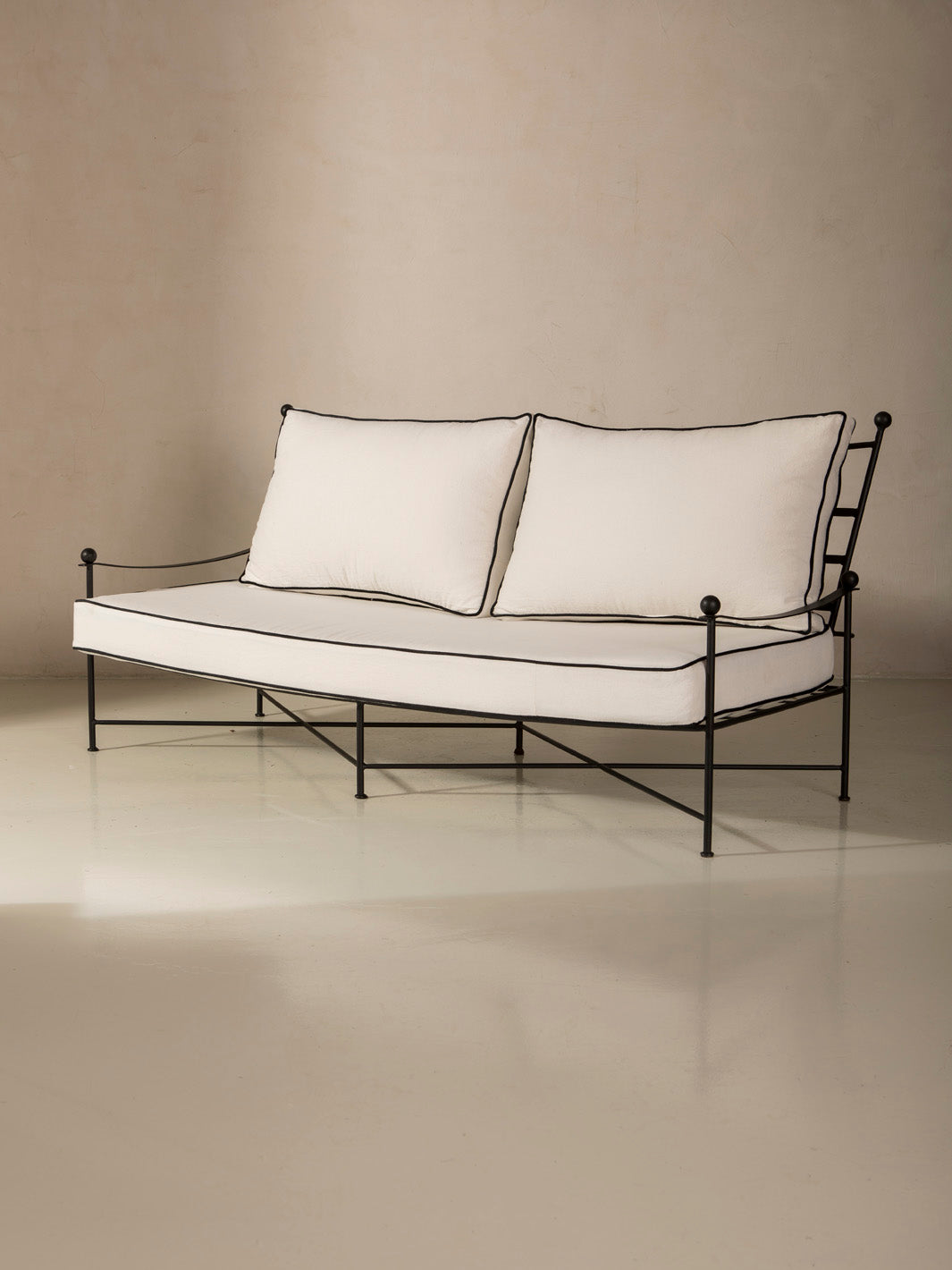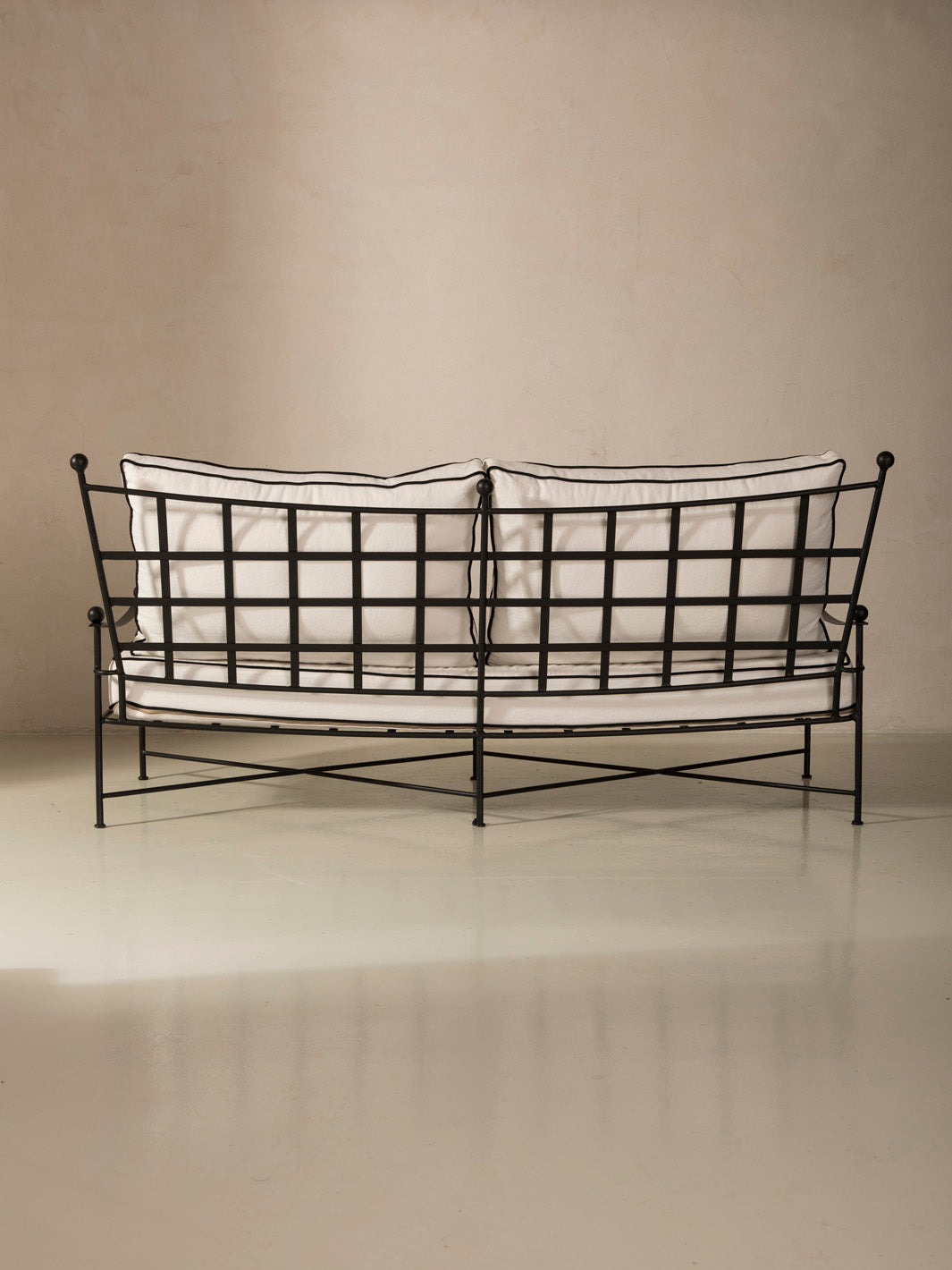 This sofa combines the solidity of handcrafted wrought iron with the visual lightness of a simple, refined design. The structure's fine lines and rounded details provide a renewed classic feel, with delicate ironwork that enhances its handcrafted character. Its versatile and timeless design makes it a piece that balances aesthetics and functionality, bringing warmth and personality to any space.