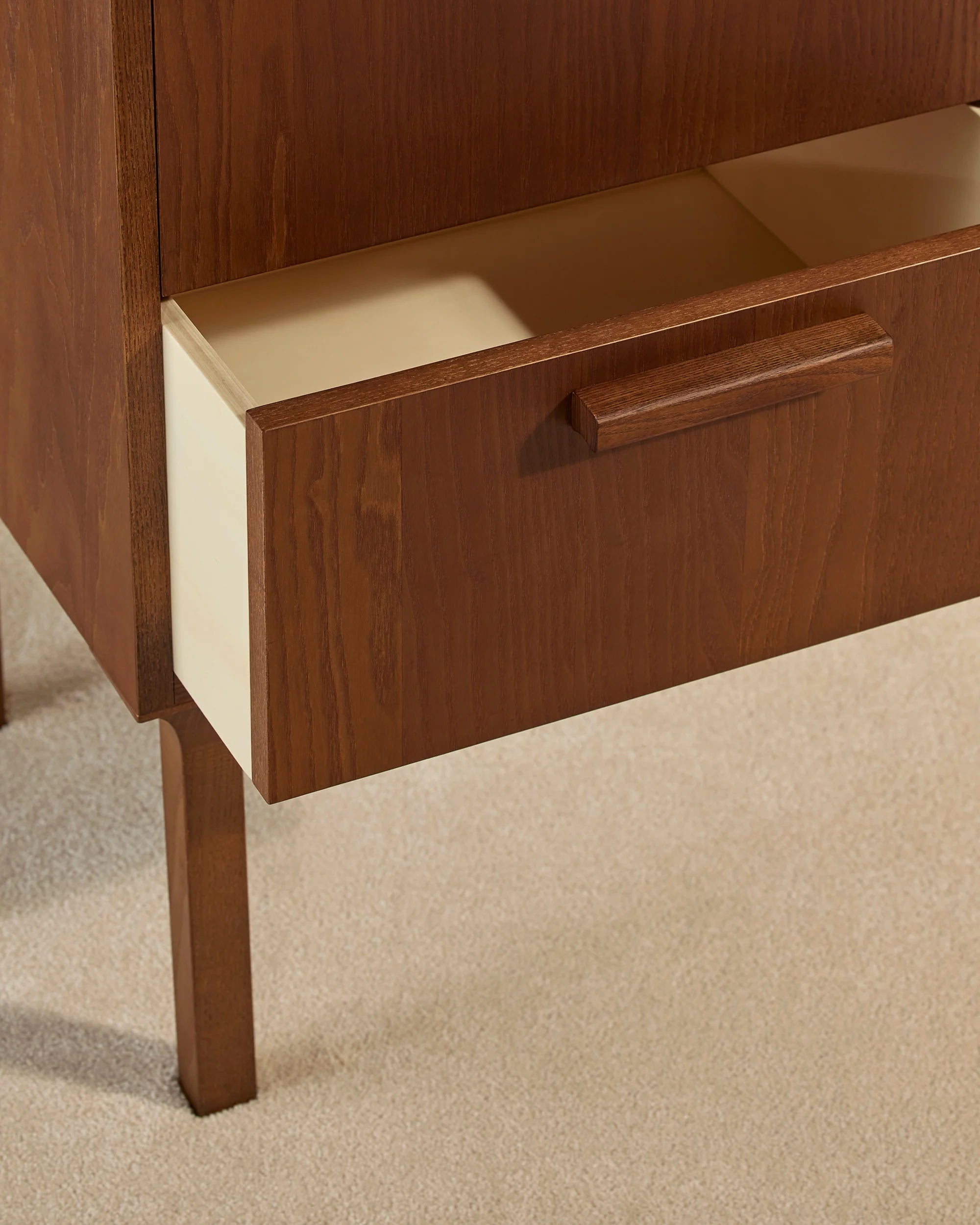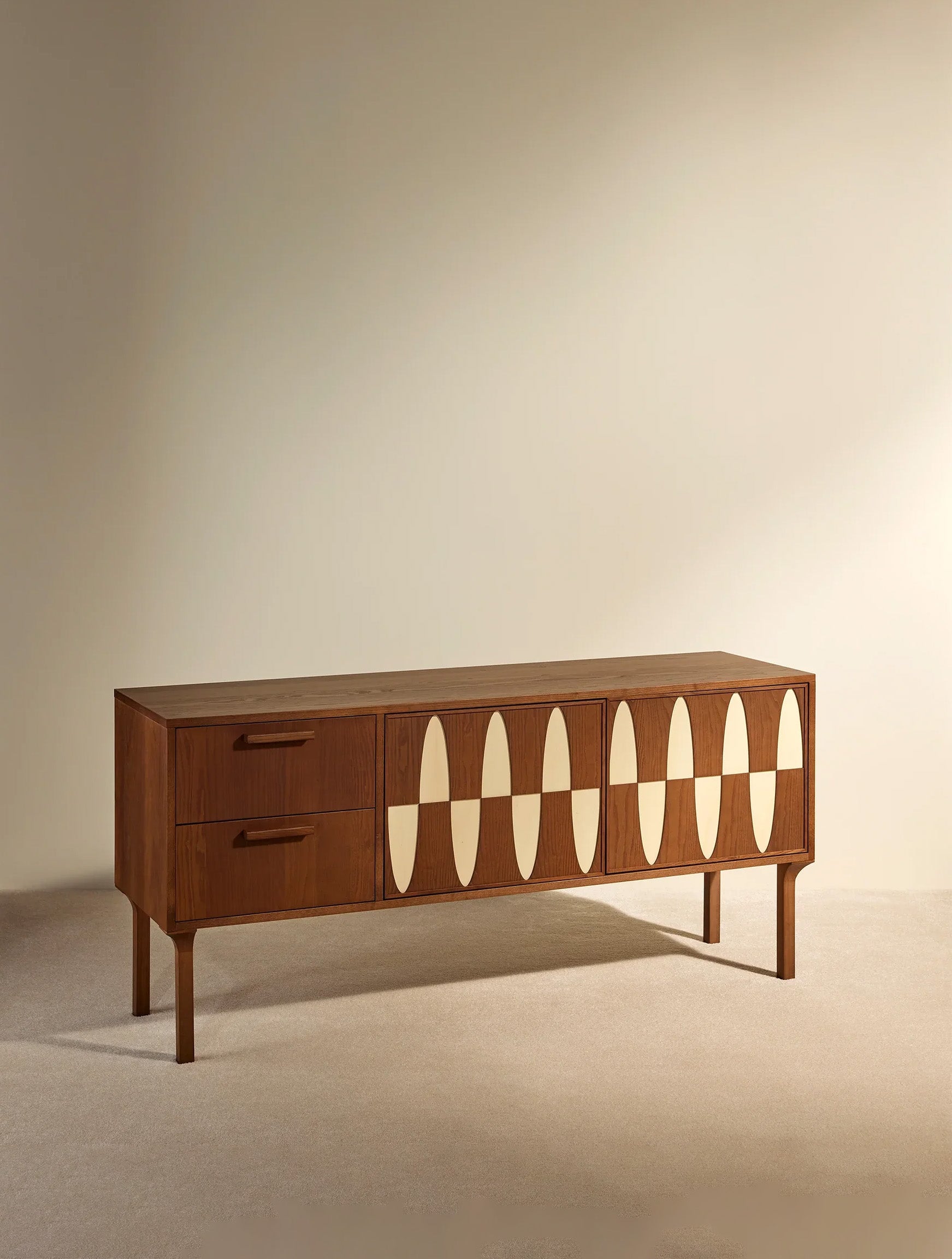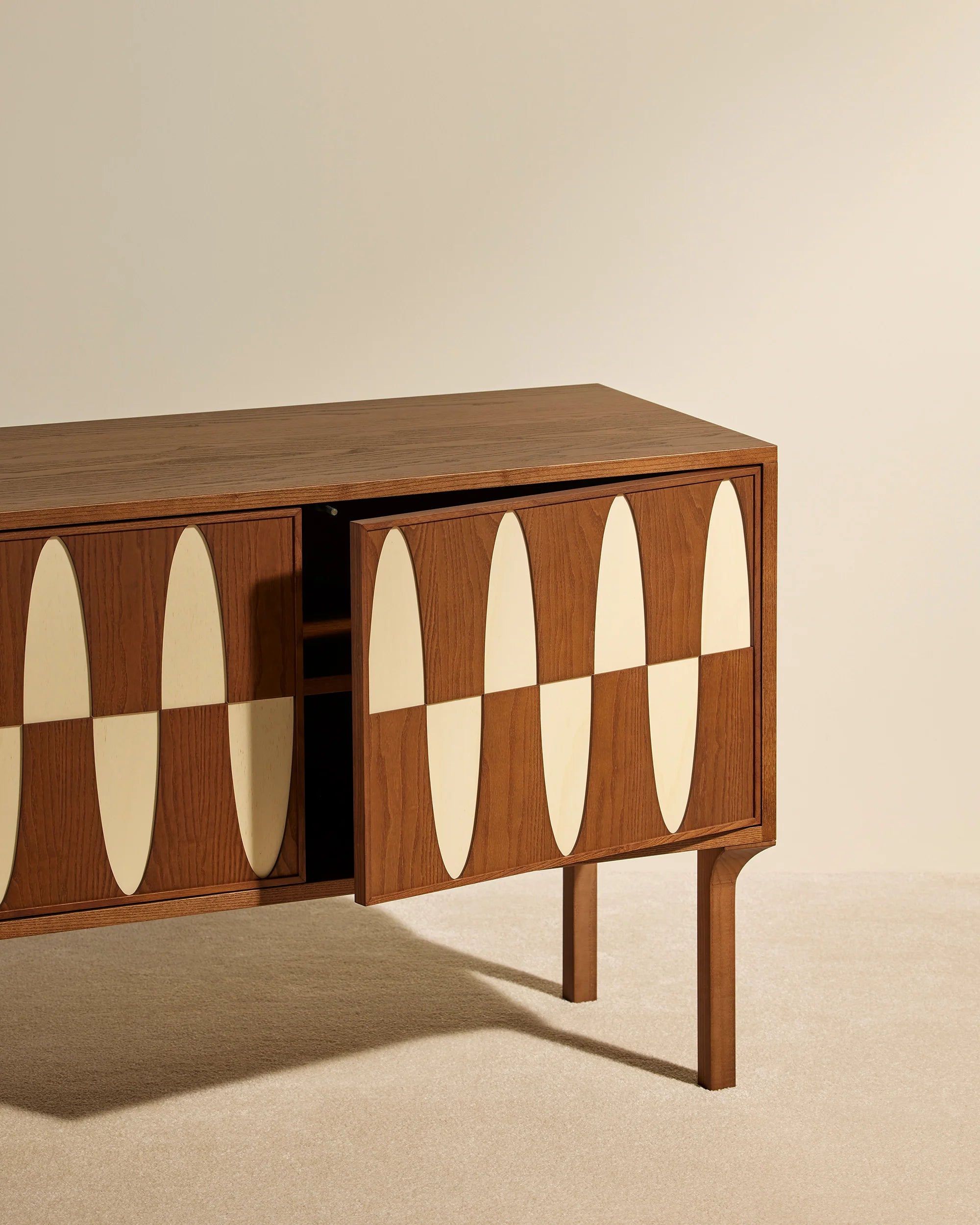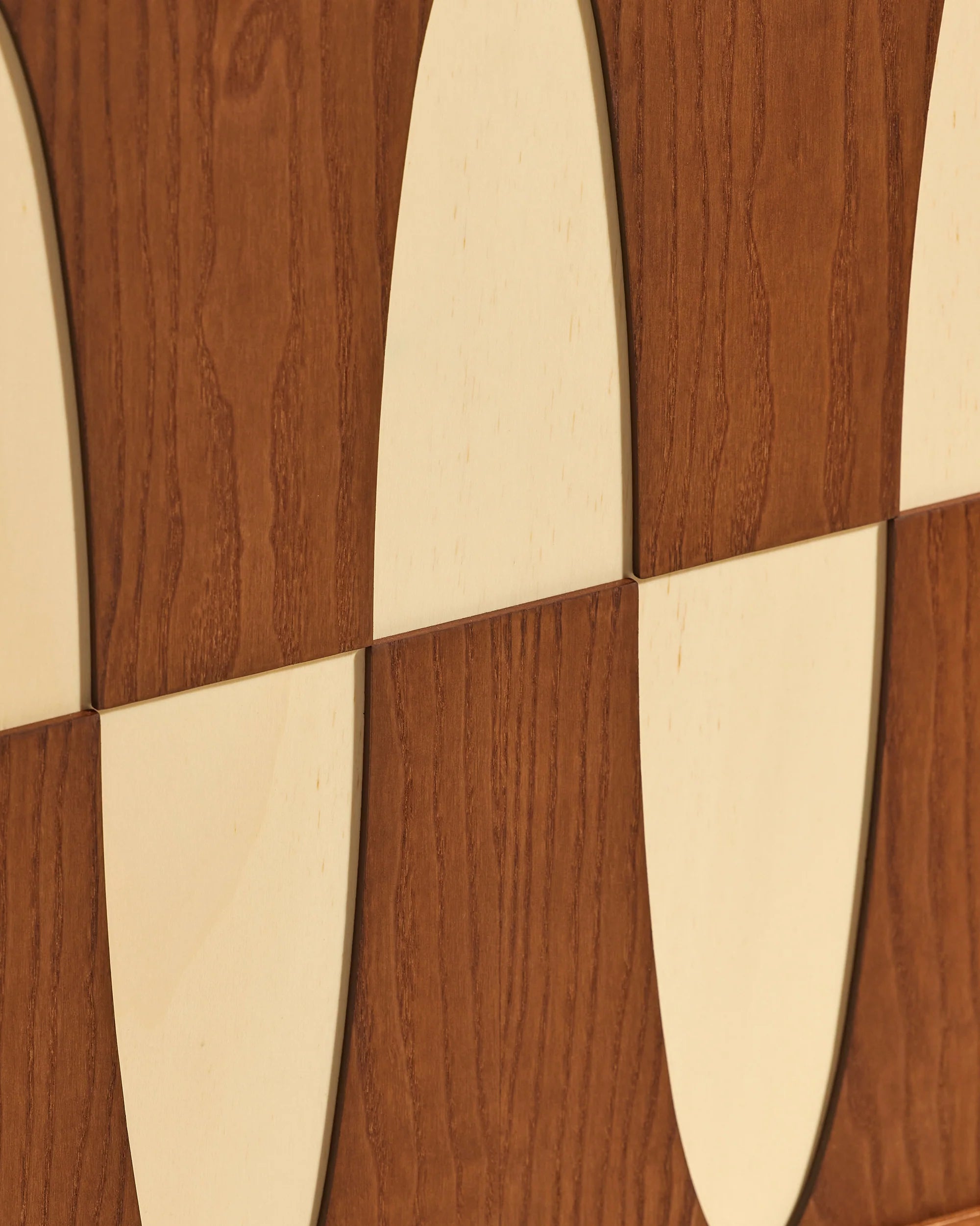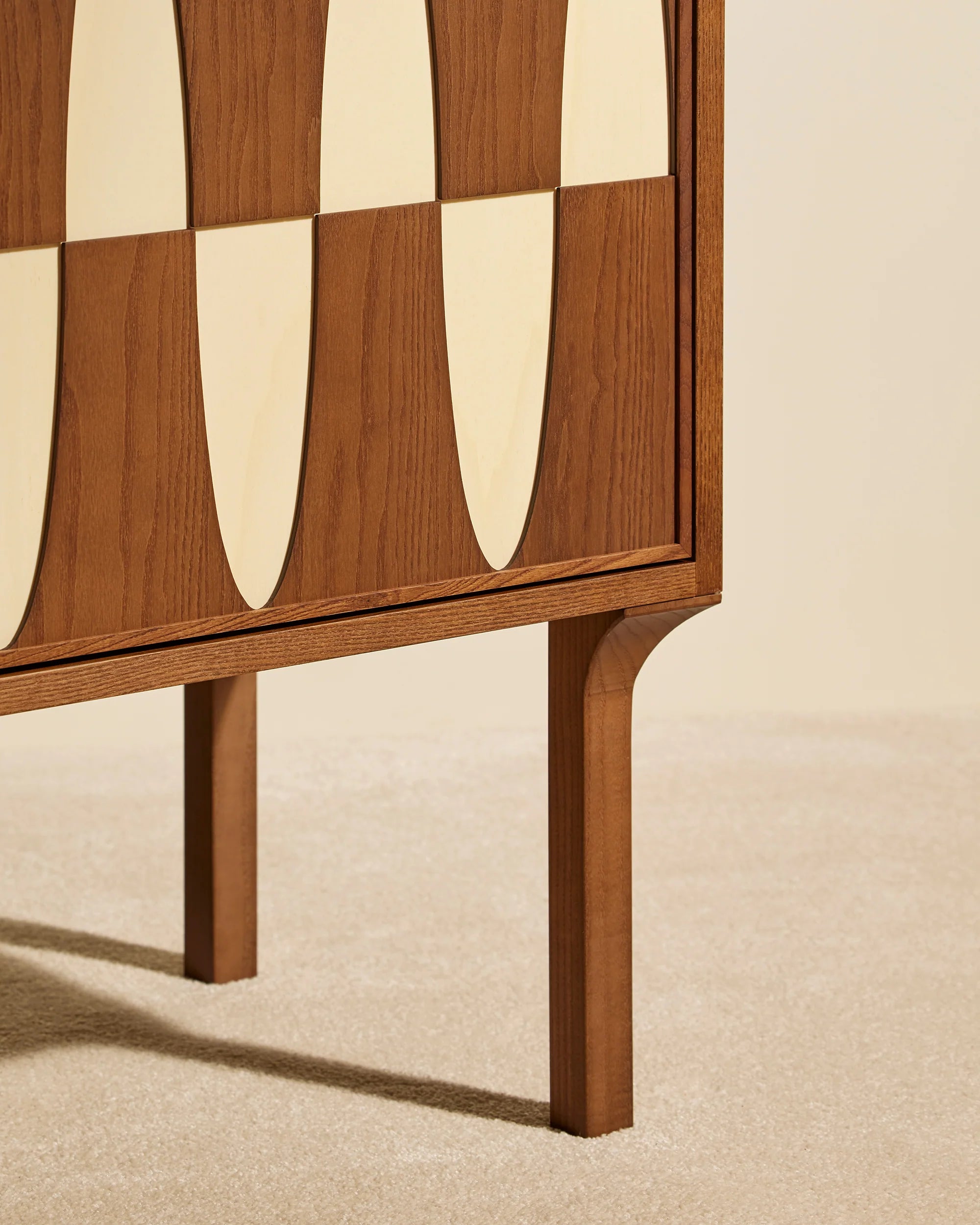 Inspired by ocean waves, the Écailles collection combines design and craftsmanship, offering a highly original combination of two wood tones. Together with the delicate legs, each piece in the collection is unique. The sideboard is crafted from walnut-stained ash, and the white motif on the front is composed of white lacquered birch.