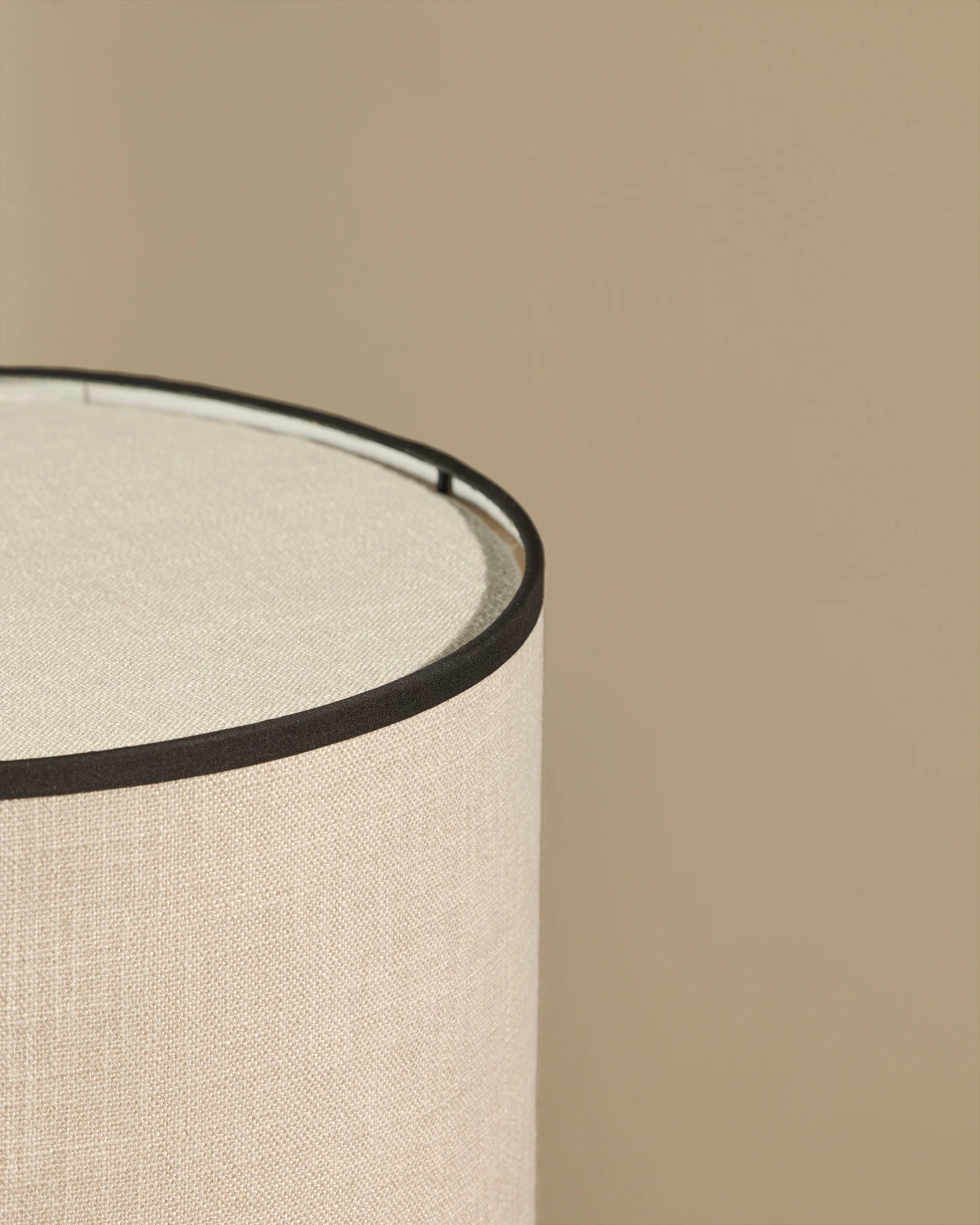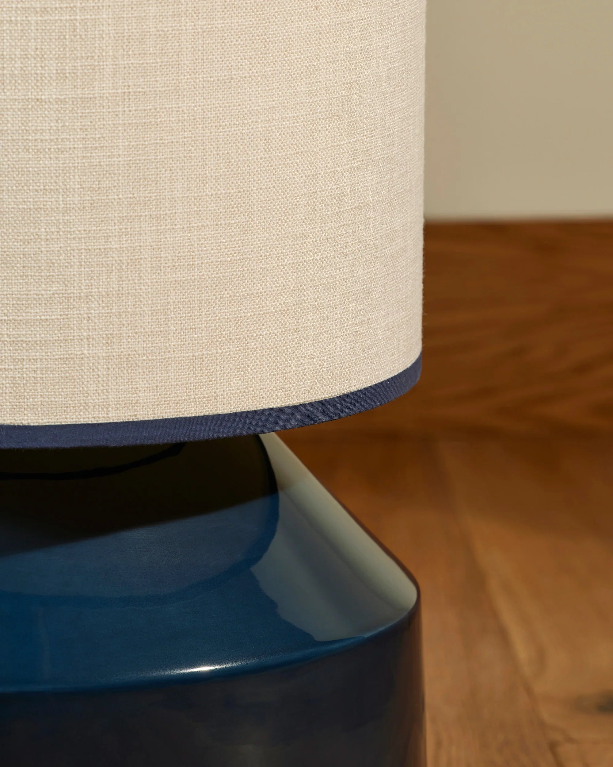A comforting silhouette and soft lighting to brighten even the most spacious or cozy rooms. Ceramic base and cotton shade with black and navy blue bands.