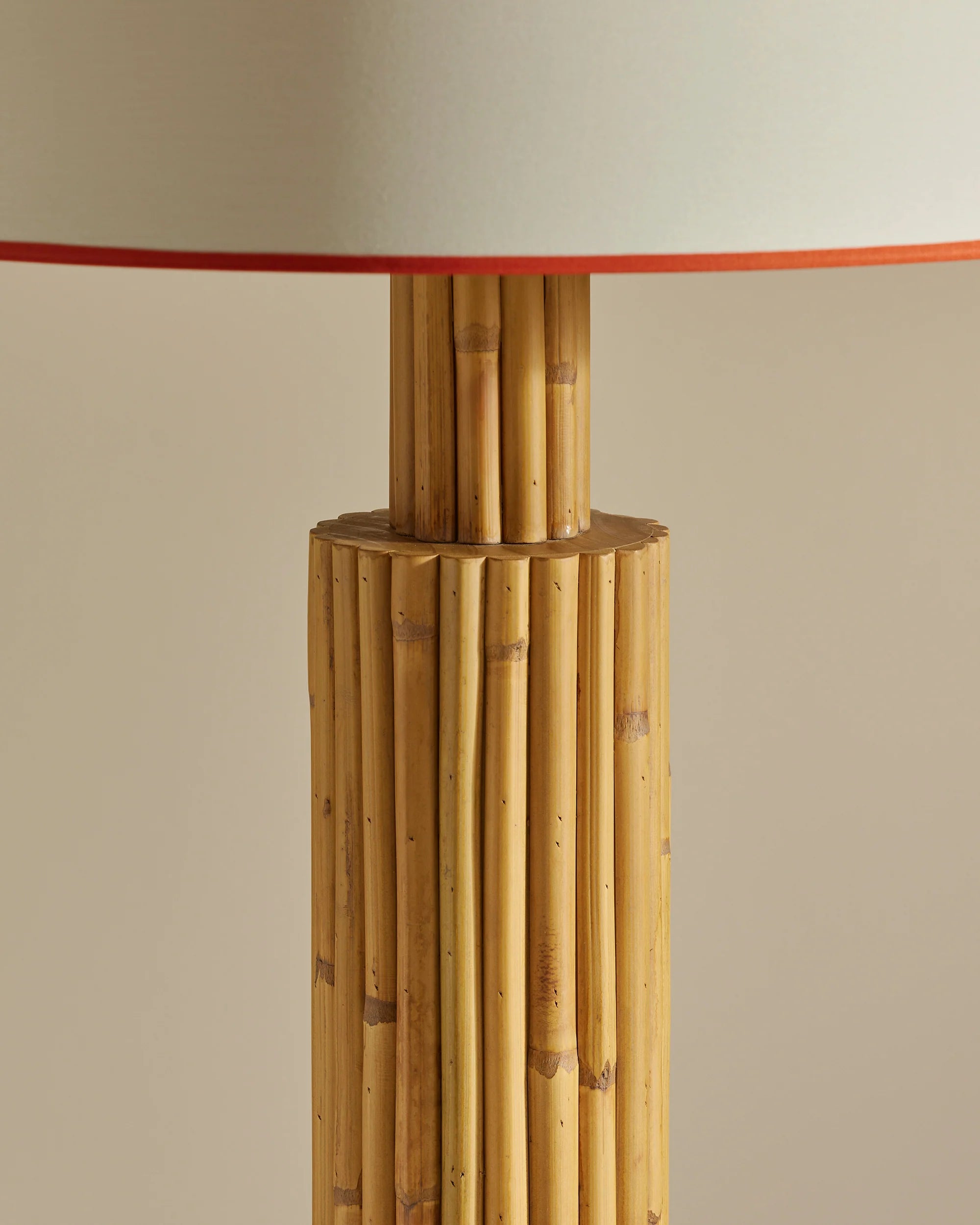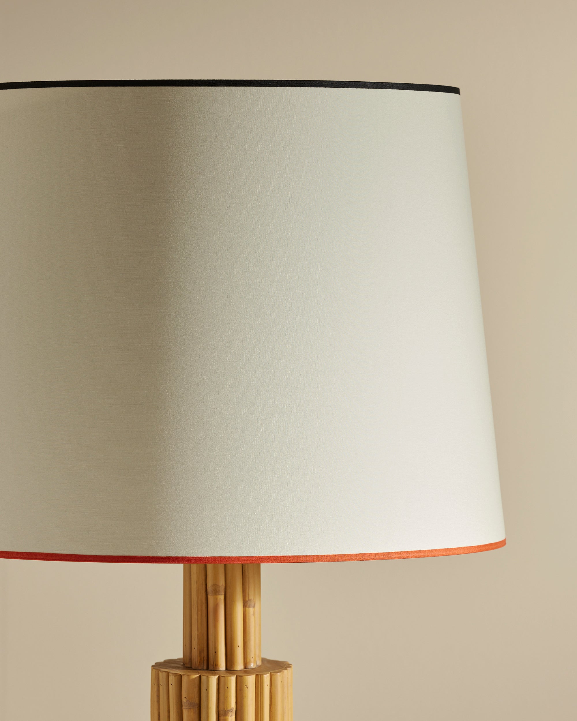 It's characterized by a mix of styles. The vintage spirit of the rattan leg is modernized by the cotton shade with black and red bands and a metal base.