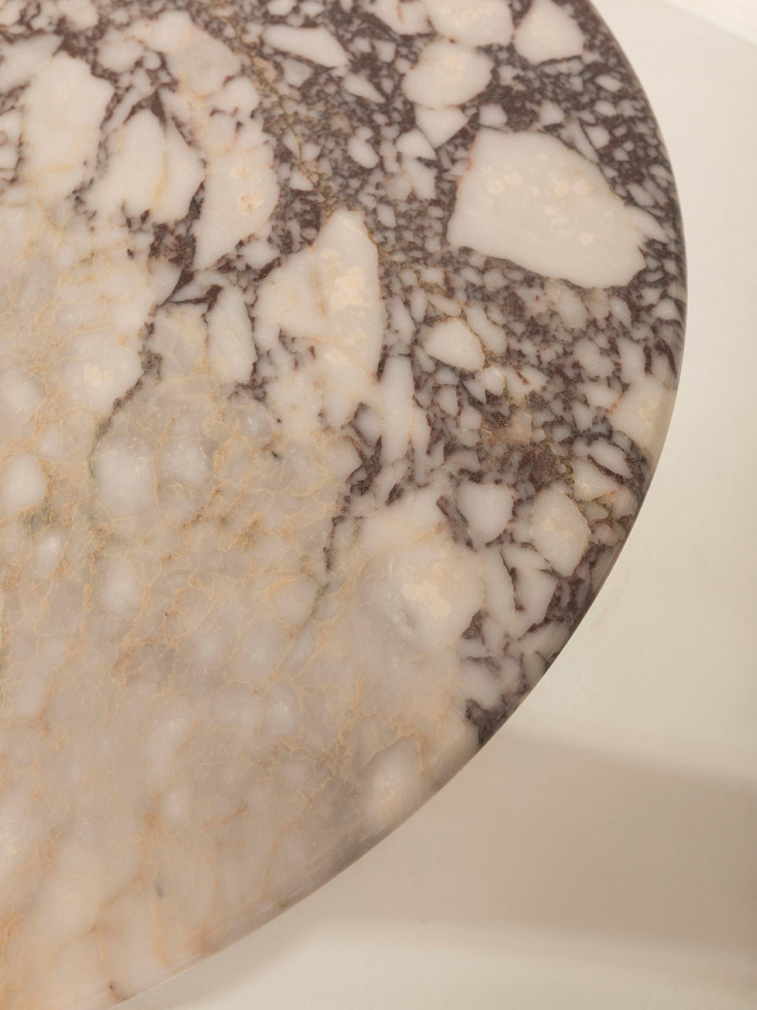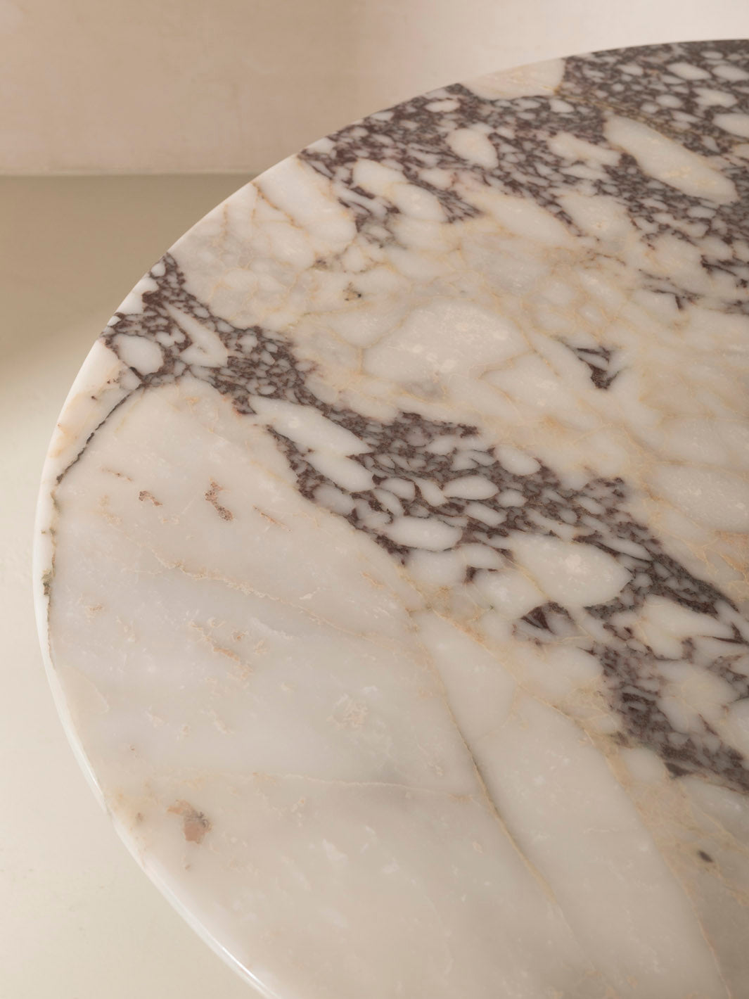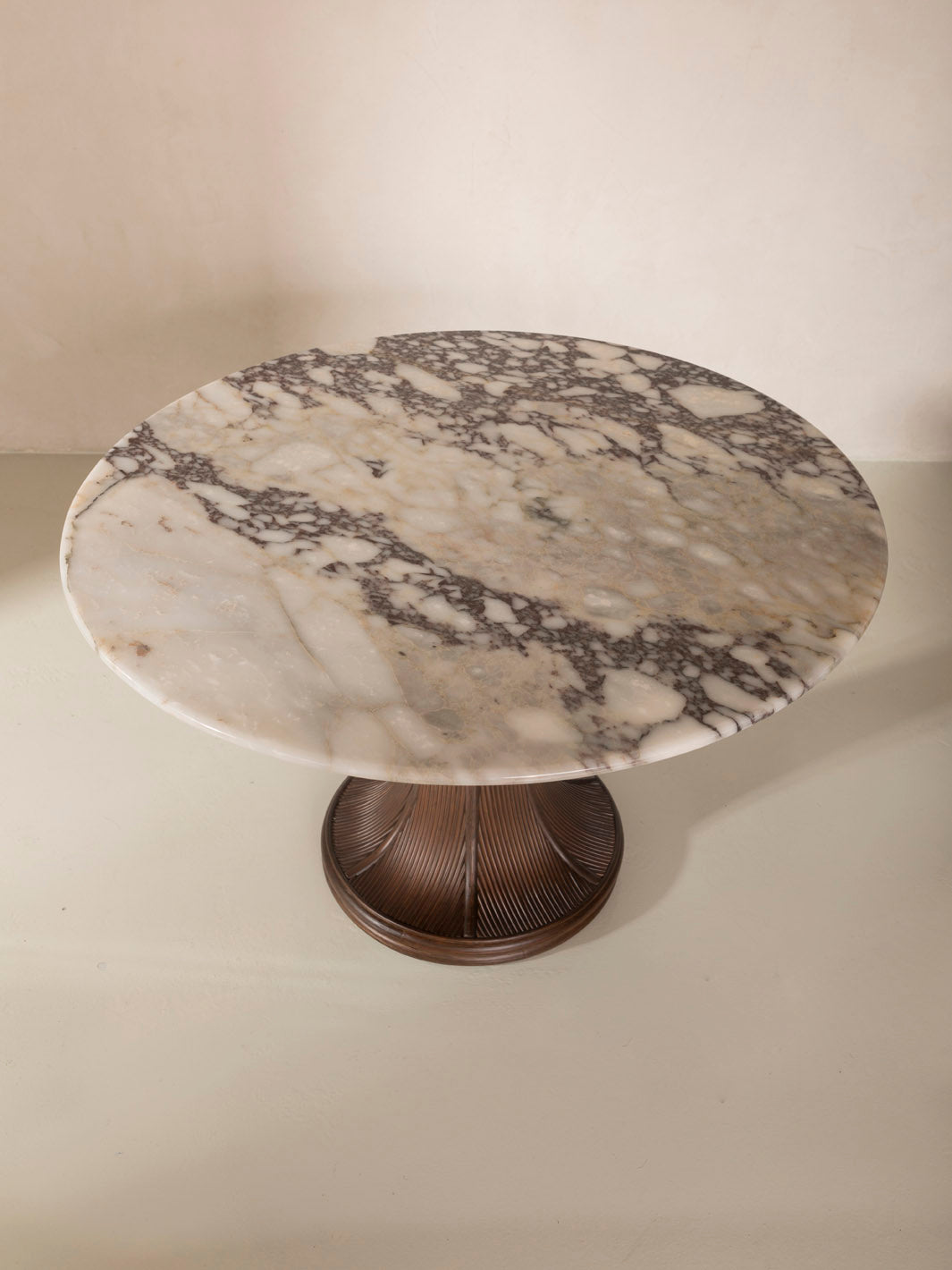 Dining table by French designer Sarah Lavoine with a Calacatta marble top in brown tones and a tinted rattan base.