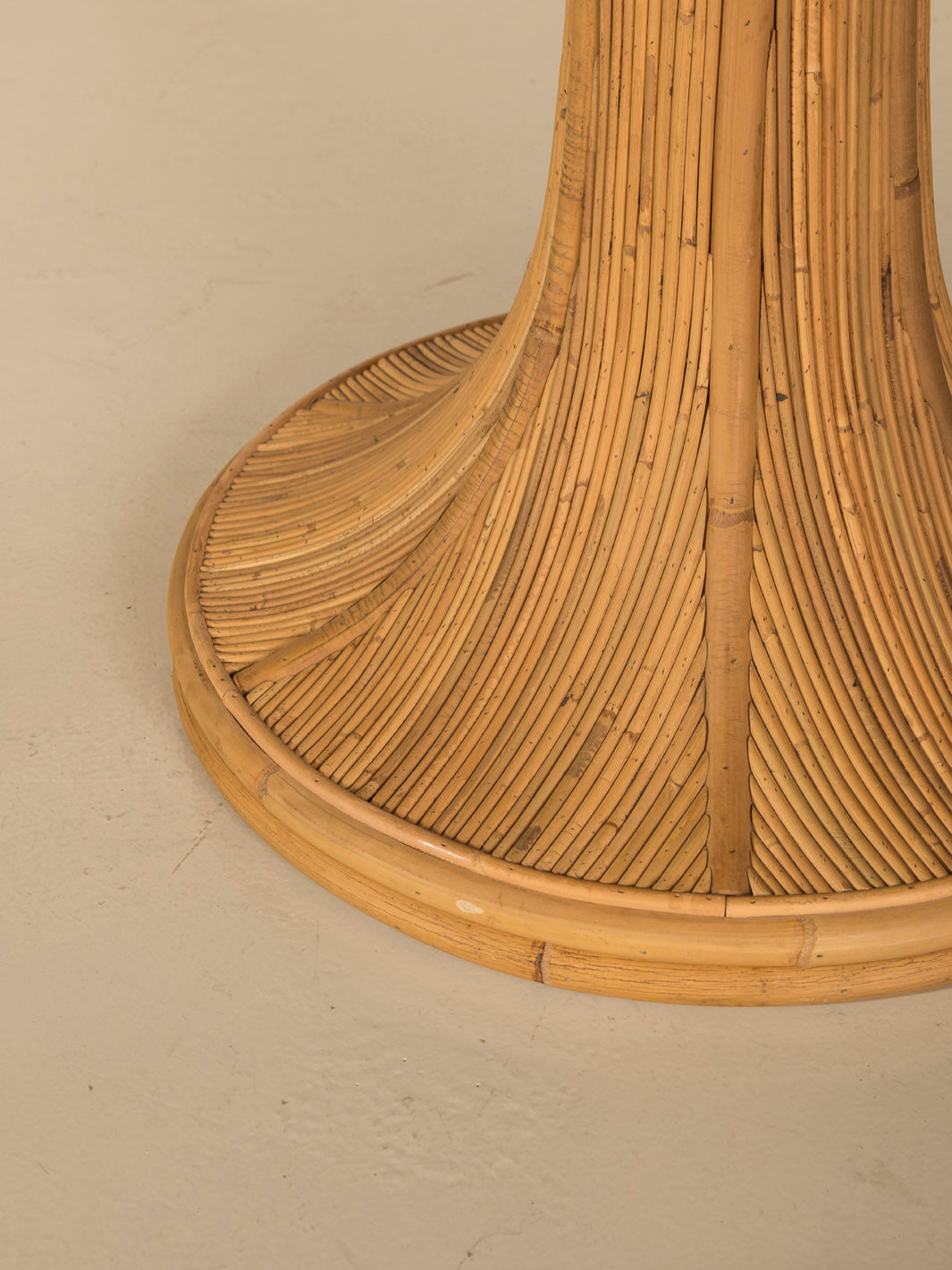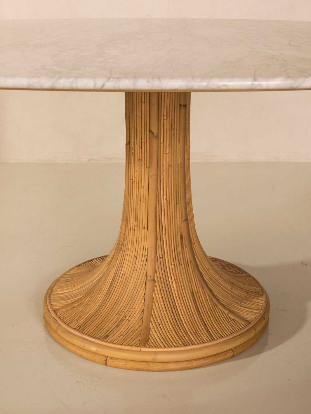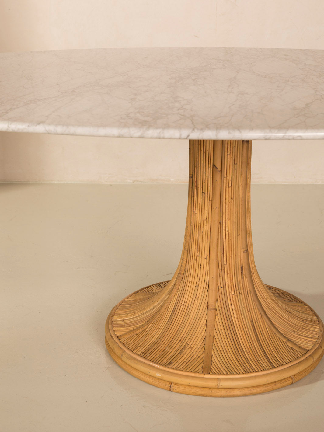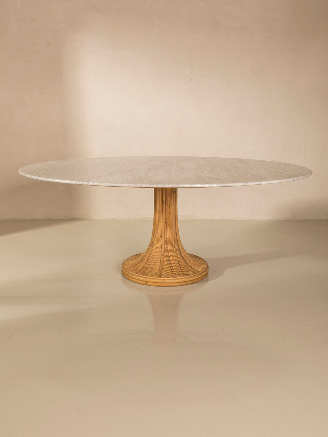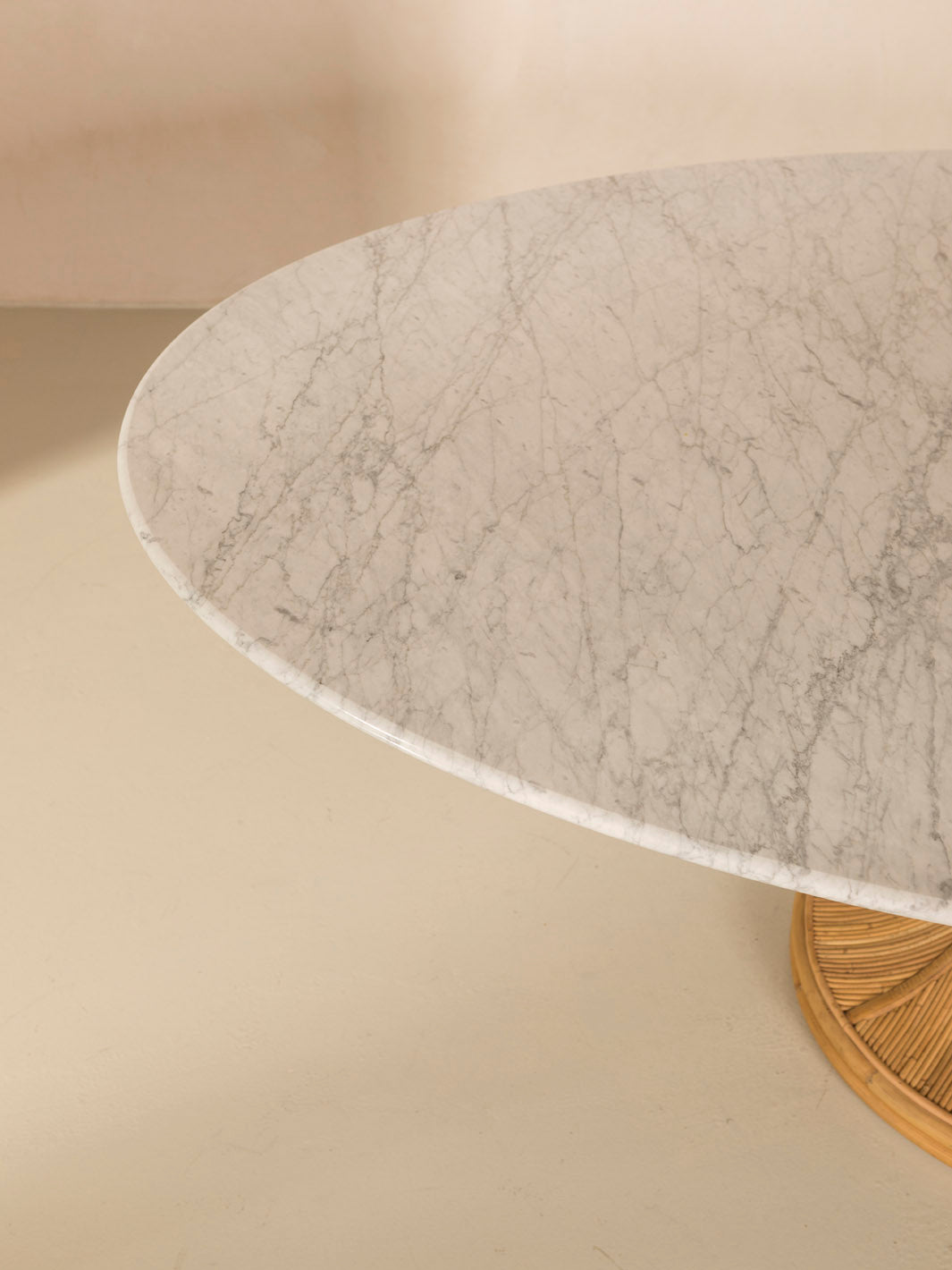 Dining table by French designer Sarah Lavoine with a Carrara marble top and rattan base.