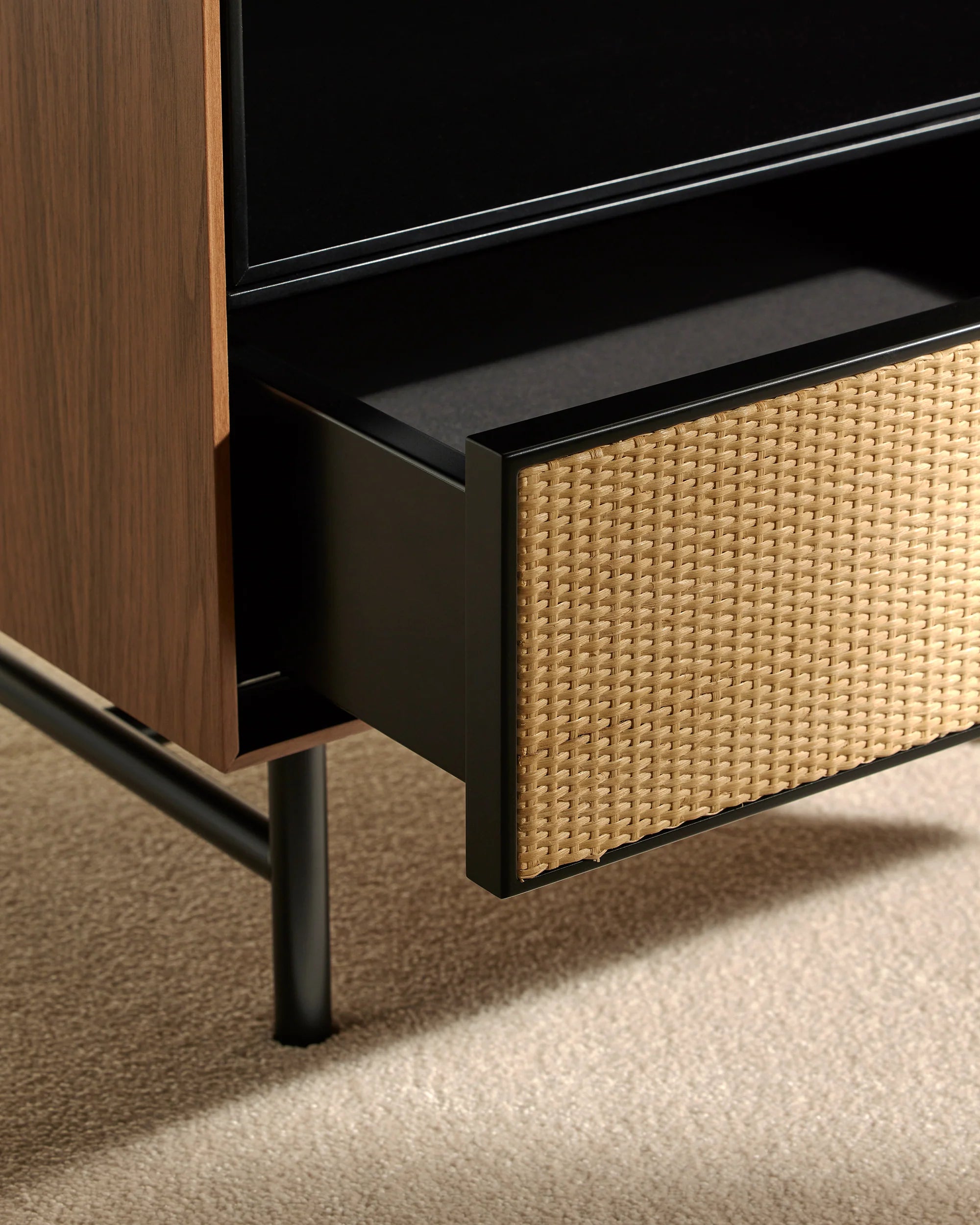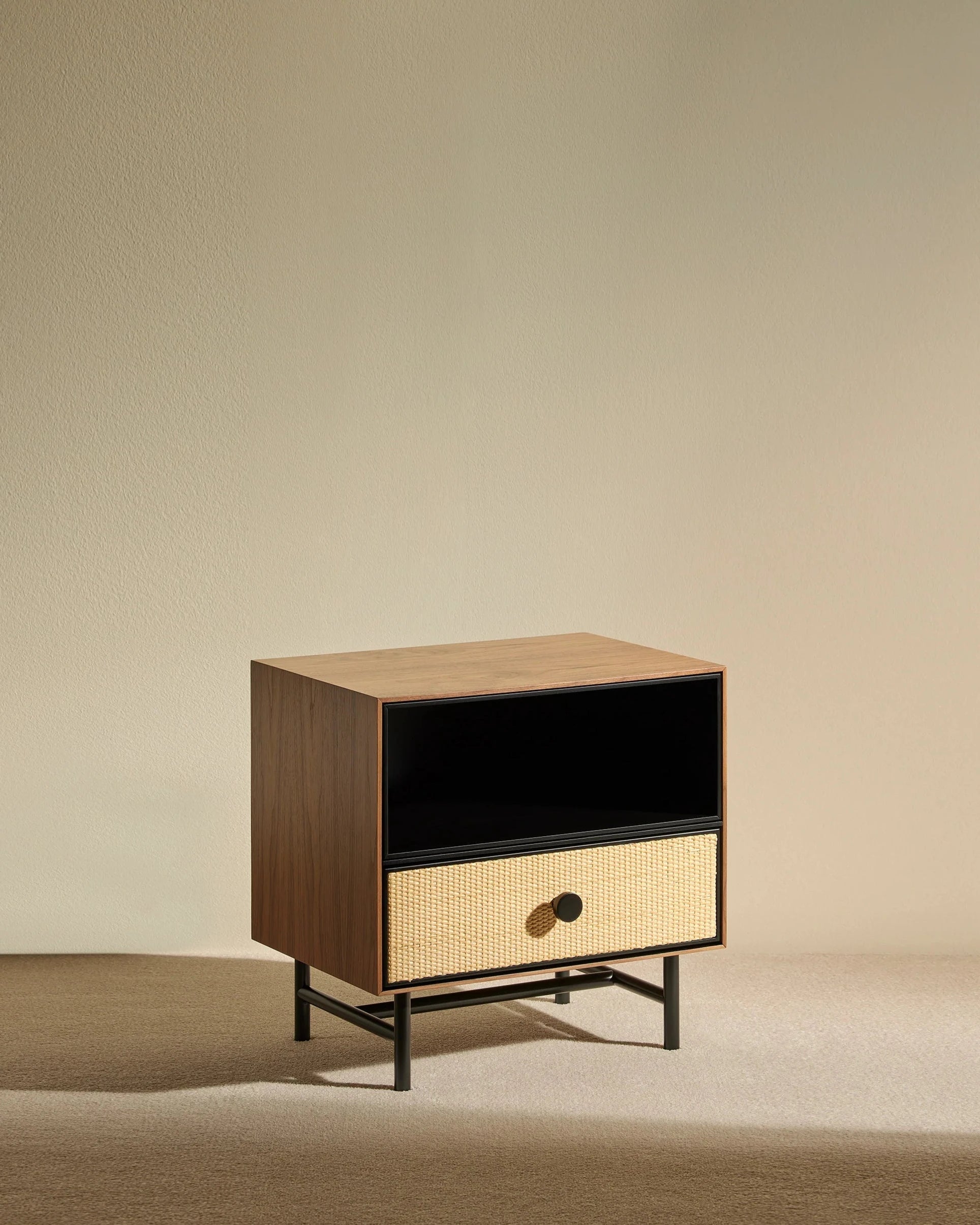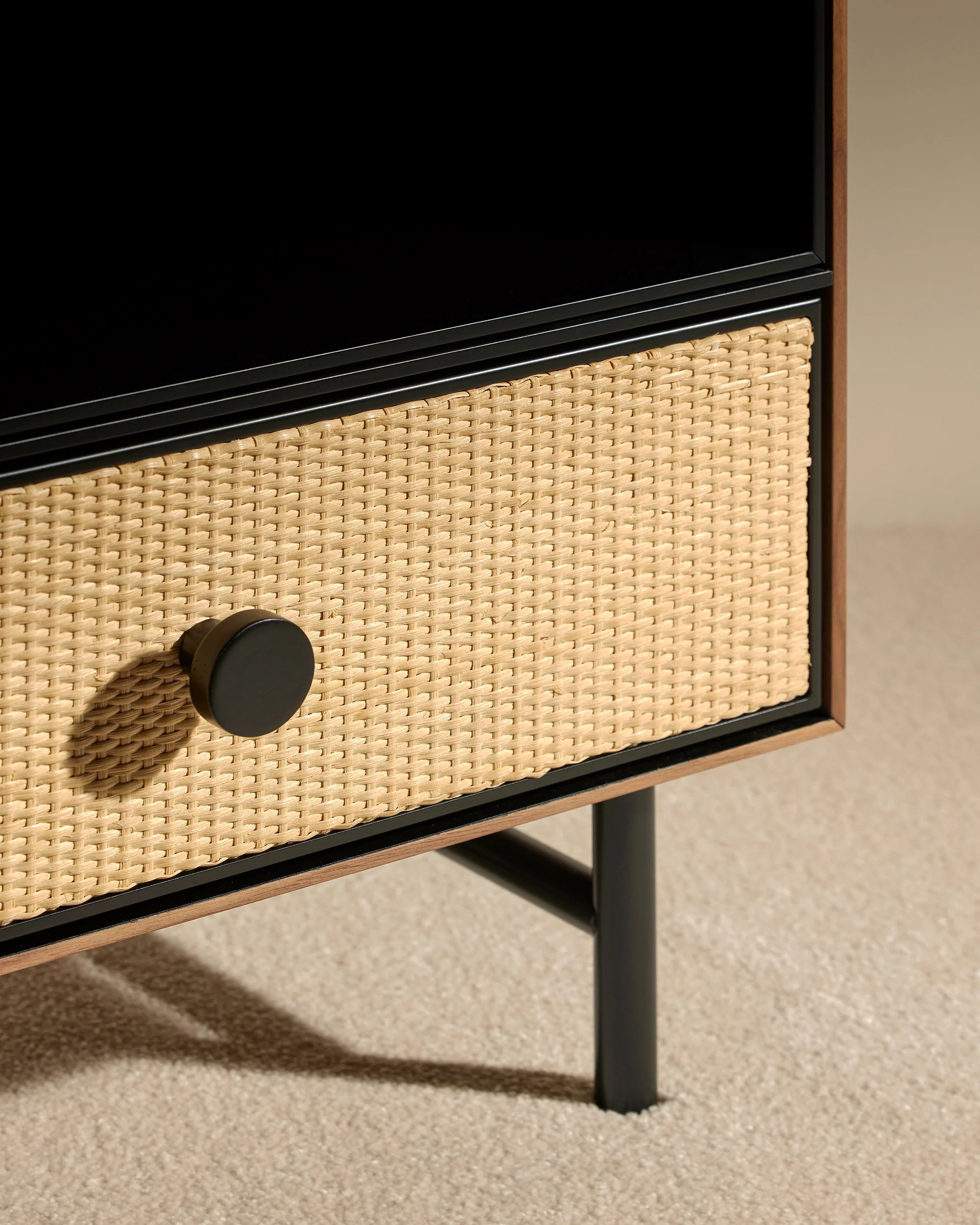 Bedside table made of blue and black lacquered wood, woven rattan and black steel. The drawer interior is made of black velvet and the handle is made of rosewood.