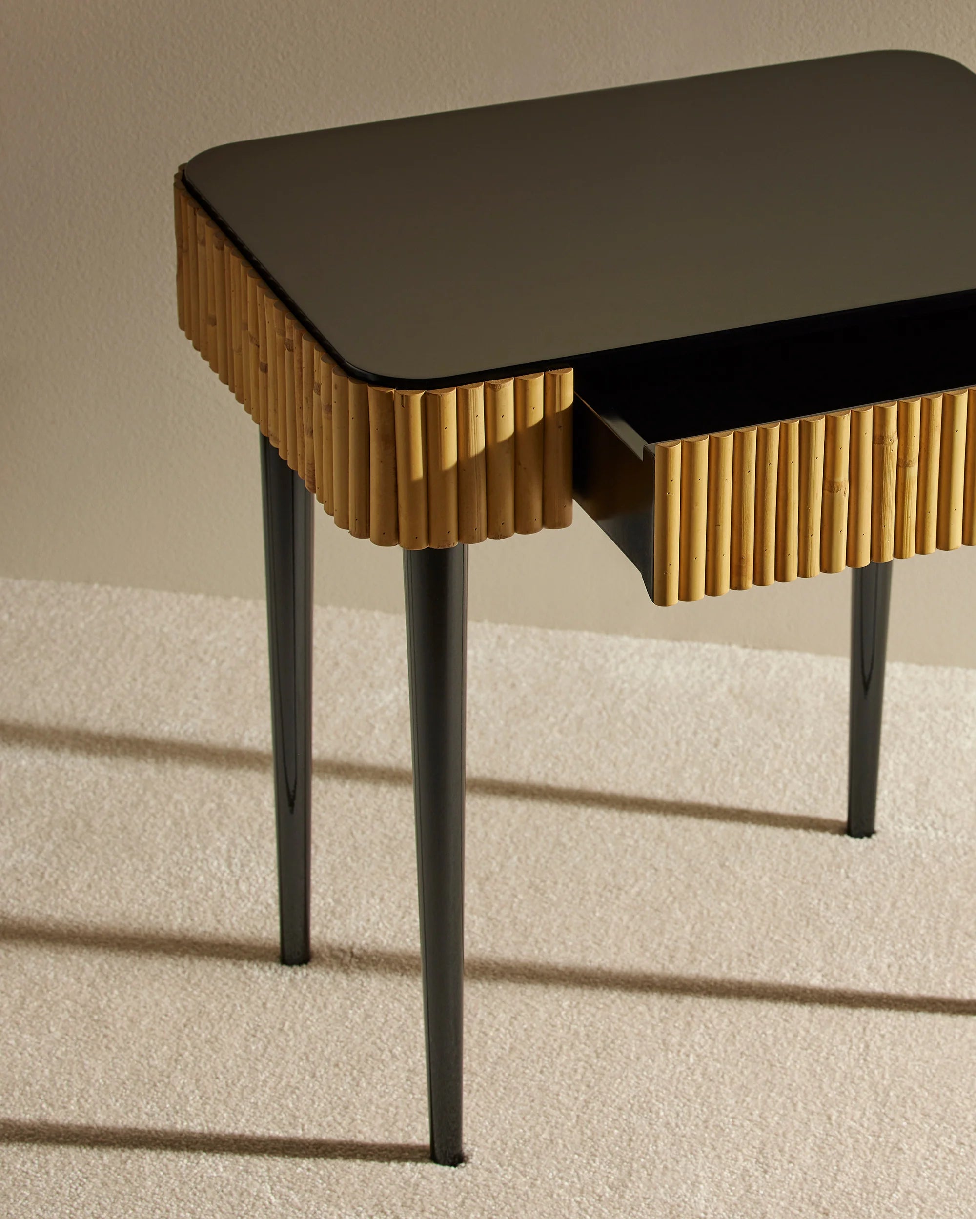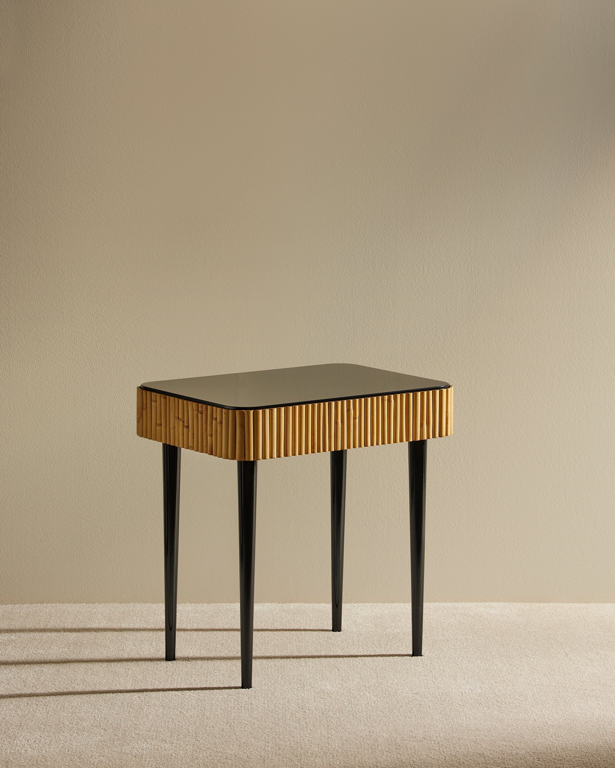 Lacquered wood and rattan bedside table with drawer by Parisian designer Sarah Lavoine.