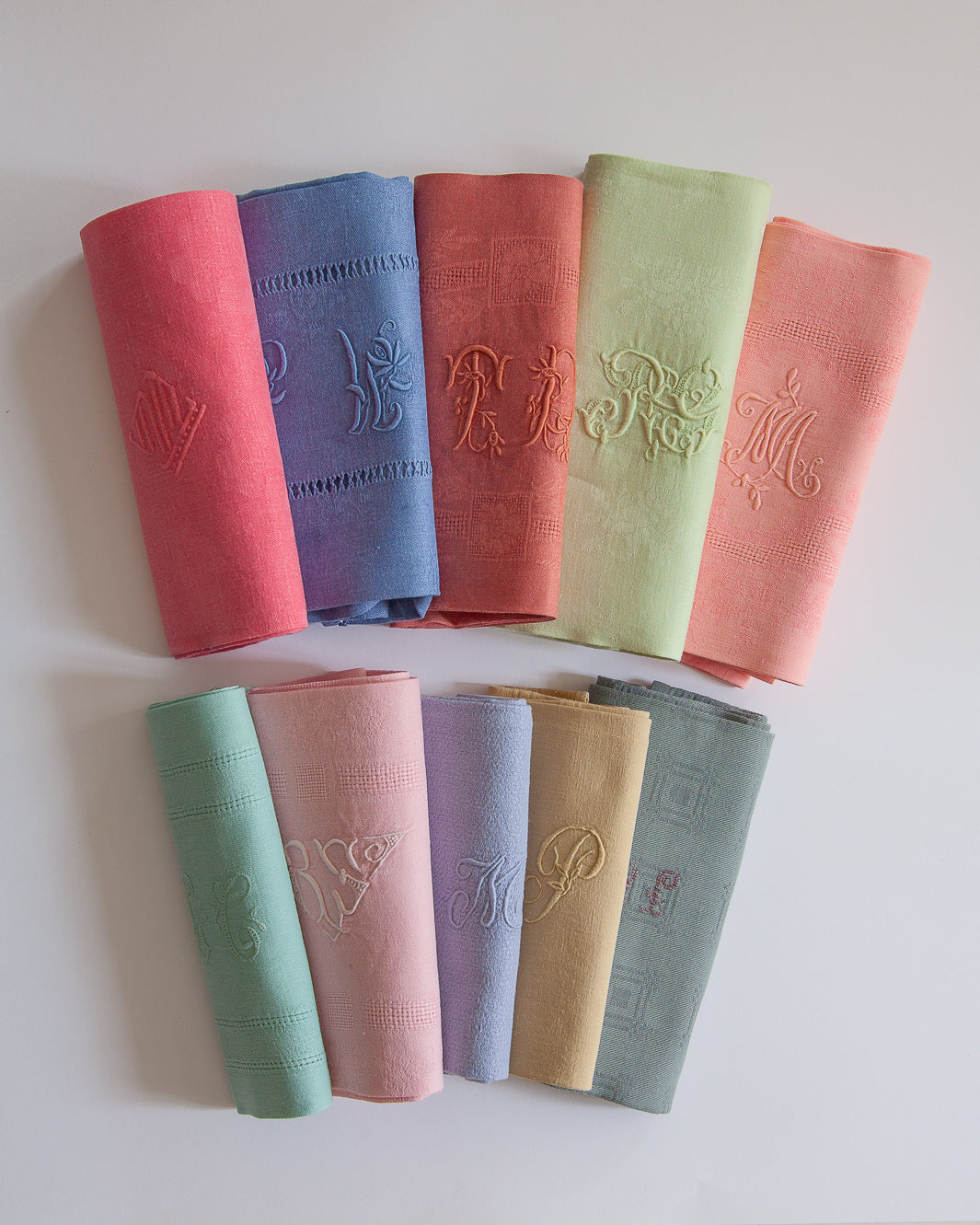 Set of 10 original French Damask napkins from the 1920s in different colors.