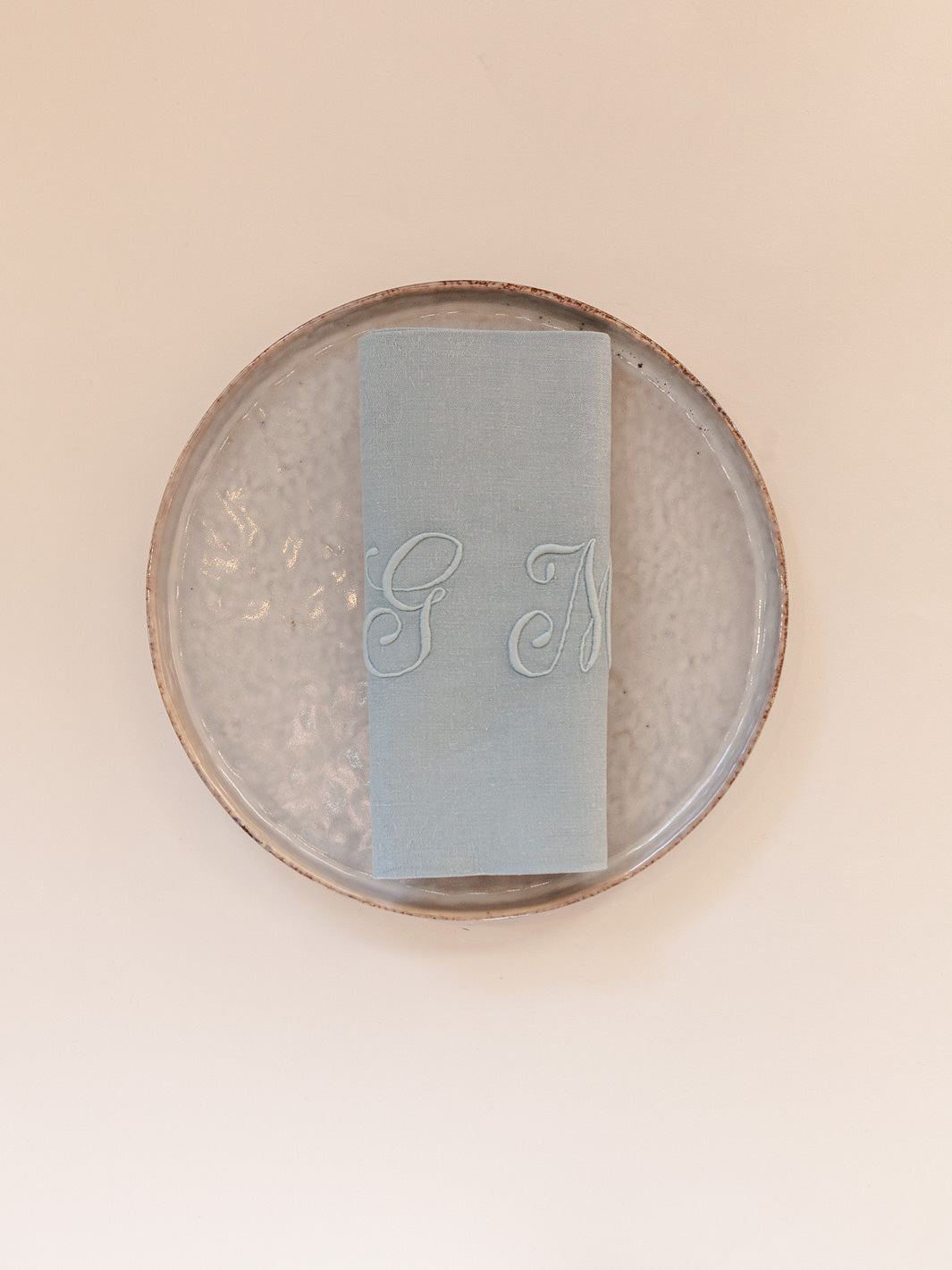 Set of 10 original 1920s French Damask napkins in dark aqua green with hand-embroidered GM initials.