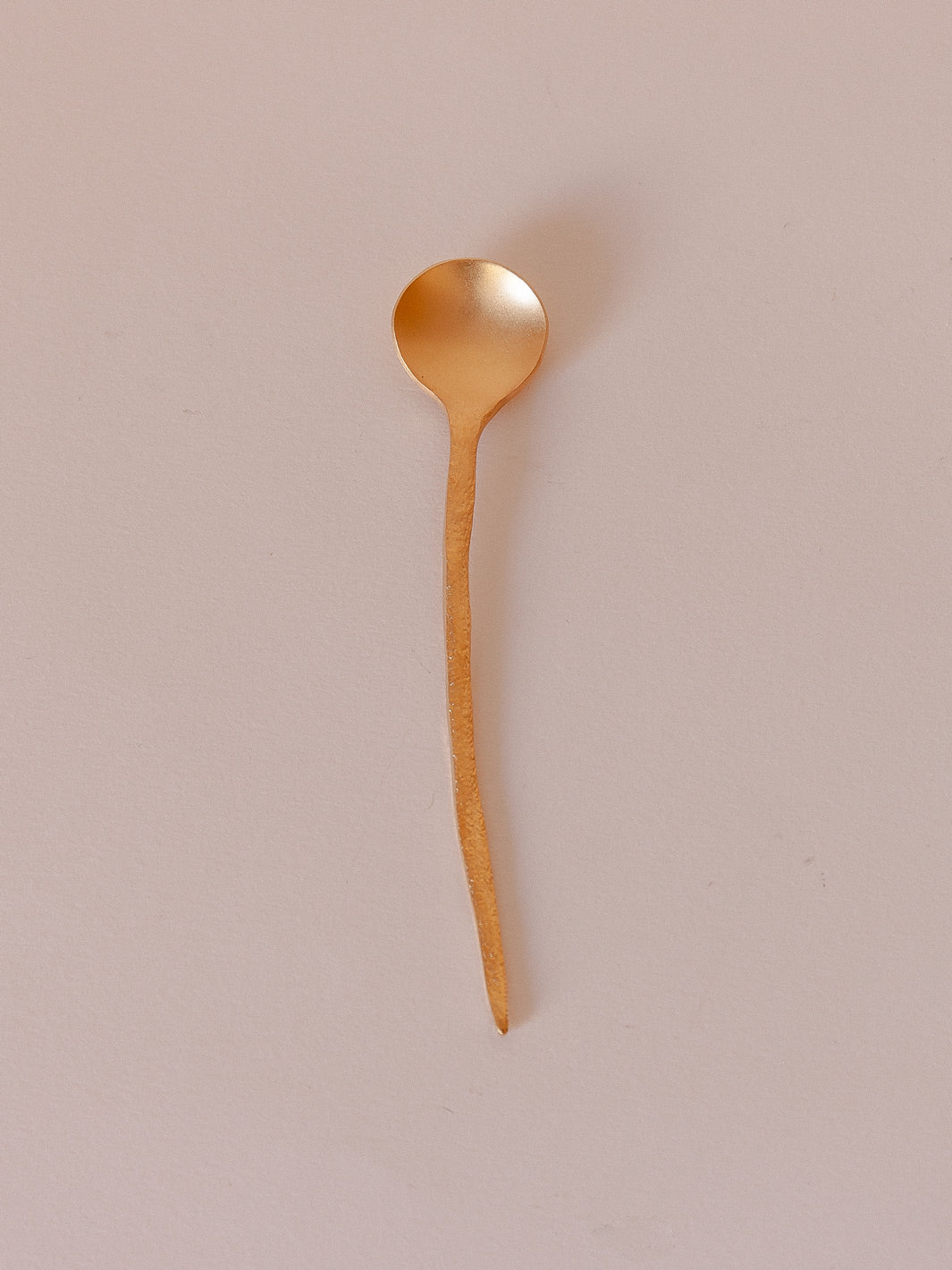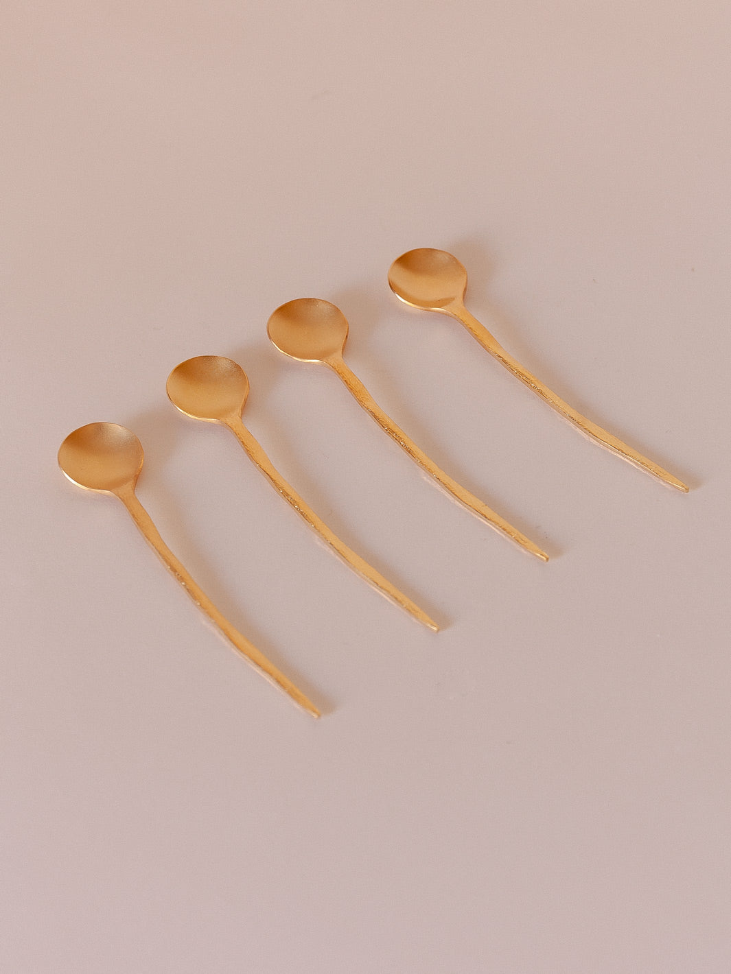 Set of 4 golden Serax teaspoons designed by the artist Roos Van de Velde .