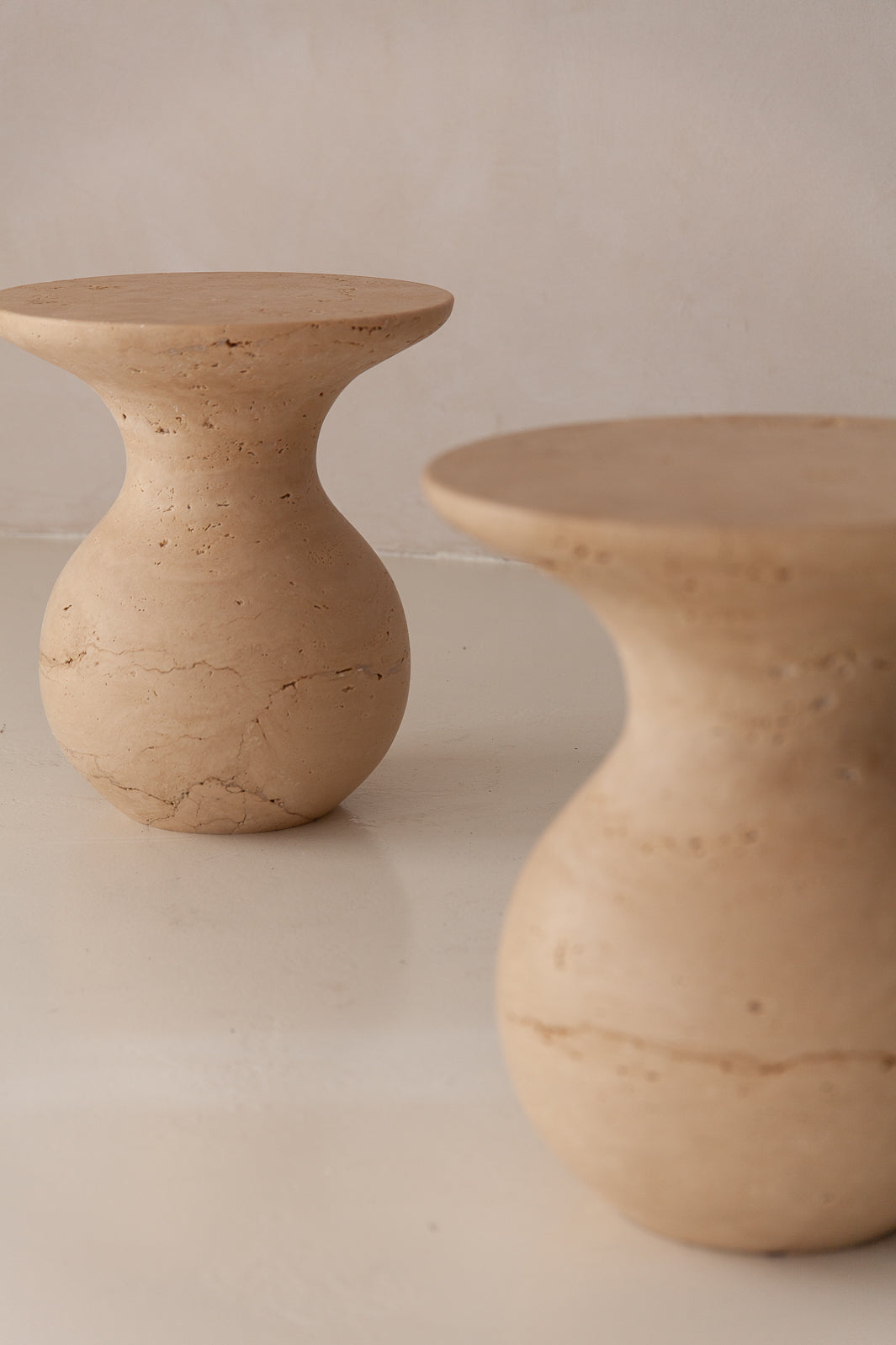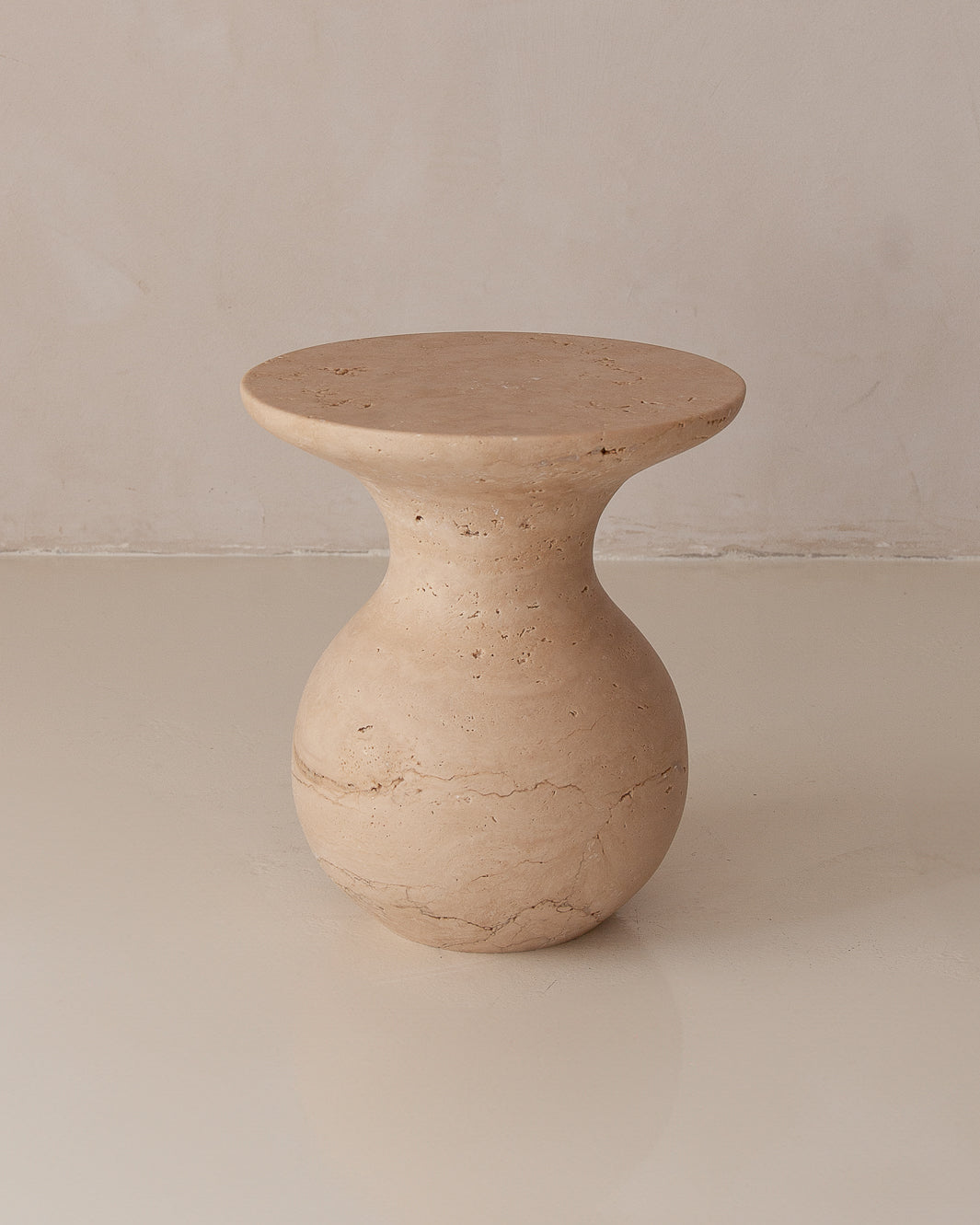 Handcrafted travertine side table, originally from Italy. Its design highlights the stone's natural beauty.