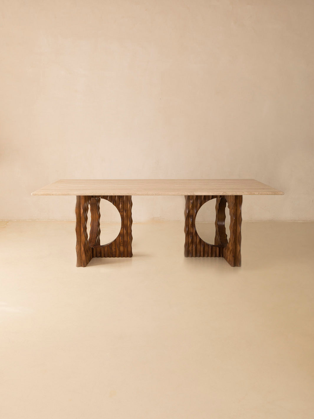 Dining table with polished travertine top and hand-carved ash wood base in cubic and spherical shapes.