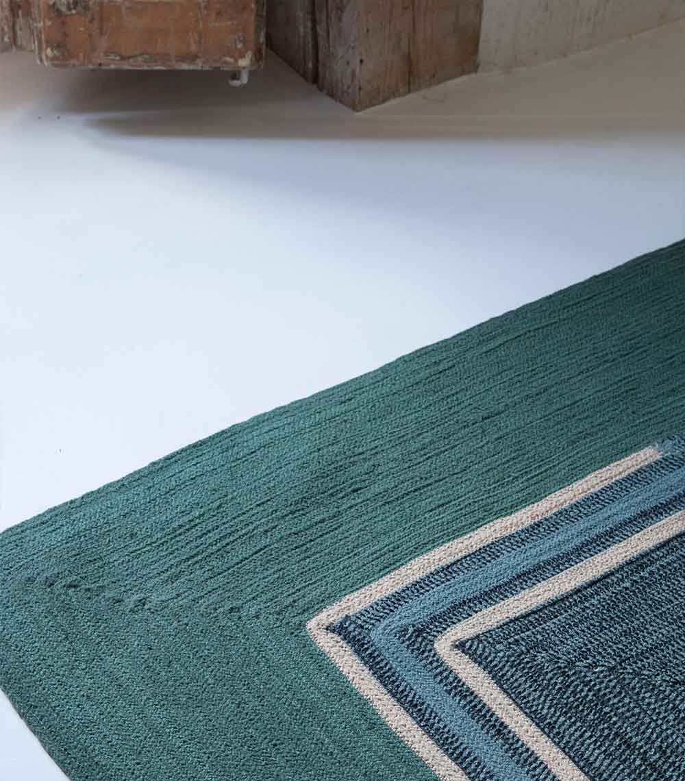 Green rug from the French brand Élitis with stripes and a non-slip latex backing. It's made from 88% PET (recycled material from plastic bottles). It feels so pleasant to the touch, you'll want to walk barefoot on it.
