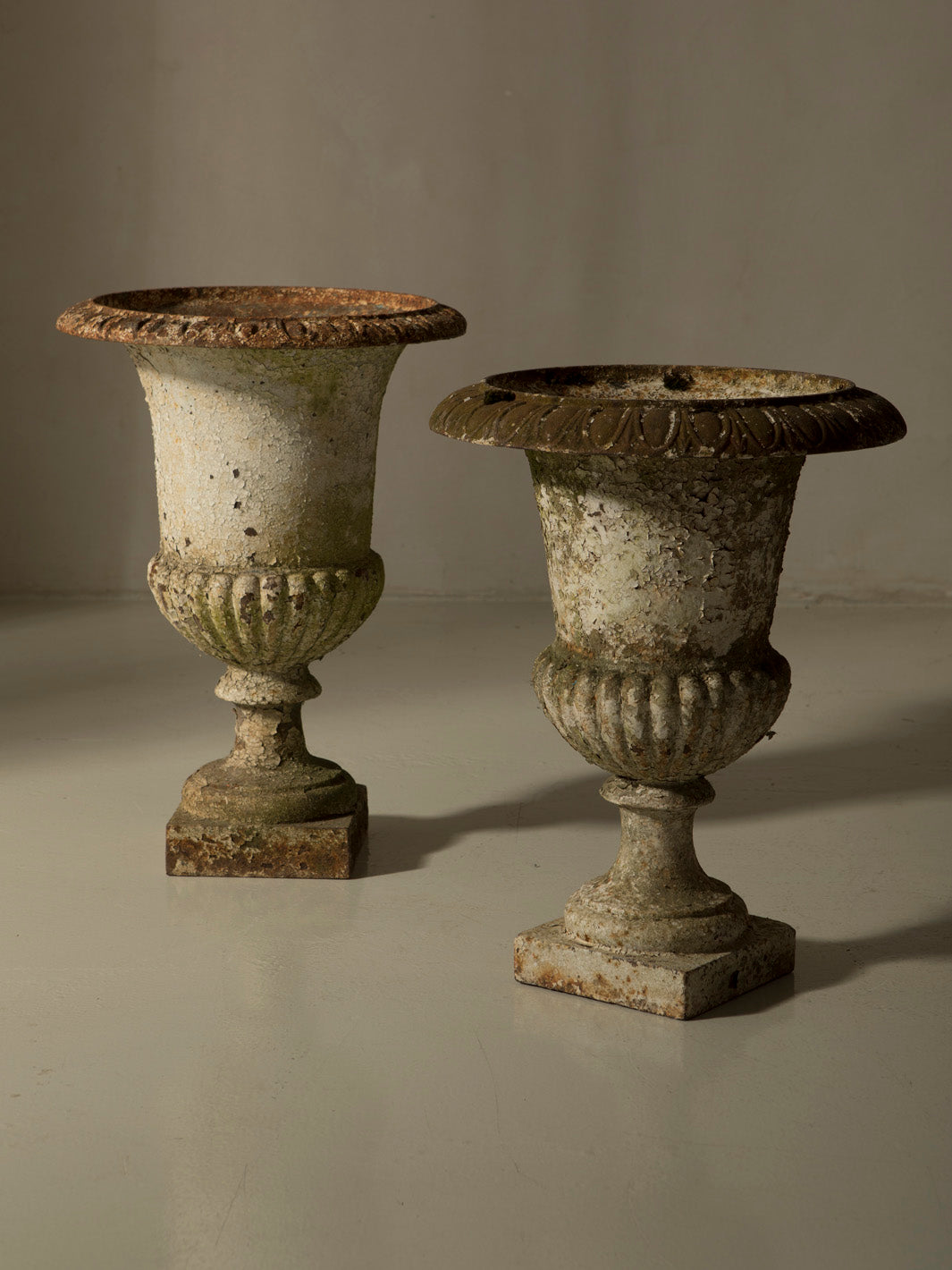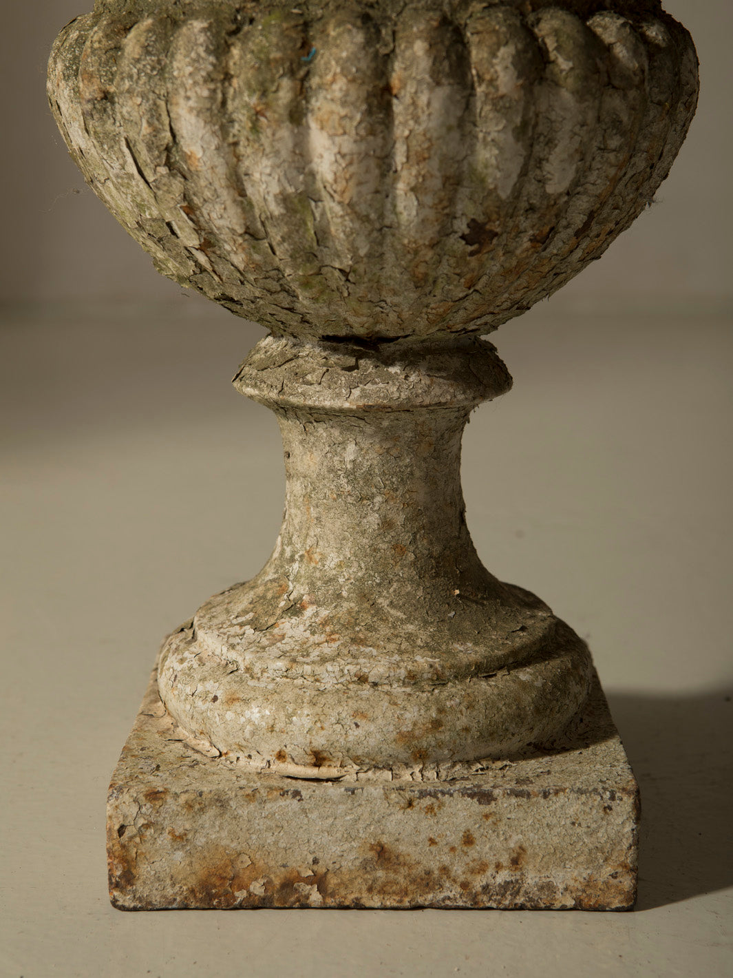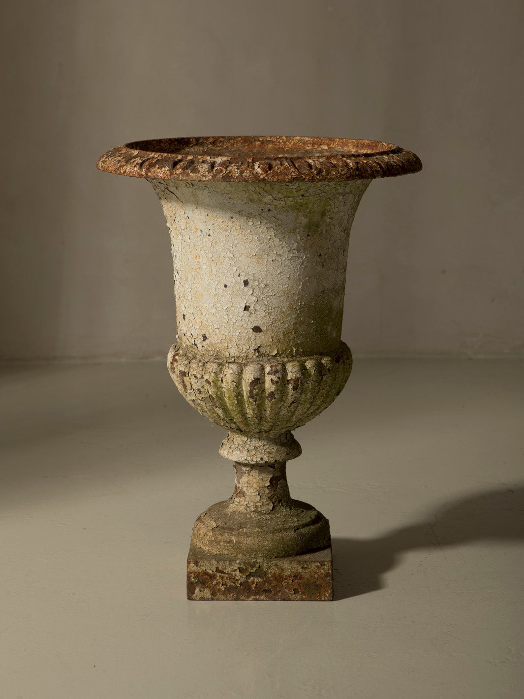 This imposing cast iron goblet is an original 19th-century piece from France. With a classic silhouette and balanced proportions, it stands on a square base that leads to a fluted body and a wide mouth with a delicate carved rim, details that evoke the neoclassical aesthetic typical of the grand residences and gardens of the period.