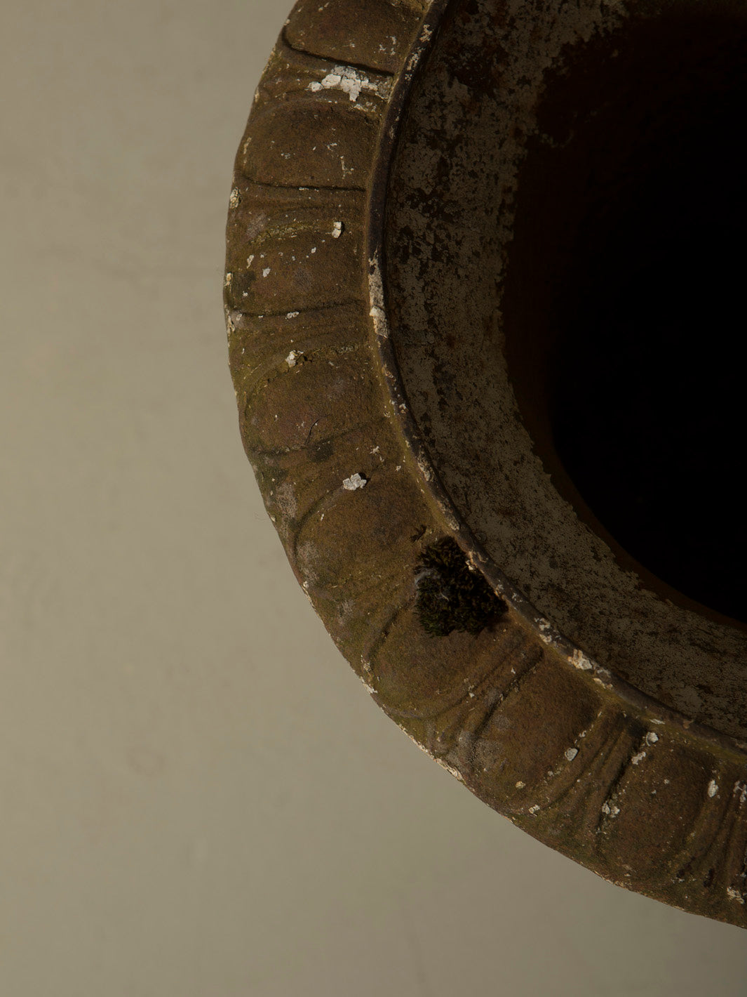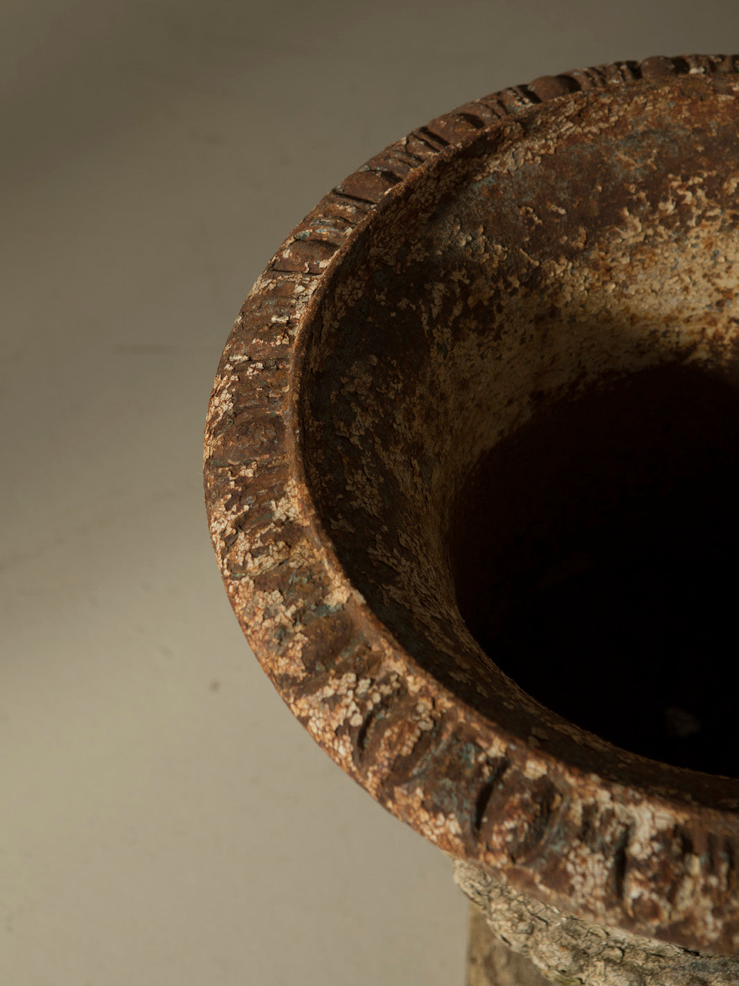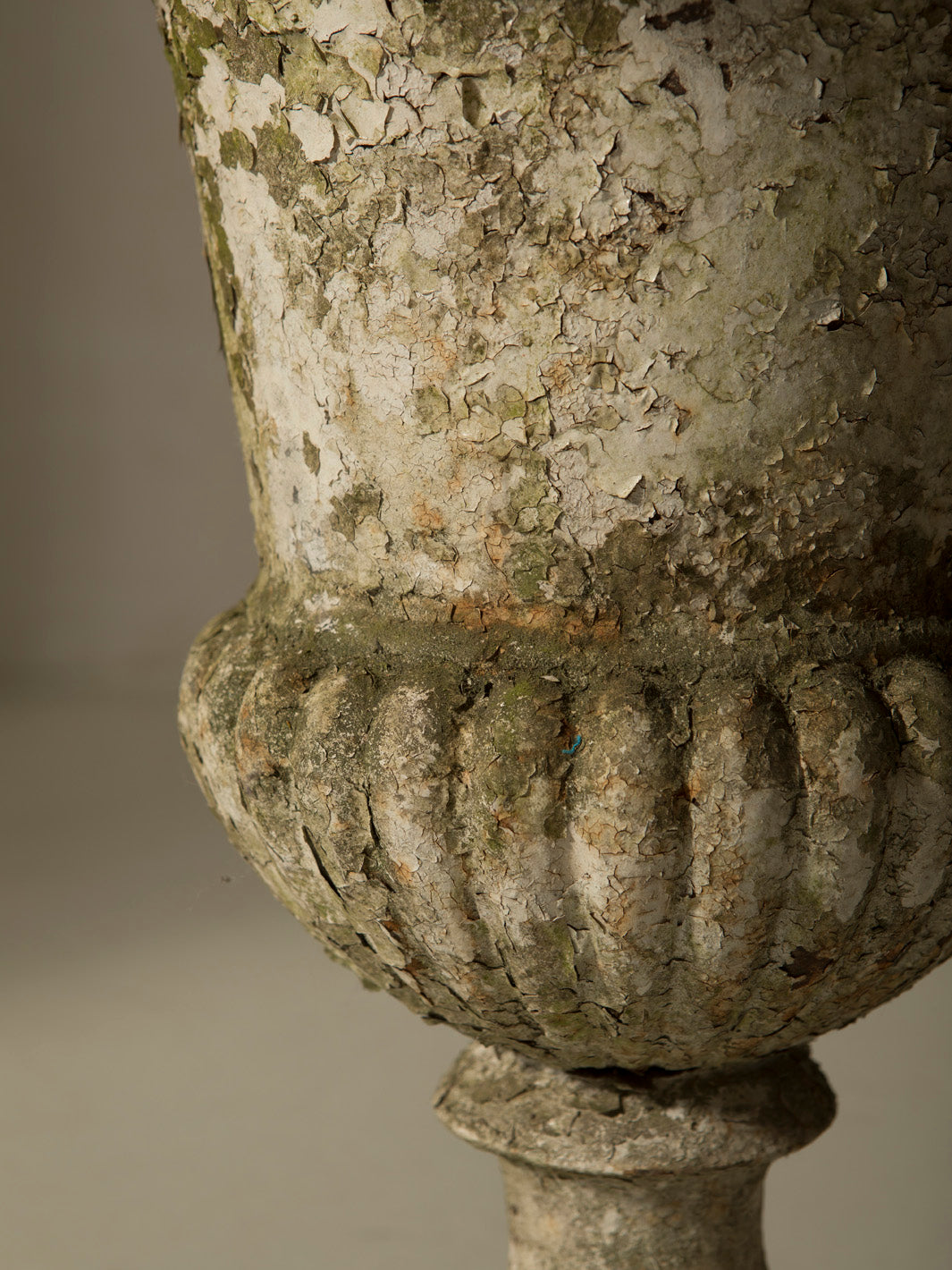 This imposing cast iron goblet is an original 19th-century piece from France. With a classic silhouette and balanced proportions, it stands on a square base that leads to a fluted body and a wide mouth with a delicate carved rim, details that evoke the neoclassical aesthetic typical of the grand residences and gardens of the period.