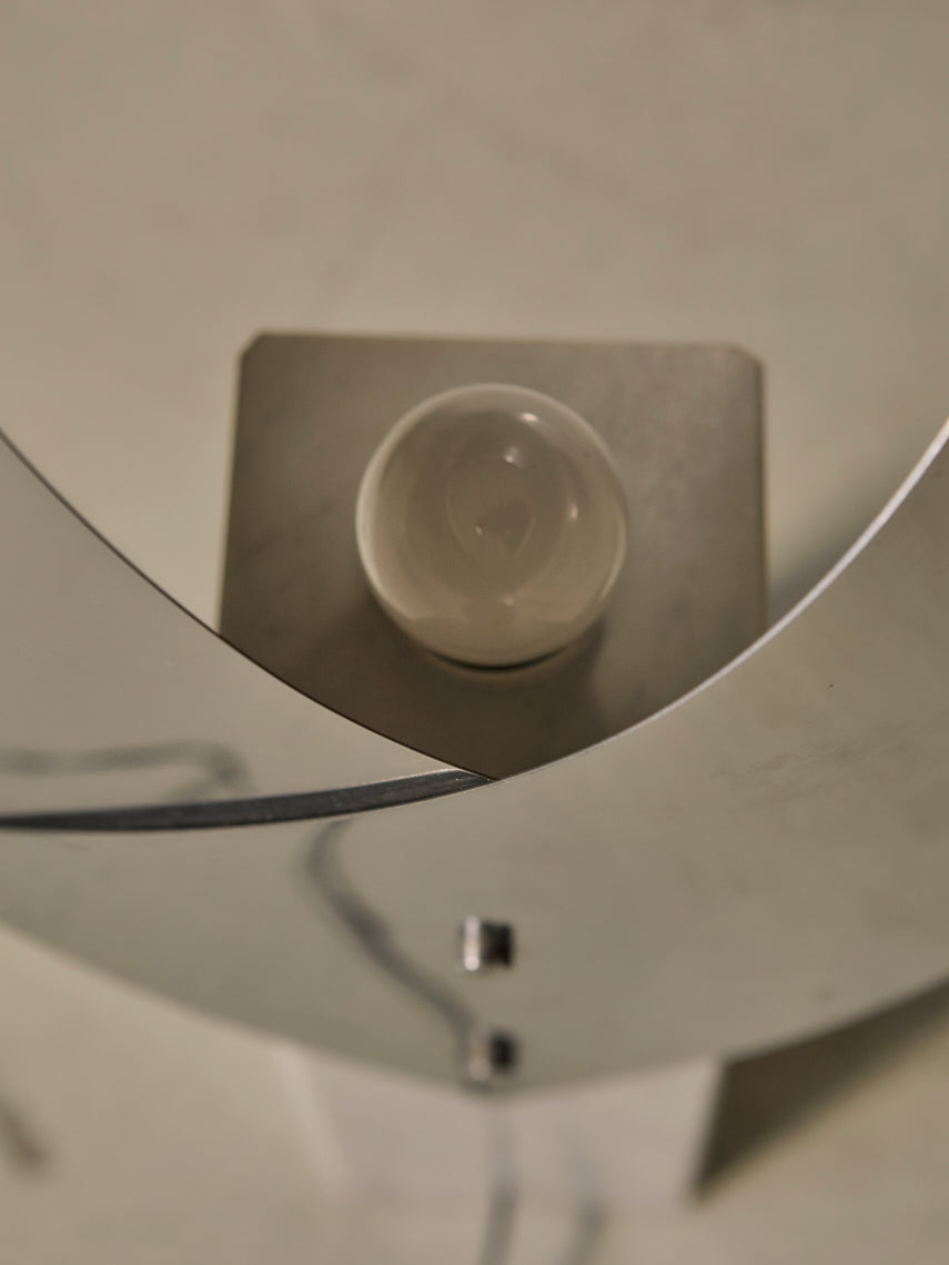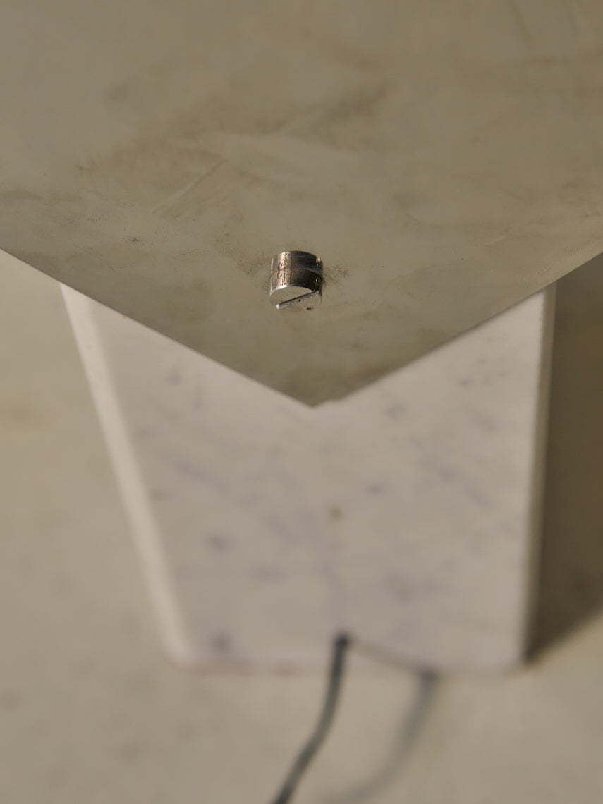 Particularly designed lamp from the 70s with a Carrara marble base and an original curved metal shade from Italy.