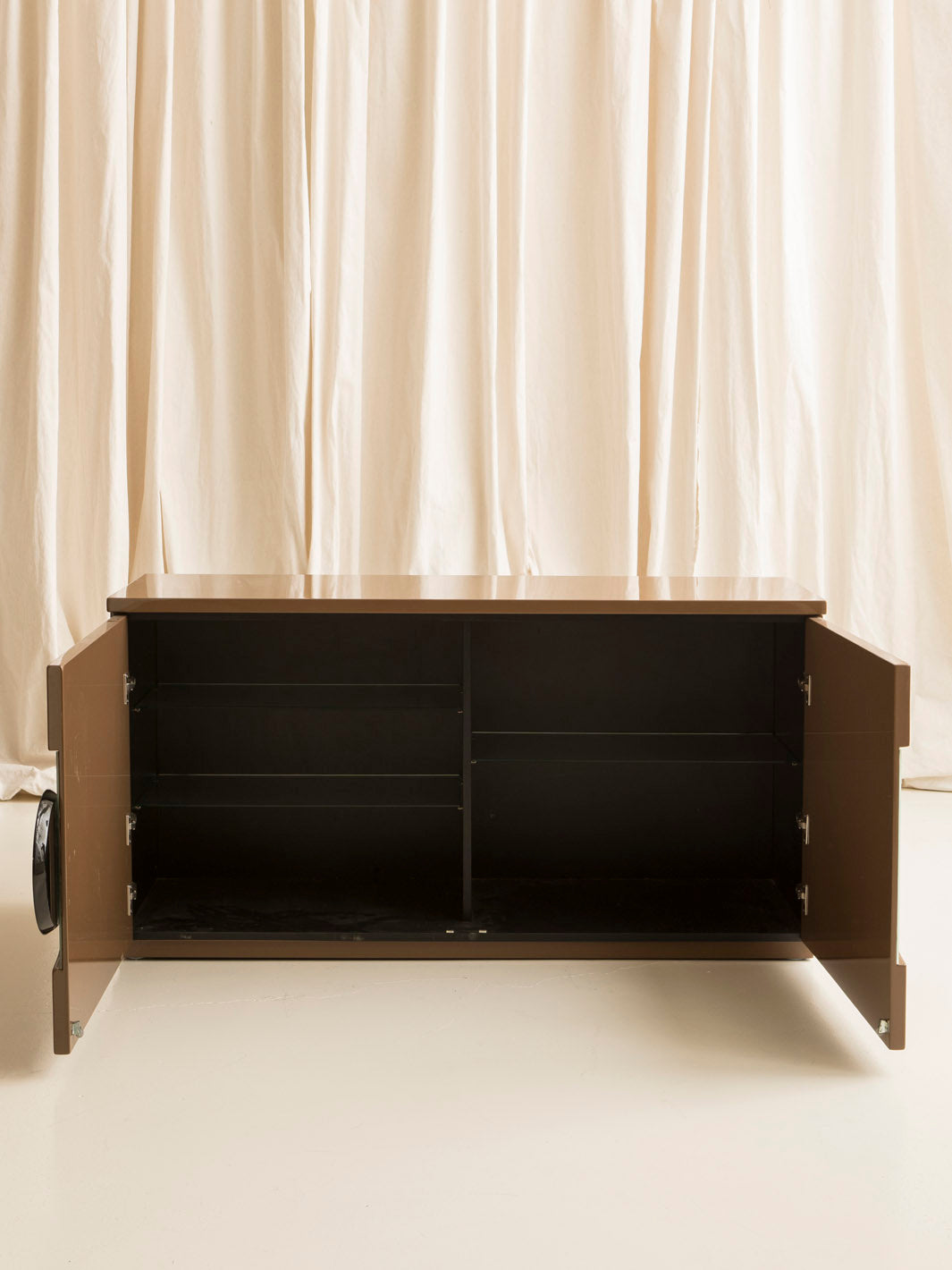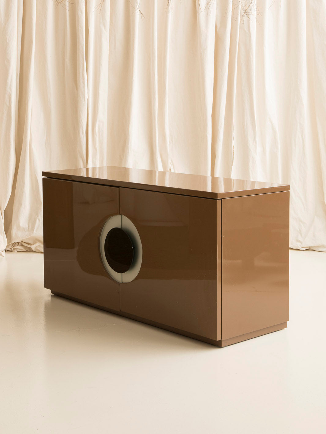 From the splendour and glamour of the 1970s comes this magnificent buffet by Maison Jansen. A stone-coloured lacquered sideboard with a distinctive front featuring a decorative black sphere. Its interior is lined with glass. The use of different high-quality materials makes this piece a real eye-catcher.