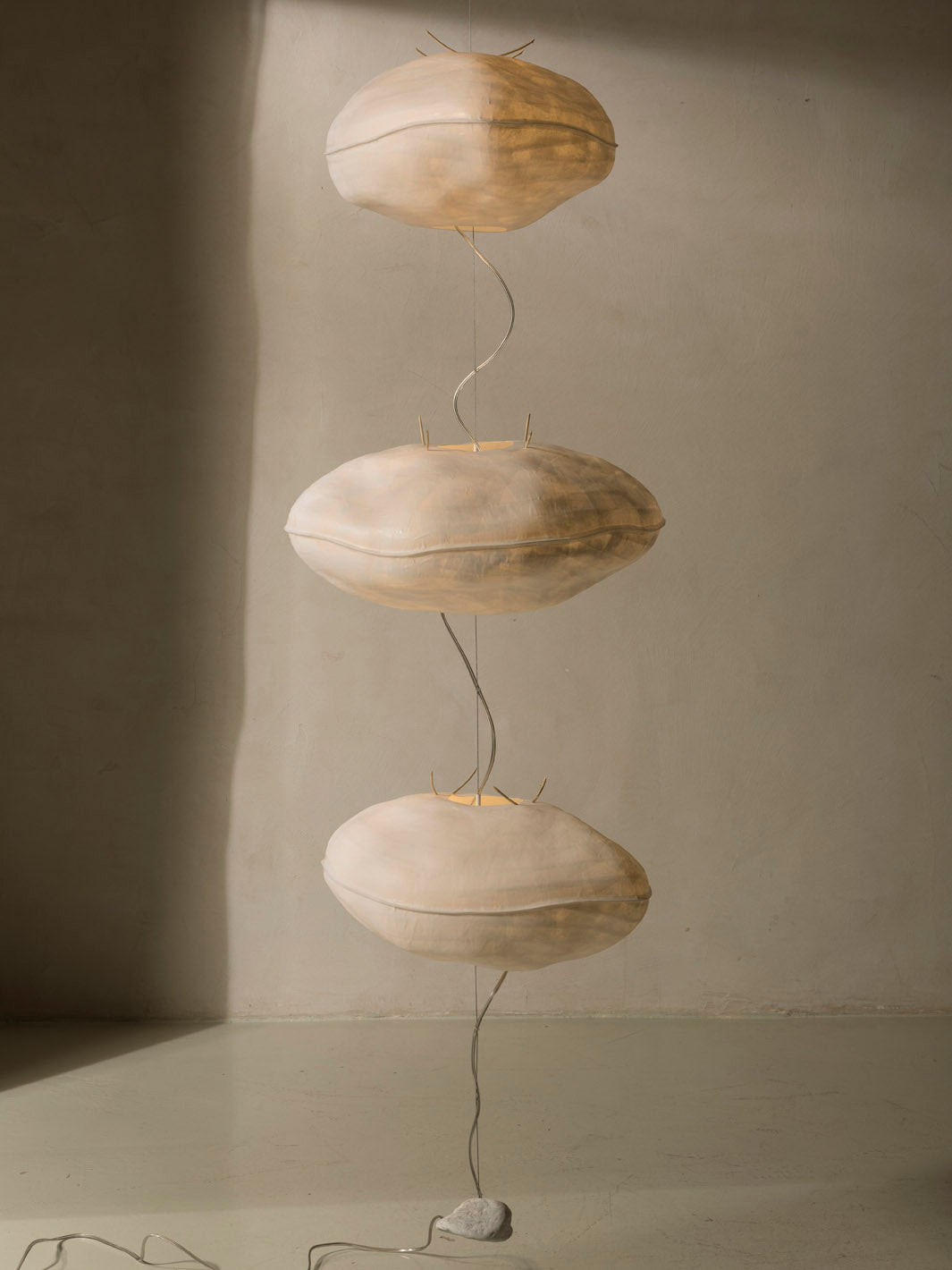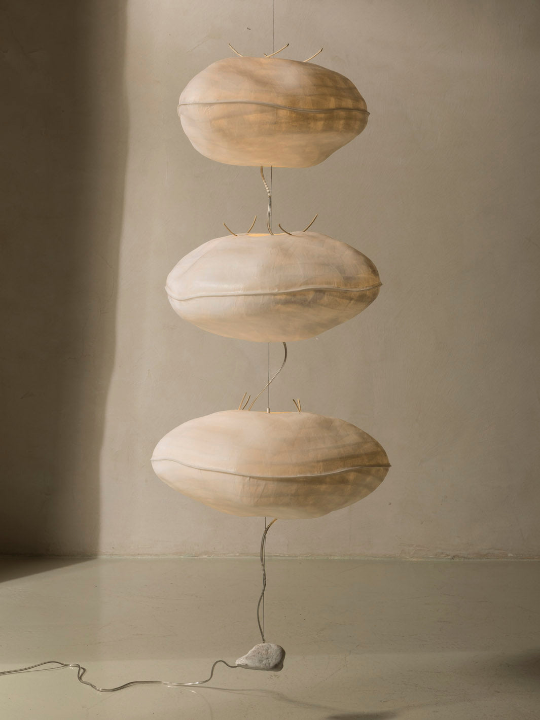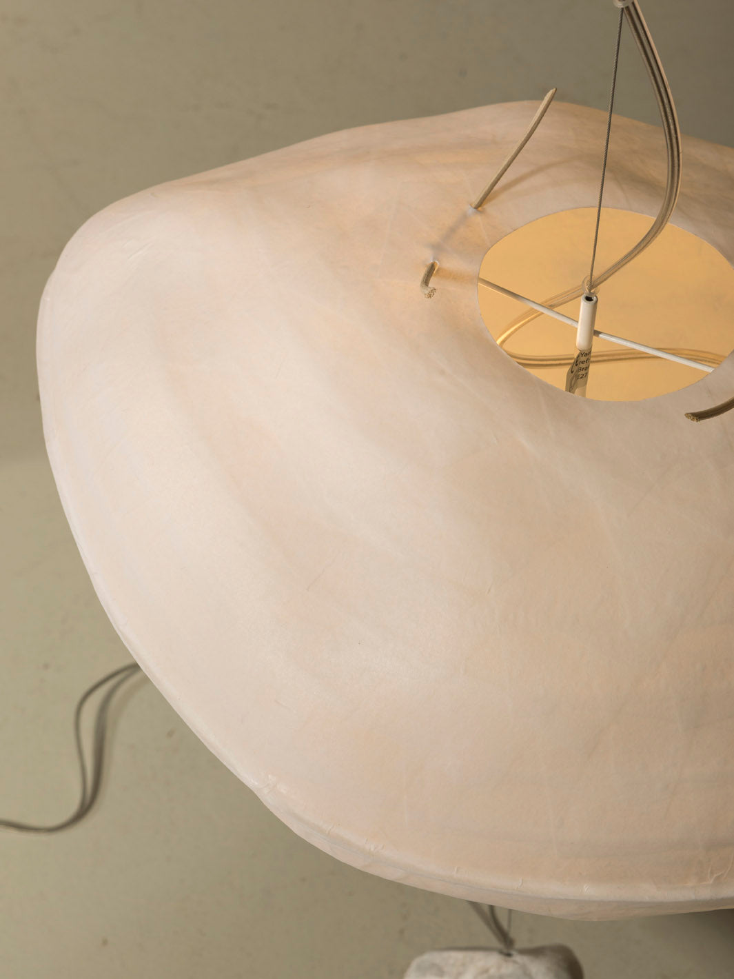 Handmade Japanese paper ceiling lamp with white marble stone. Two connection options are available: direct to the ceiling or plug-in.