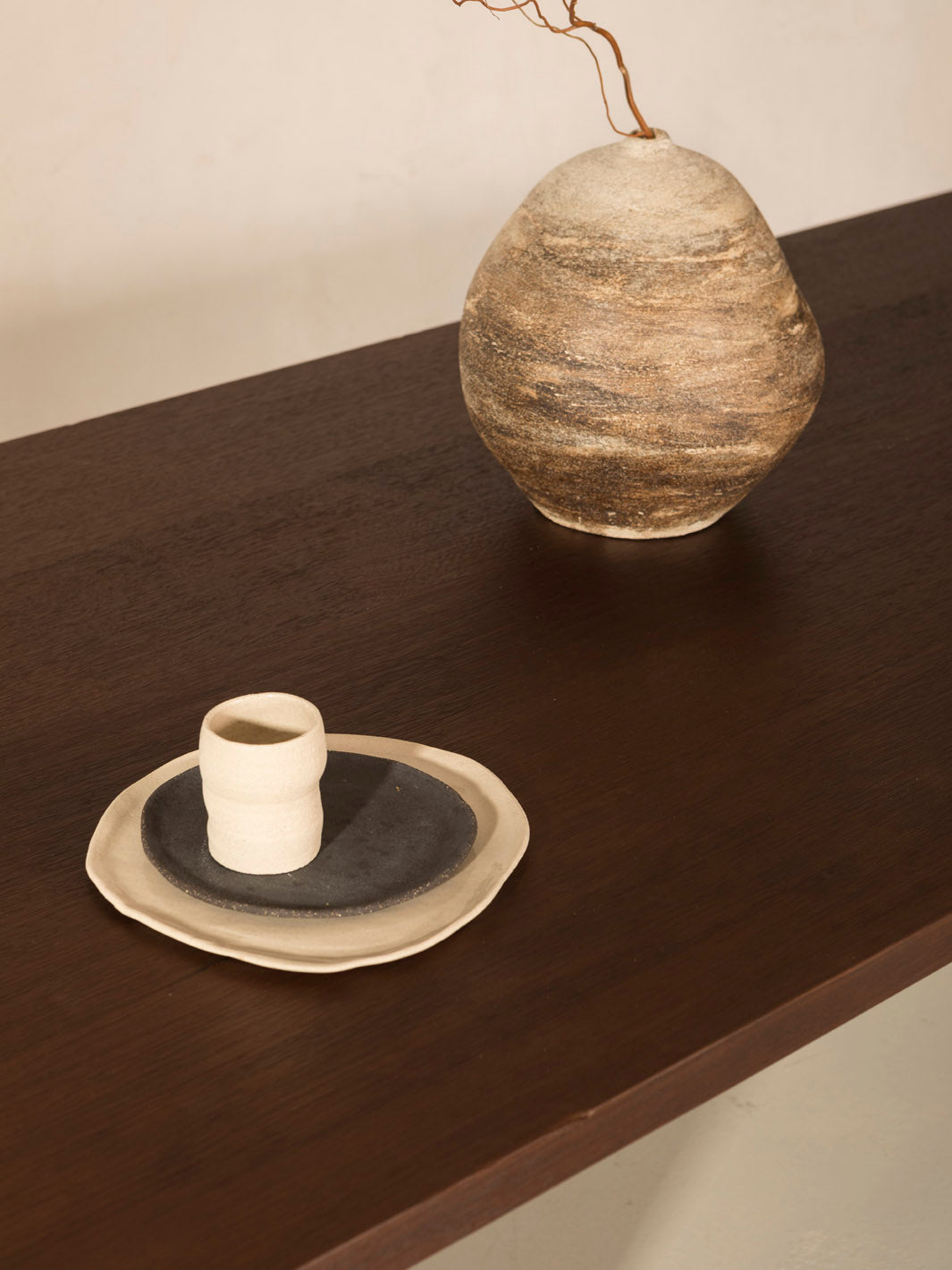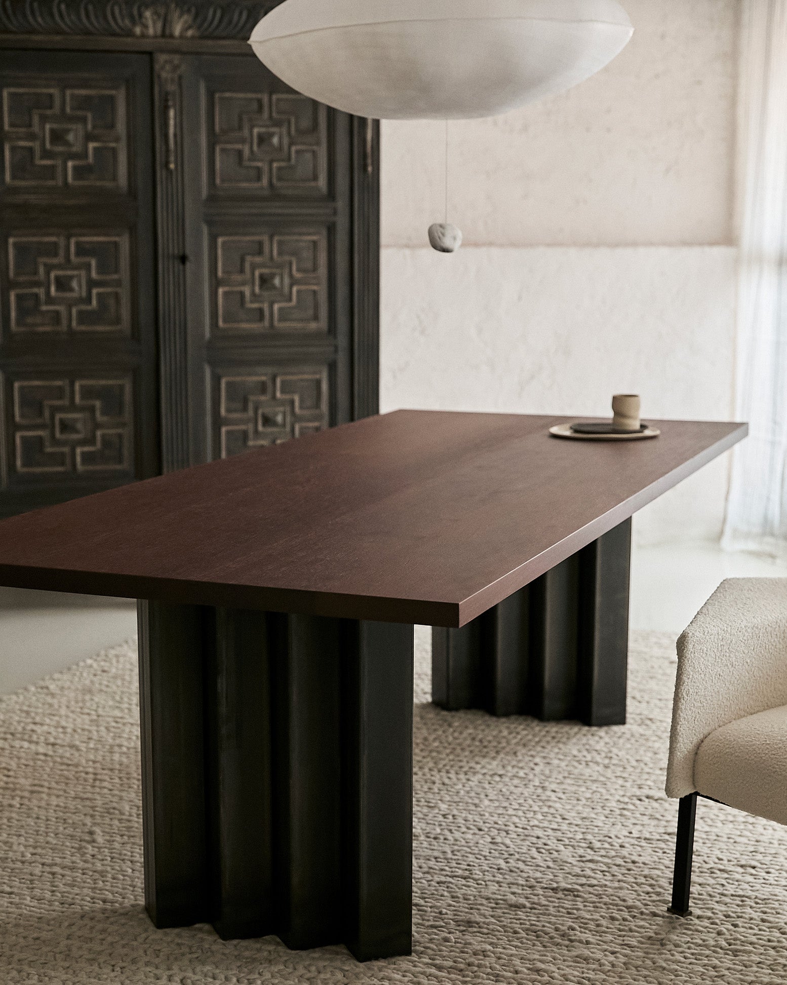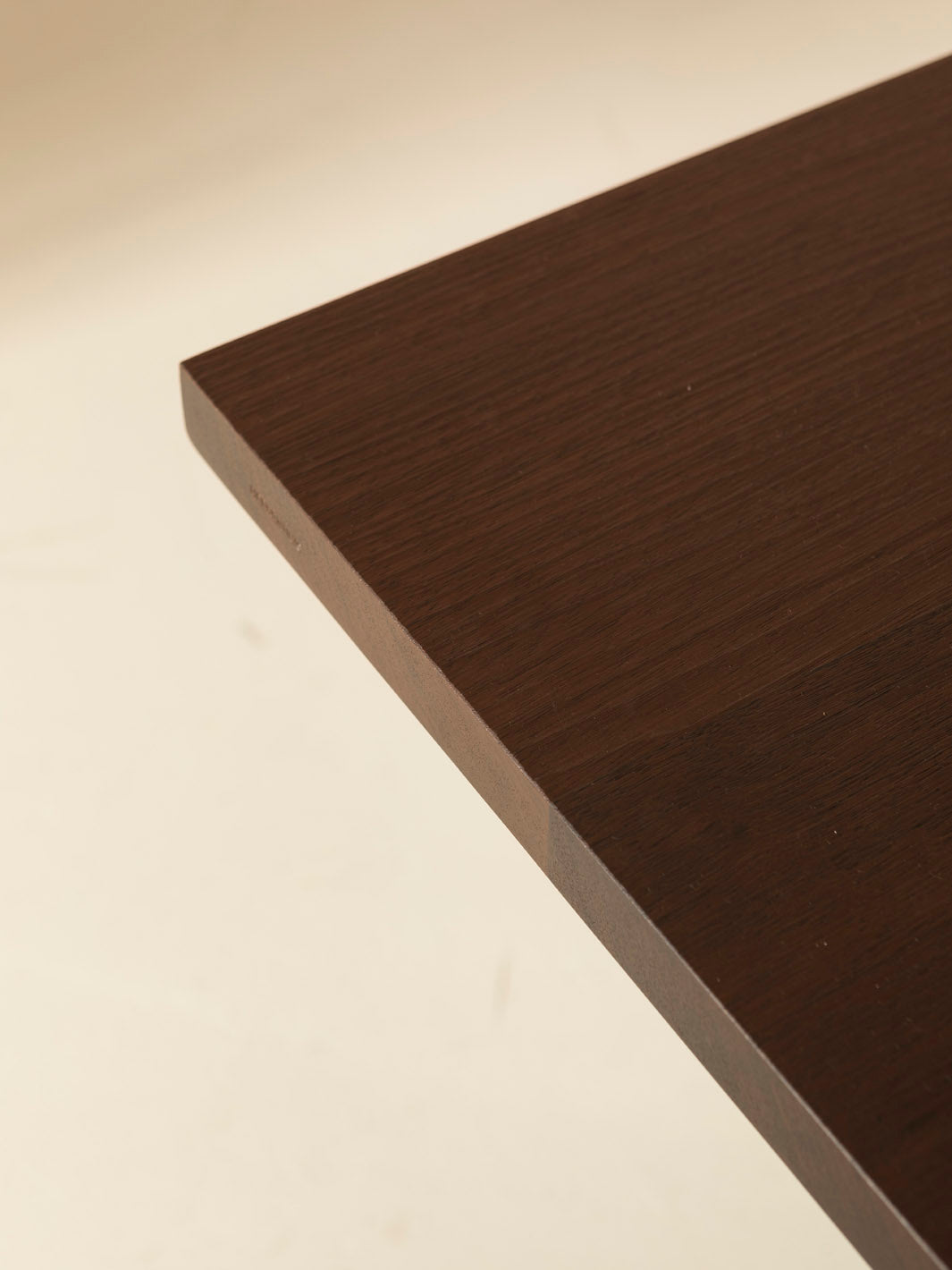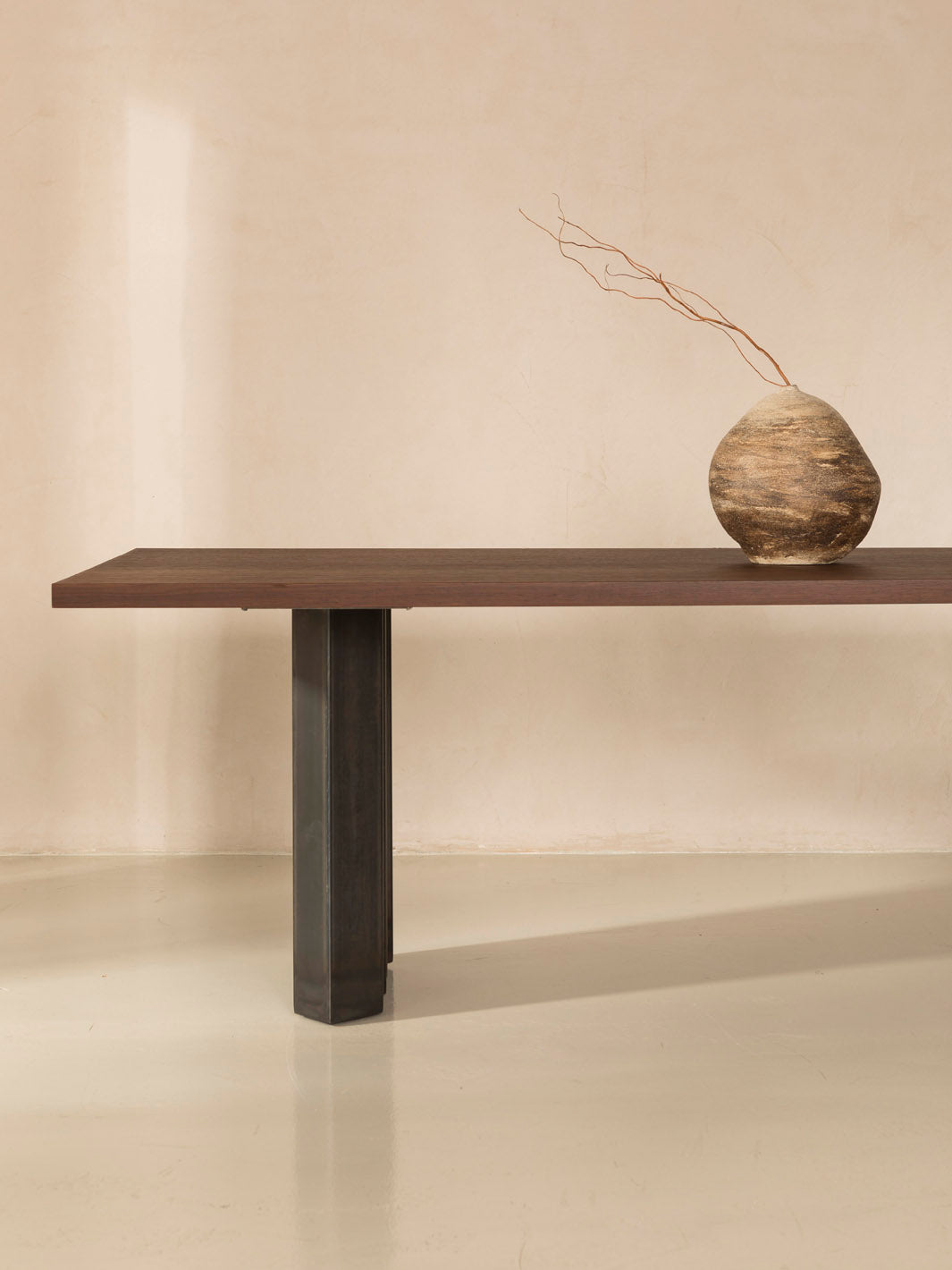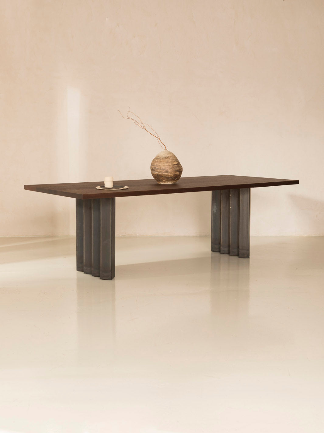 Original Belgian dining table, made of fraké thermowood and two metal legs. The wood has been treated with clear varnish. The base only received a coat of metallic wax to protect it from corrosion, leaving all imperfections visible.