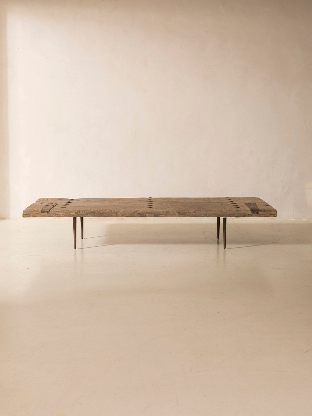 Antique elm wood door from the beginning of the century, originally from China, mounted on hammered iron feet.