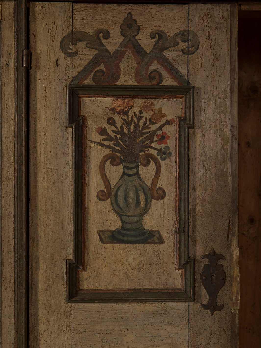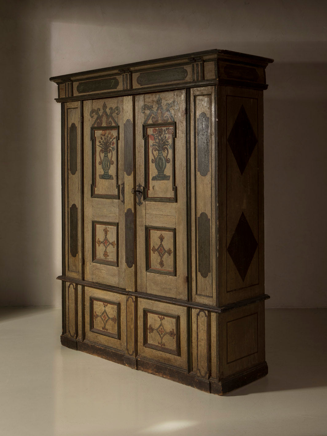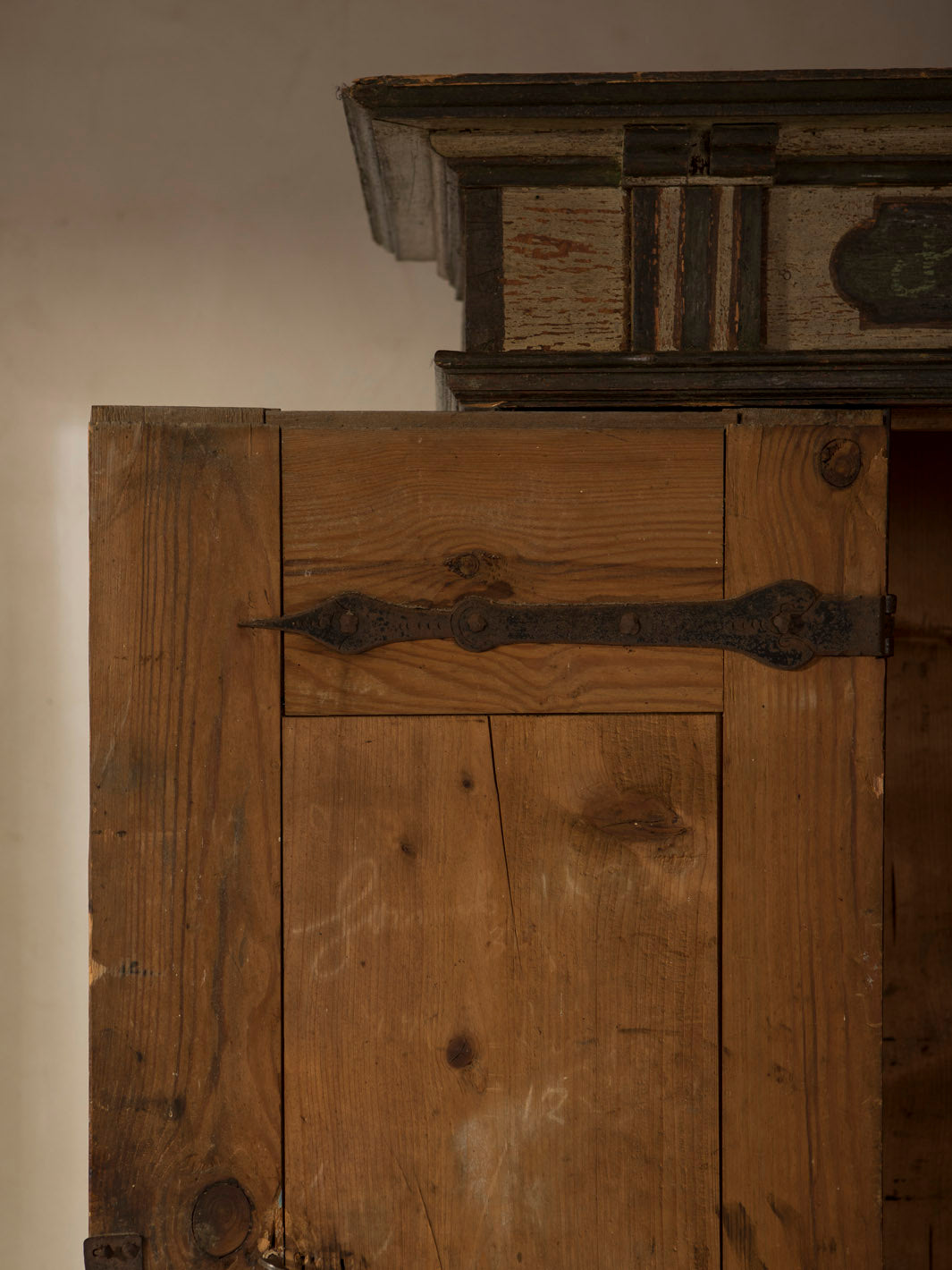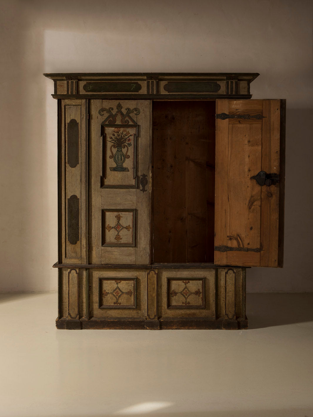 Armario Alsaciano trabajado en madera de abeto patinada original del siglo XIX. Ornamentación floral y geométrica pintada a mano.