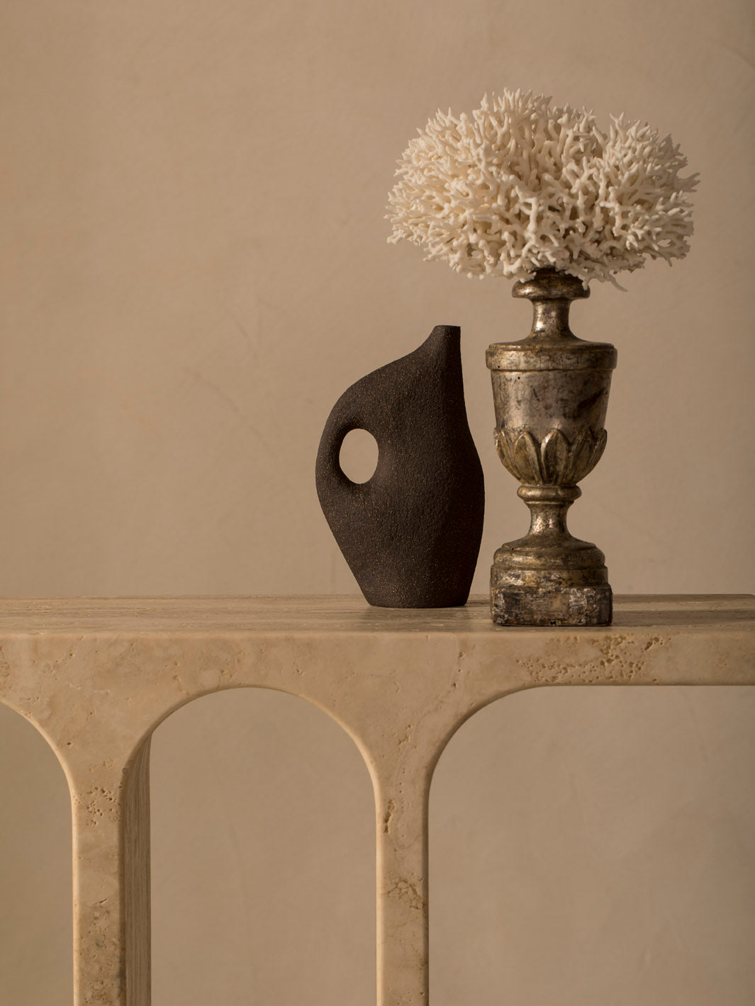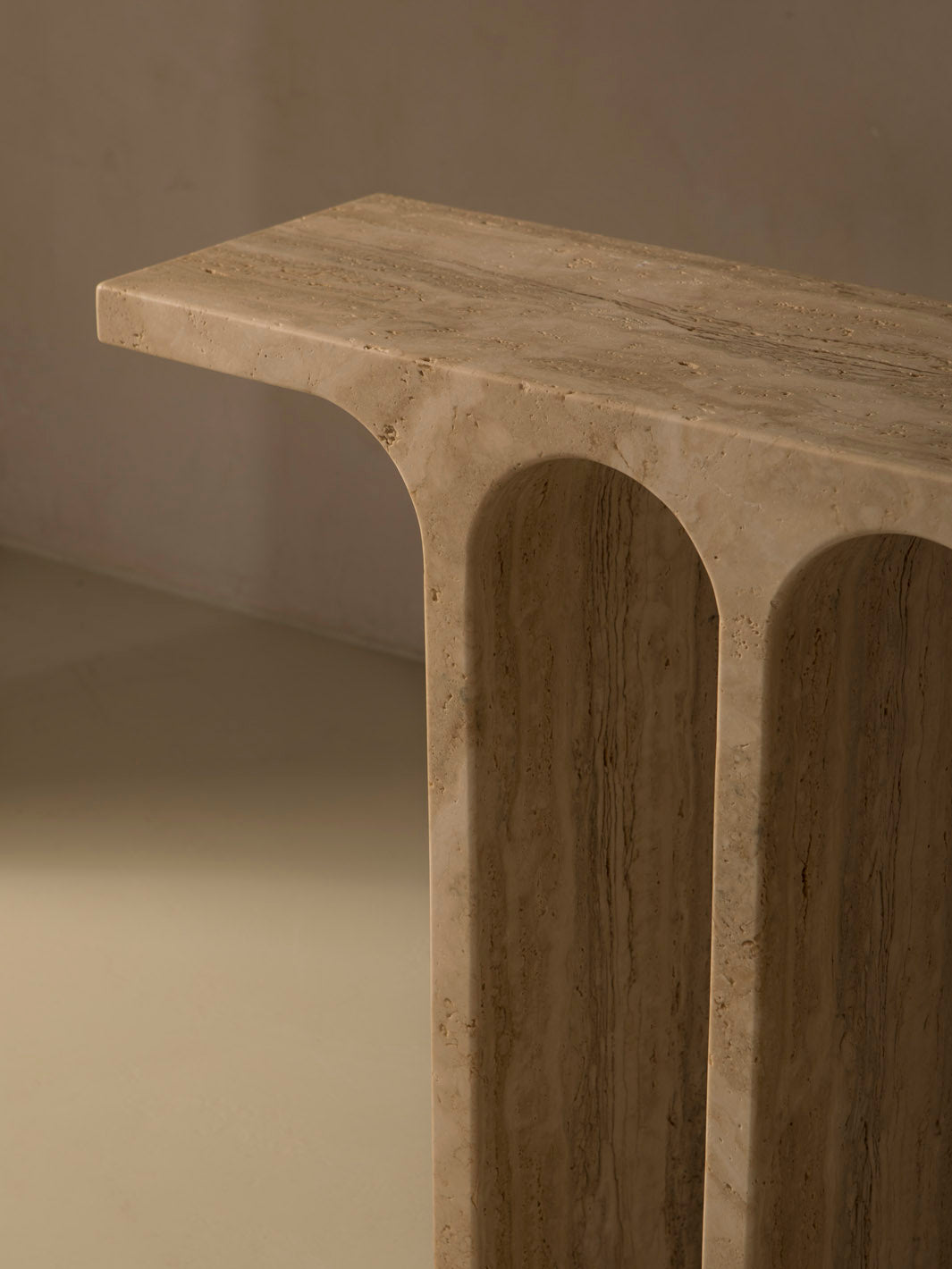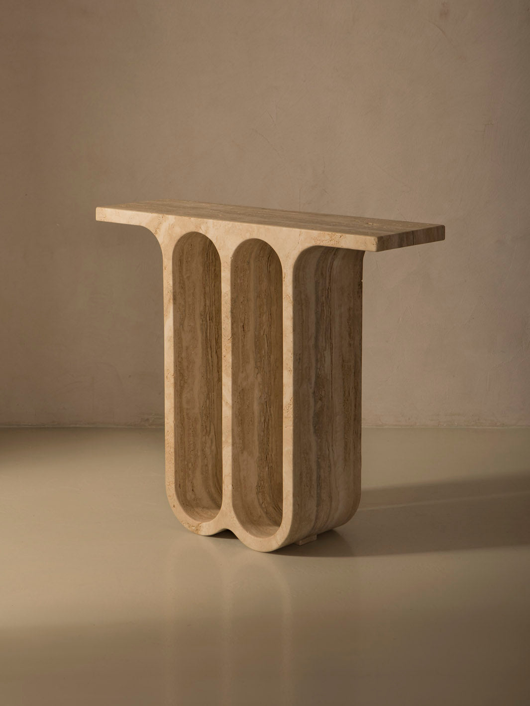 Consola escultórica realizada en mármol travertino, donde la pureza del material se combina con un diseño arquitectónico de líneas suaves y proporciones equilibradas. Su base presenta dos arcos verticales que evocan formas clásicas reinterpretadas en clave contemporánea, aportando ligereza visual y carácter escultórico a la pieza.