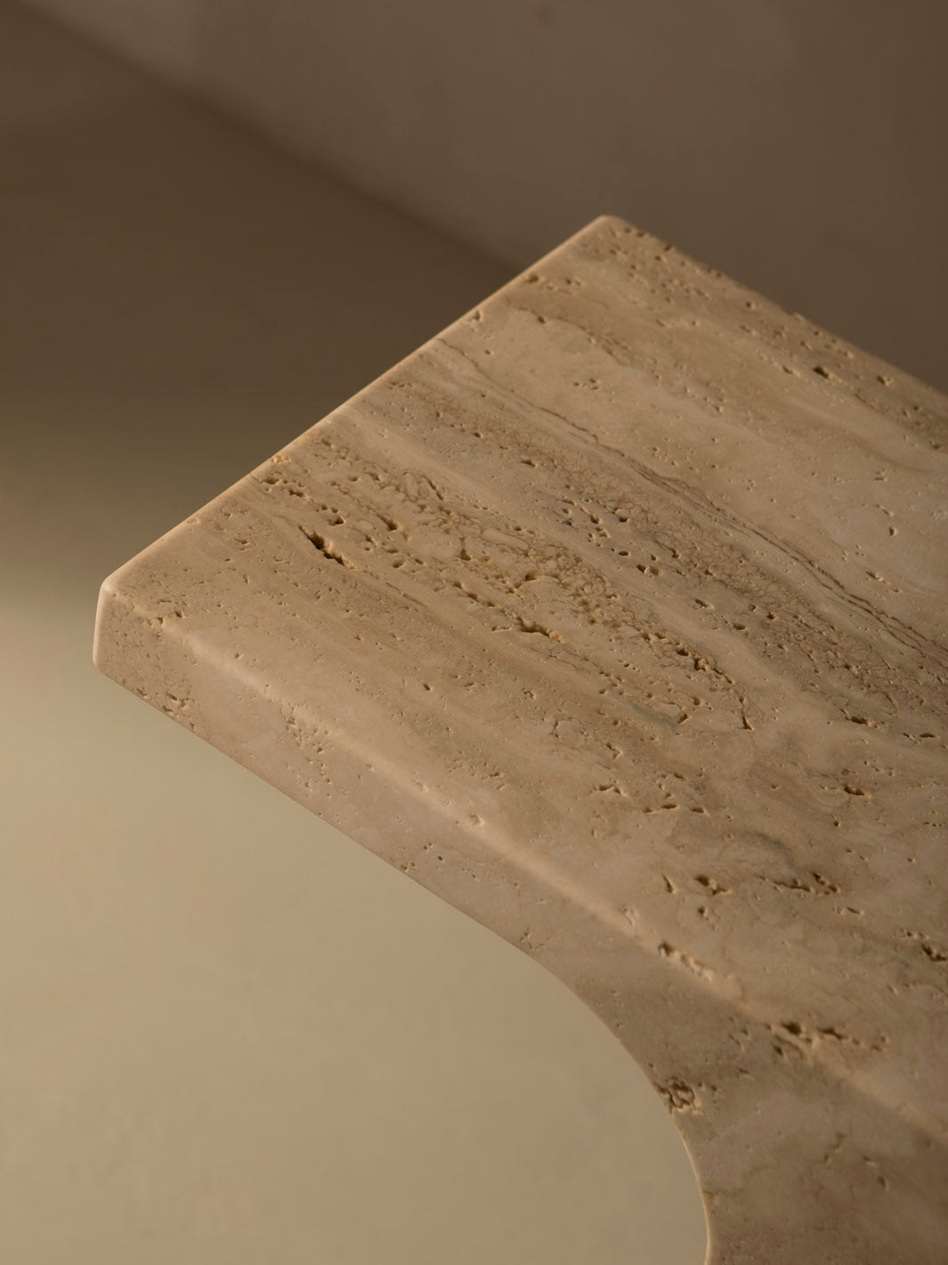 Tallada en una sola pieza de travertino, cada consola es única gracias a las vetas, poros y matices naturales propios de la piedra. El tablero superior, de líneas limpias y bordes suavemente redondeados, contrasta con la estructura rítmica de la base.