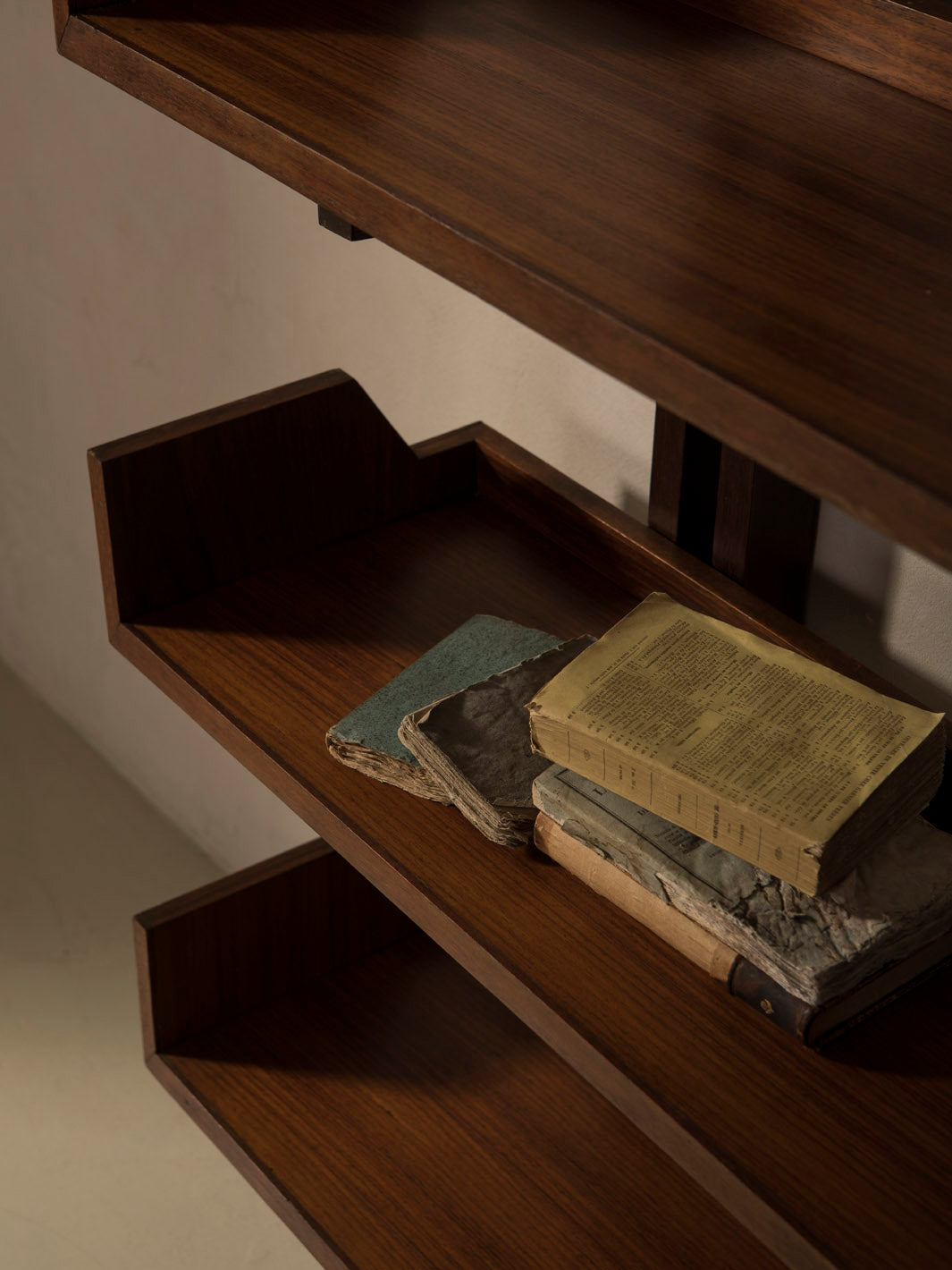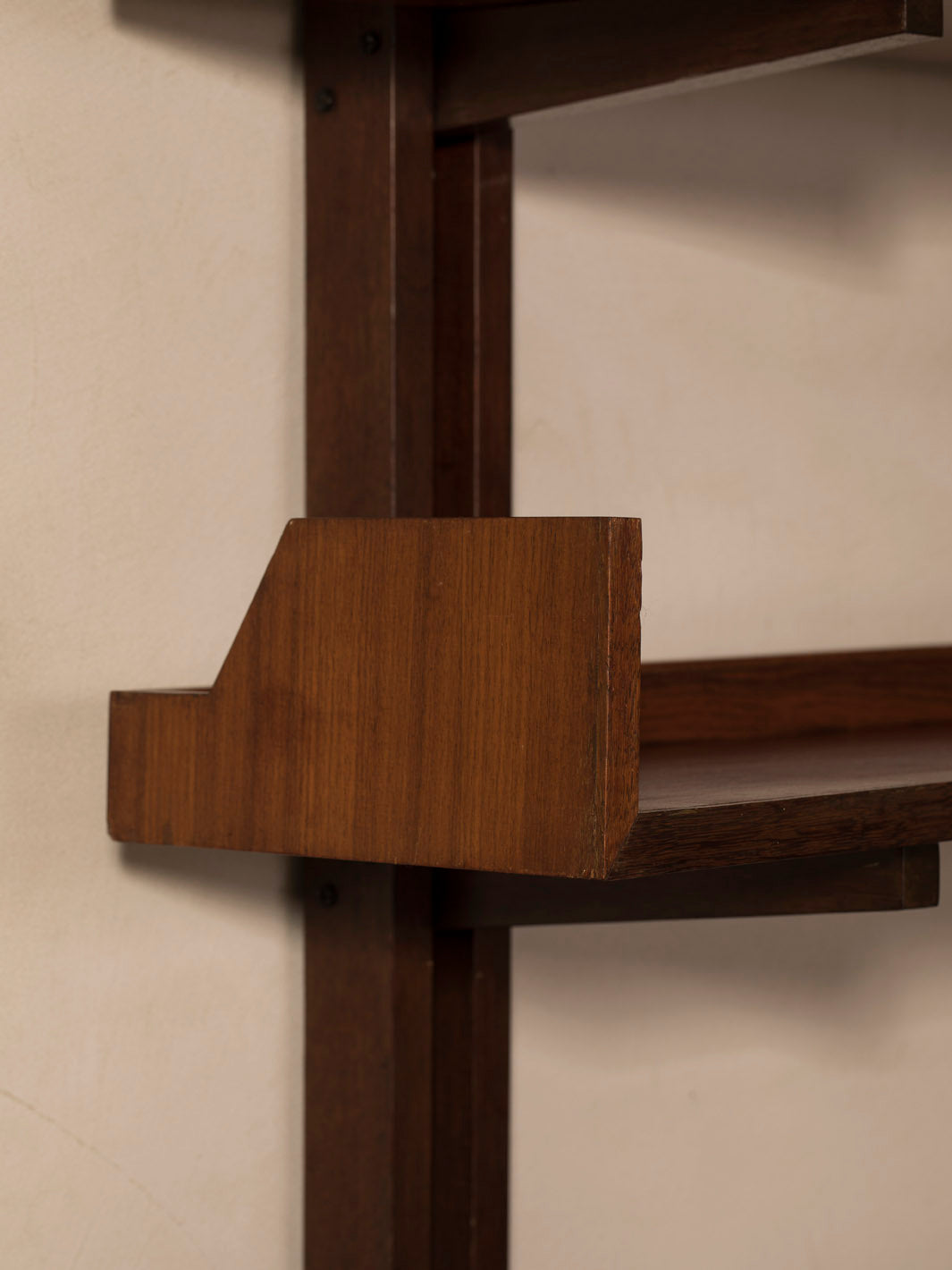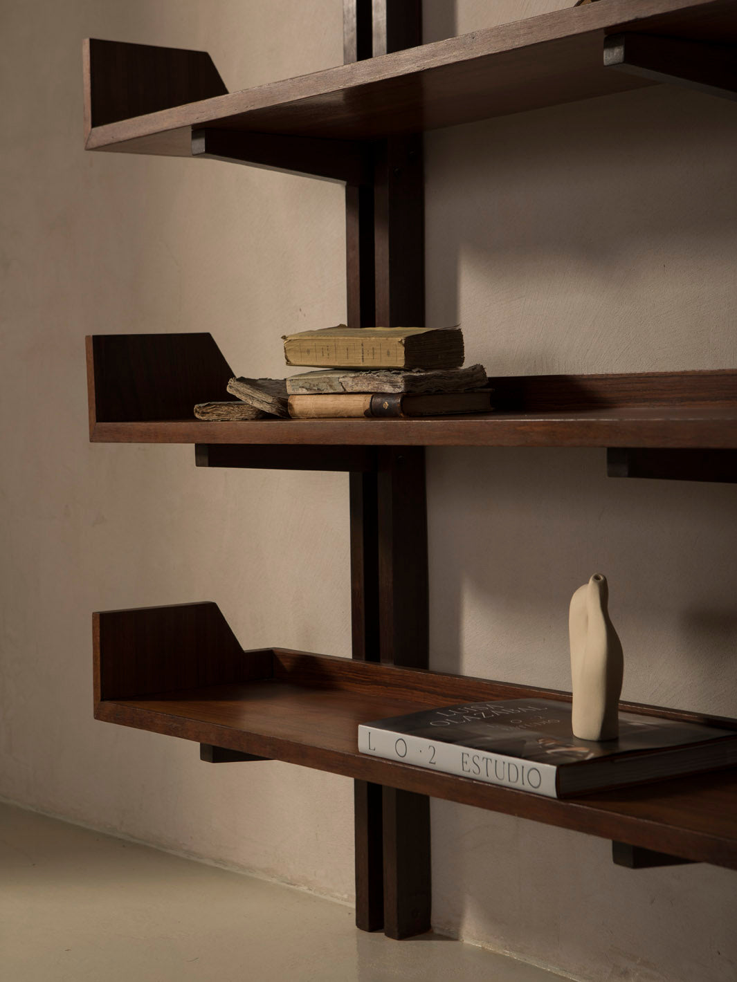 Librería mural italiana de los años 60 realizada en madera maciza de teca, que destaca por su diseño arquitectónico y equilibrado. Su estructura vertical con montantes dobles sostiene una serie de baldas horizontales con laterales elevados, creando un juego de líneas limpias y repetitivas muy característico del diseño moderno de mediados de siglo.