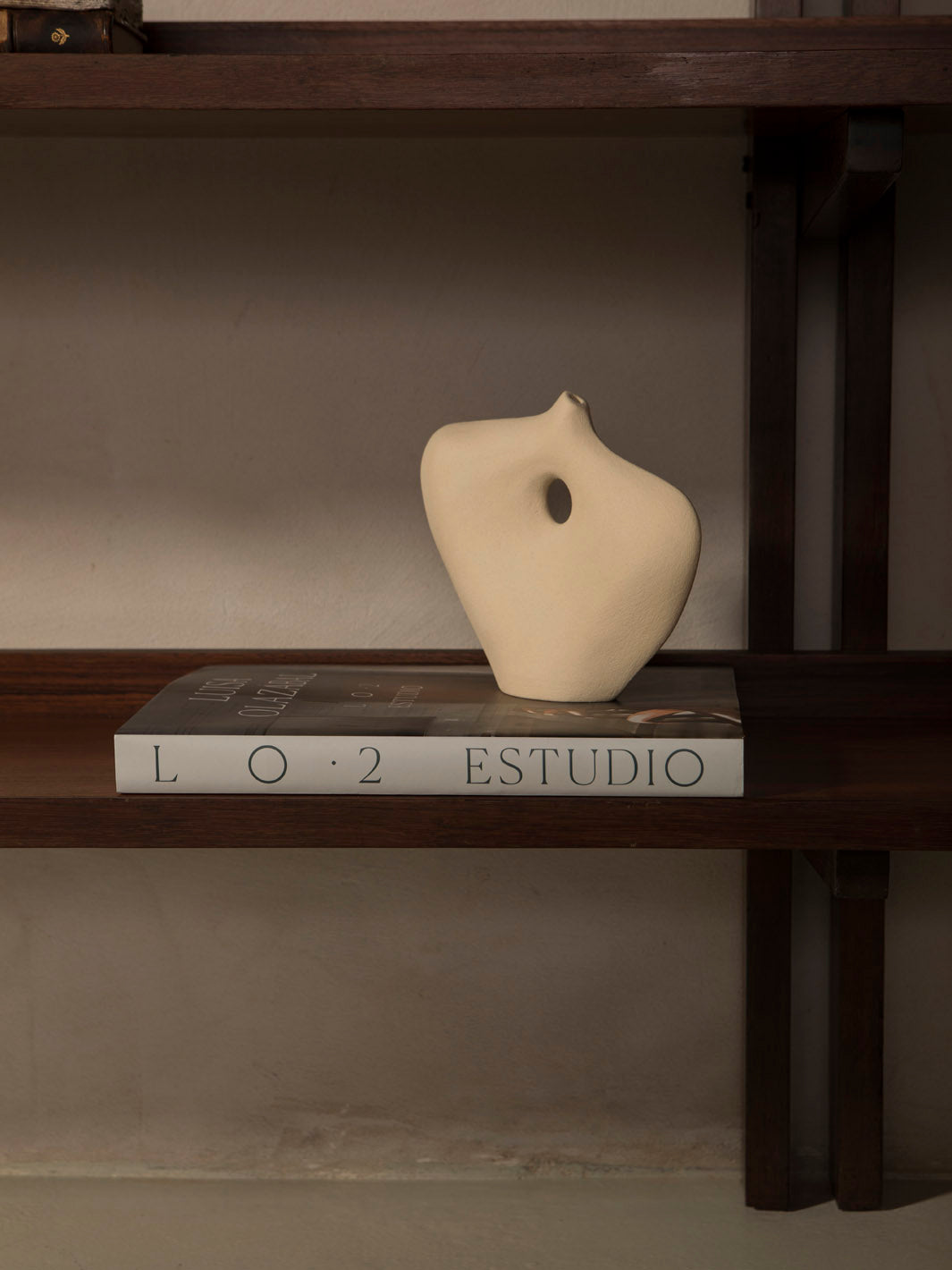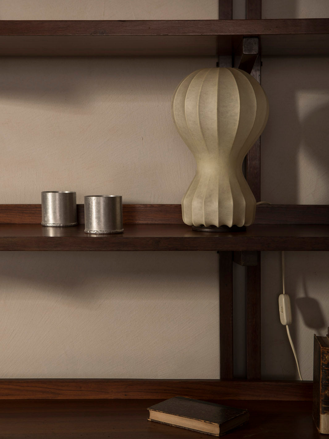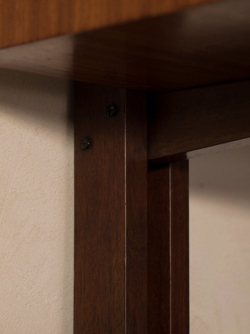 Librería mural italiana de los años 60 realizada en madera maciza de teca, que destaca por su diseño arquitectónico y equilibrado. Su estructura vertical con montantes dobles sostiene una serie de baldas horizontales con laterales elevados, creando un juego de líneas limpias y repetitivas muy característico del diseño moderno de mediados de siglo.