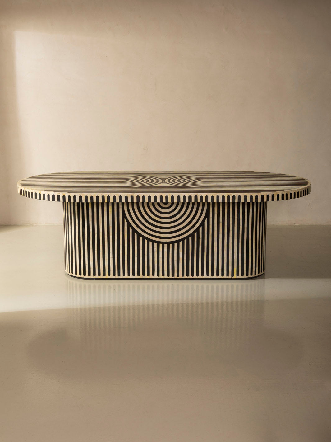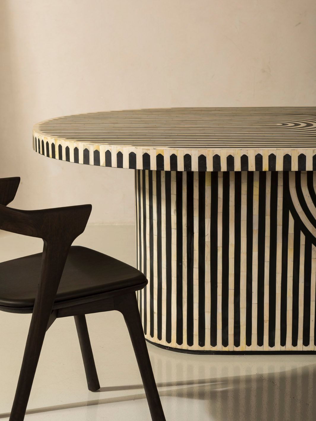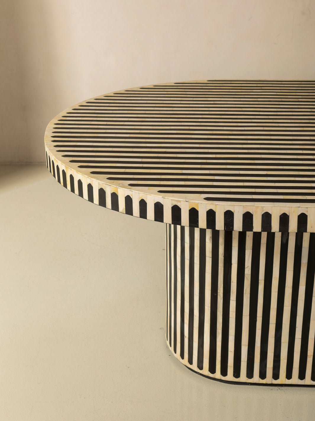 Moroccan handcrafted oval dining table worked on an olive wood base, covered with a meticulous bone and resin marquetry technique.