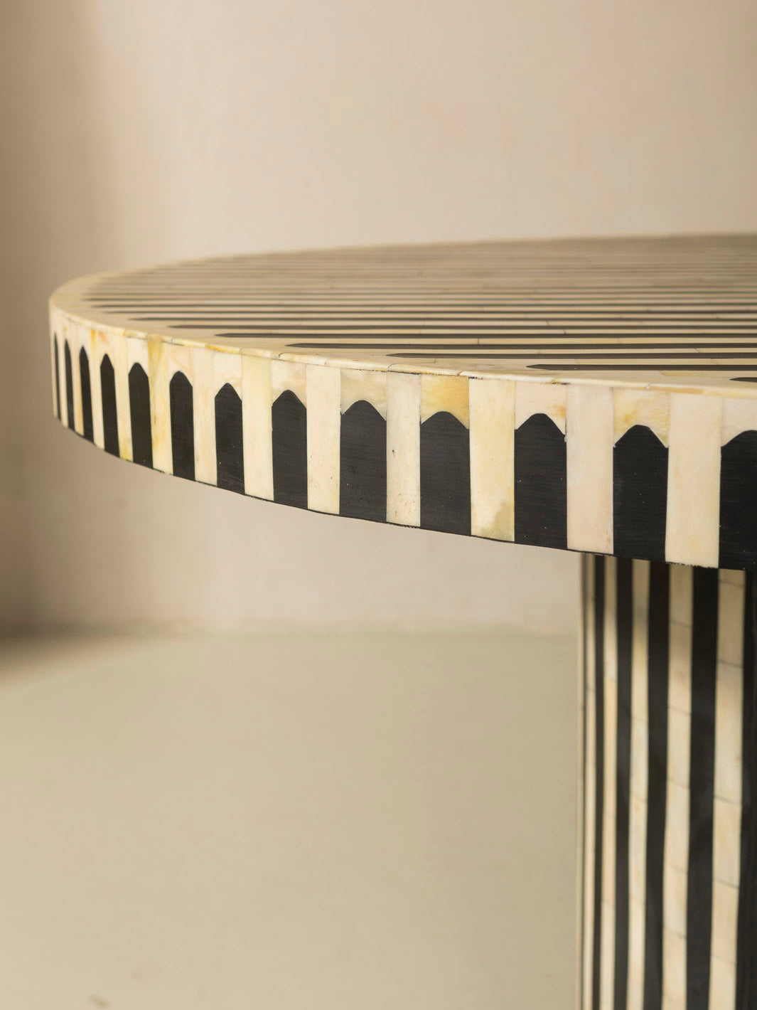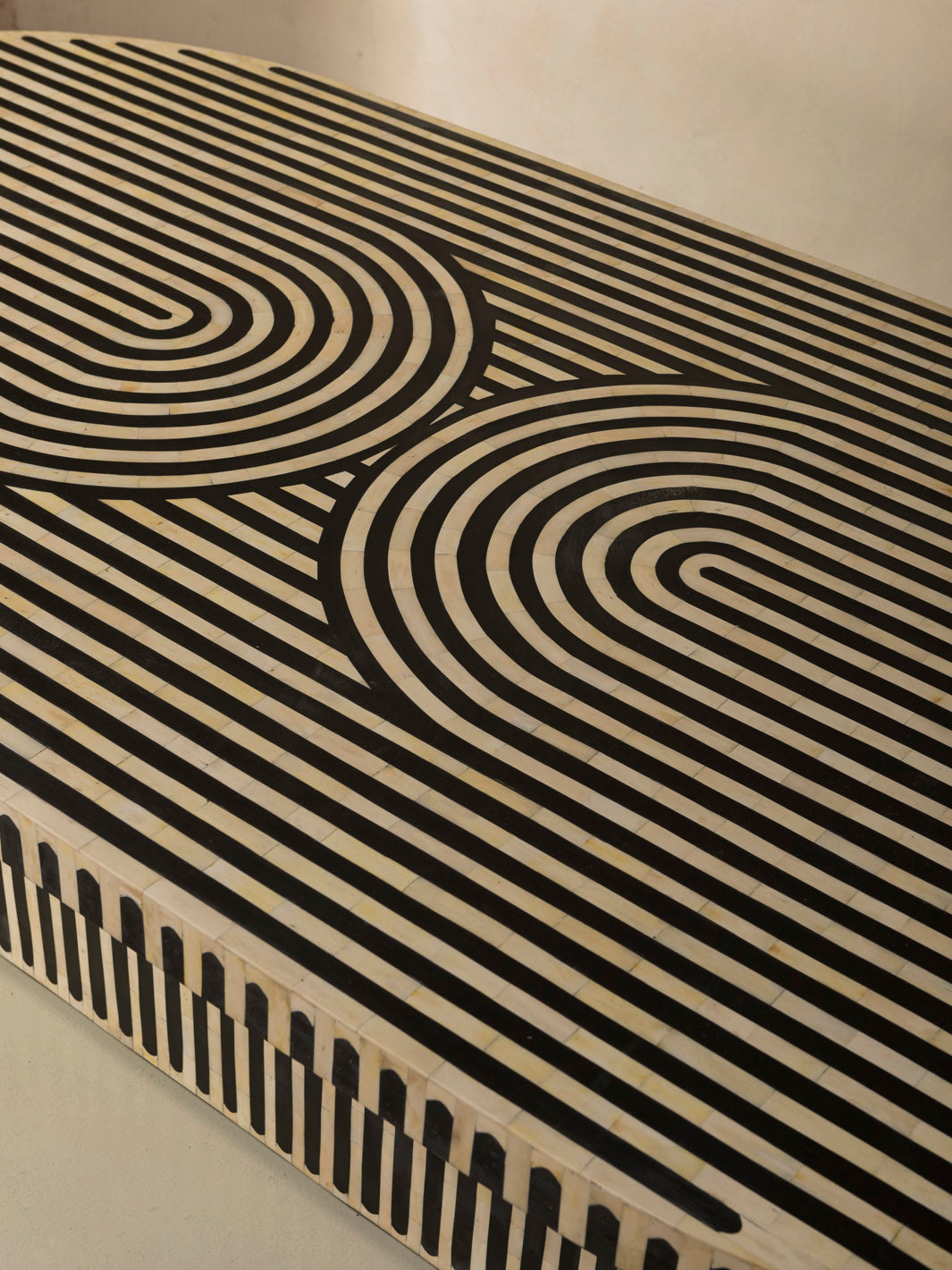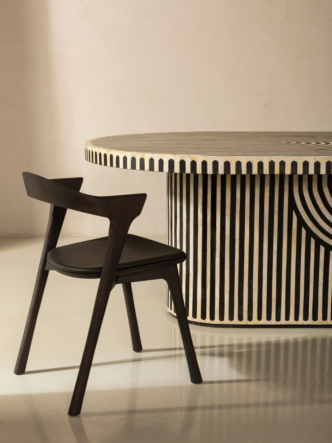 Moroccan handcrafted oval dining table worked on an olive wood base, covered with a meticulous bone and resin marquetry technique.