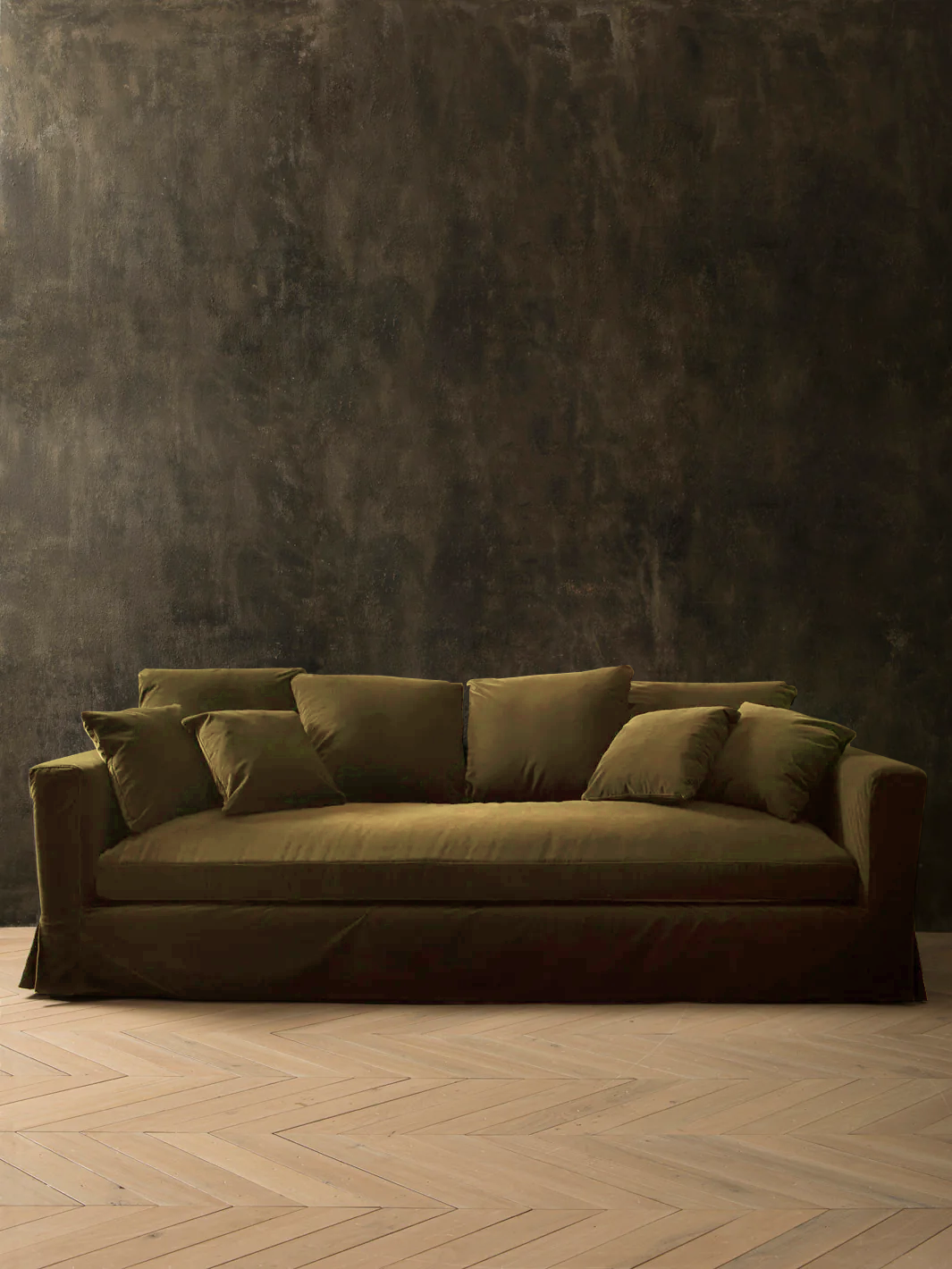 The Omaanda sofa is the perfect combination of sophistication and casualness. Its sweeping design, multiple cushions, and low frame convey a relaxed elegance, ideal for those seeking a sofa with presence but without rigidity. Its velvet upholstery adds depth and visual richness, while its long skirt and generous cushions reinforce its sophisticated yet cozy feel.