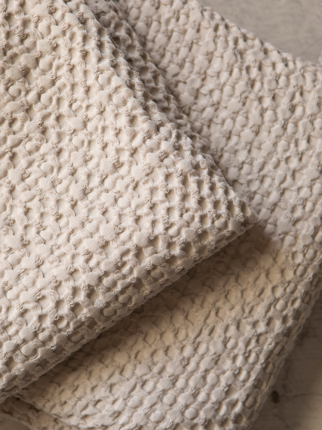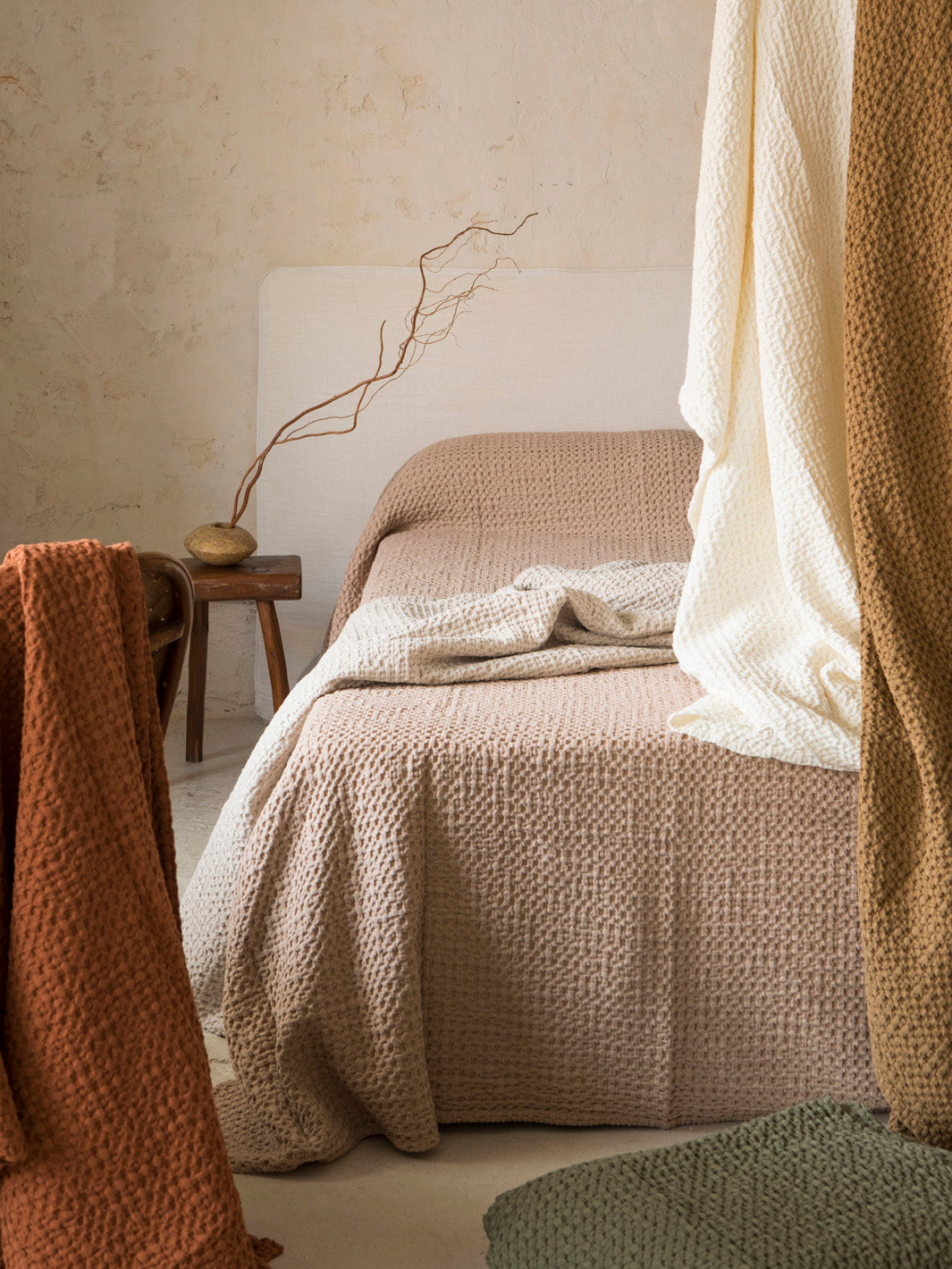 Colcha en panal de abeja de algodón 100% en color lino natural. Una colcha atemporal para vestir la cama, el sofá o cualquier estancia.