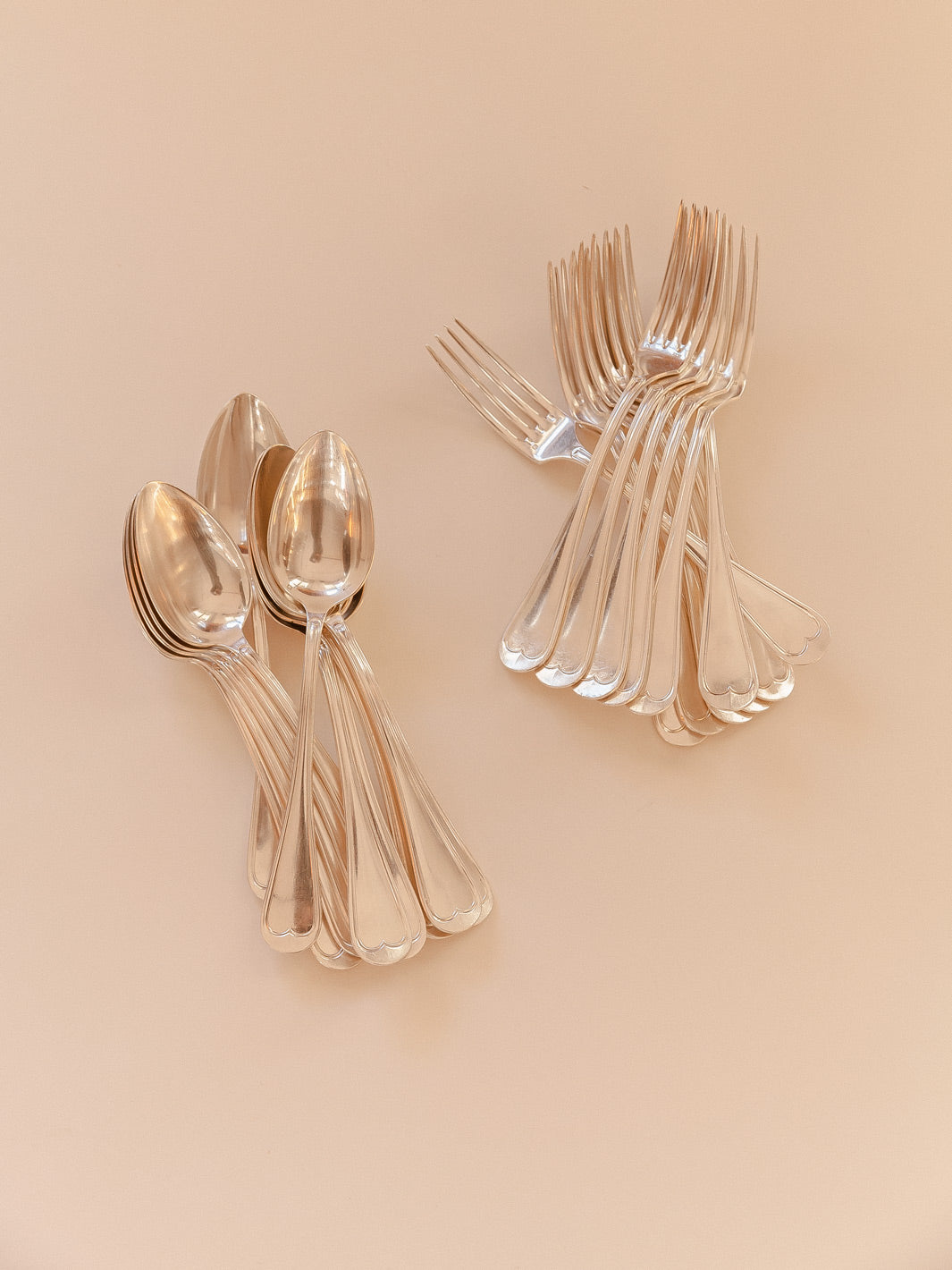 Entre los años 30 y 40, platerías como Christofle, Saint Médard, Boulanger y Ercuis, entre otras, cuando diseñaban sus cuberterías en plata plaza maciza, replicaban los modelos, y ofrecían los mismos diseños en versión baño de plata. Las mesas lucen exquisitas, con alma y con historia.