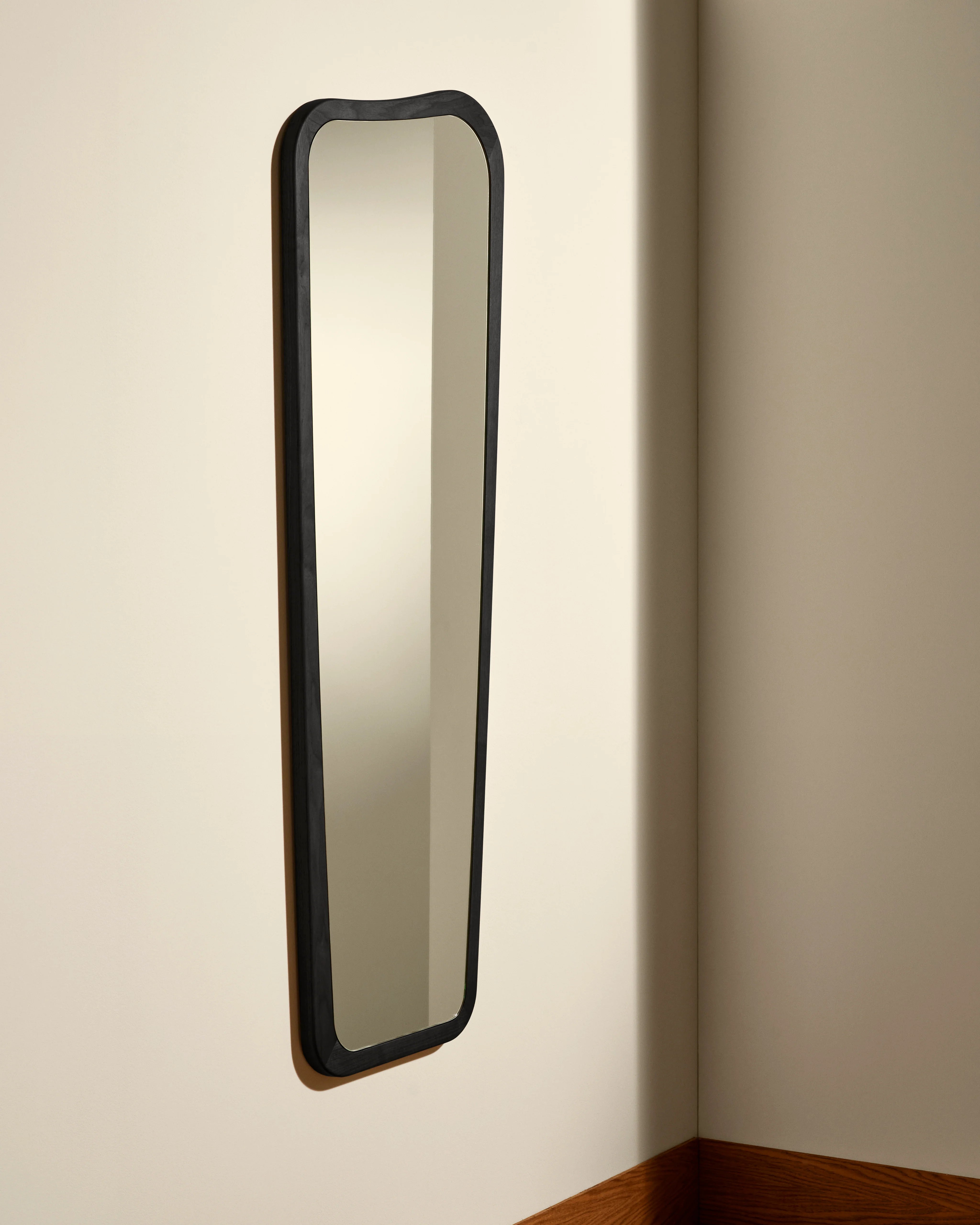 Espejo irregular con marco de madera de roble teñido de negro, viene preparado para colgar en la pared. Un guiño a los espejos de los años 50 y las formas orgánicas.